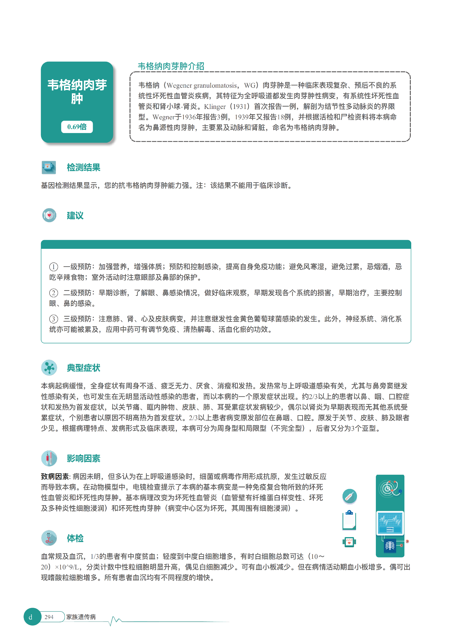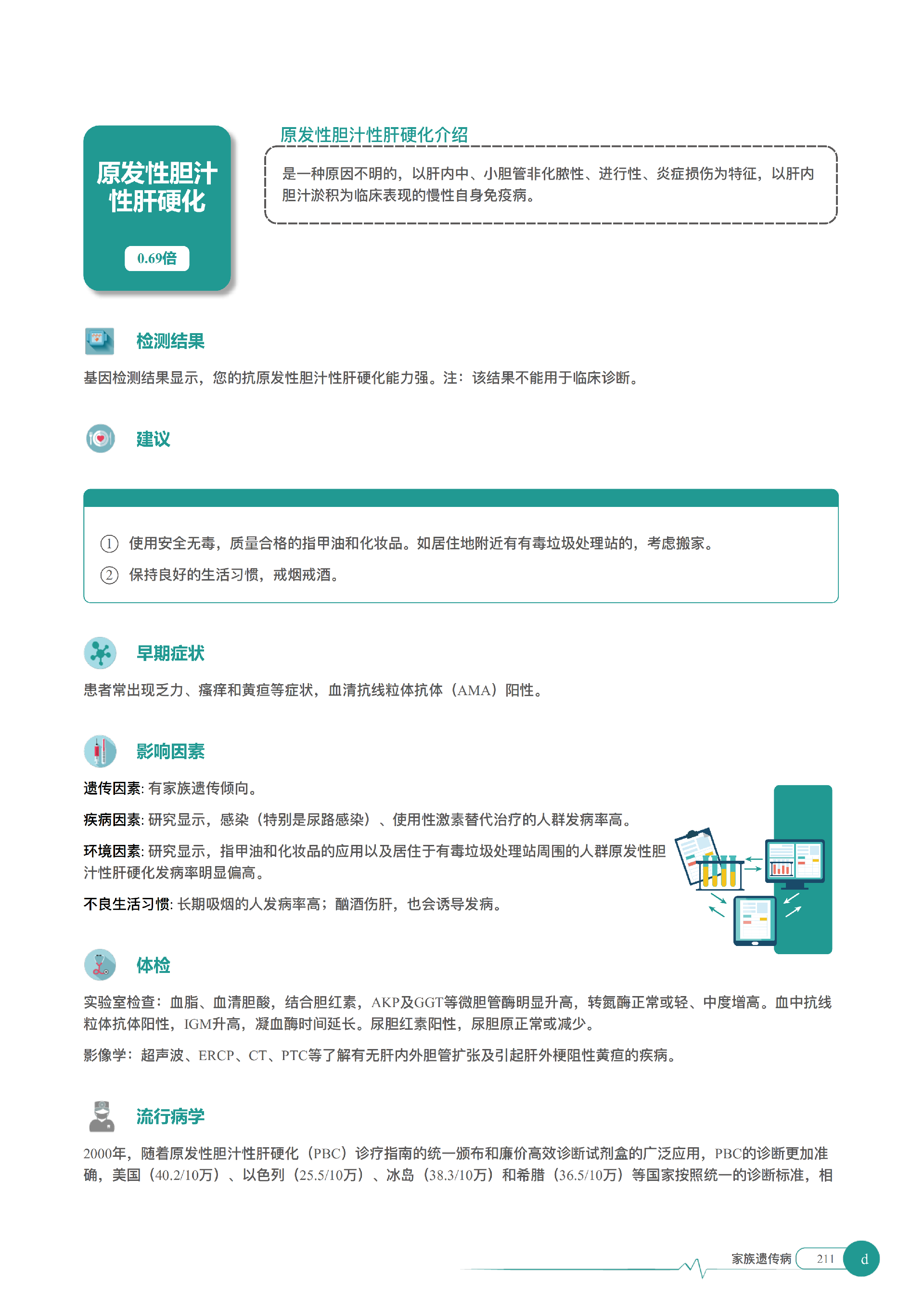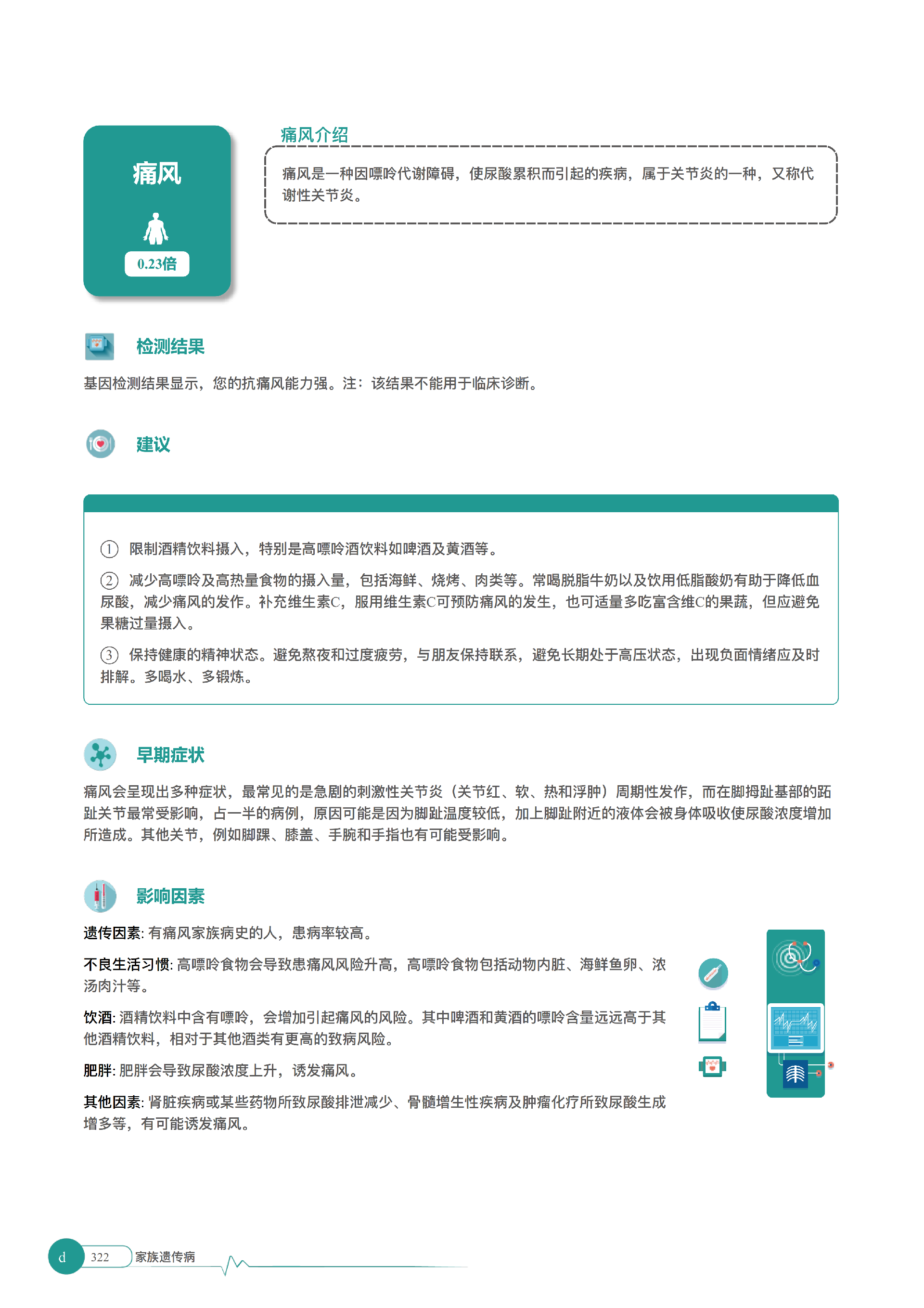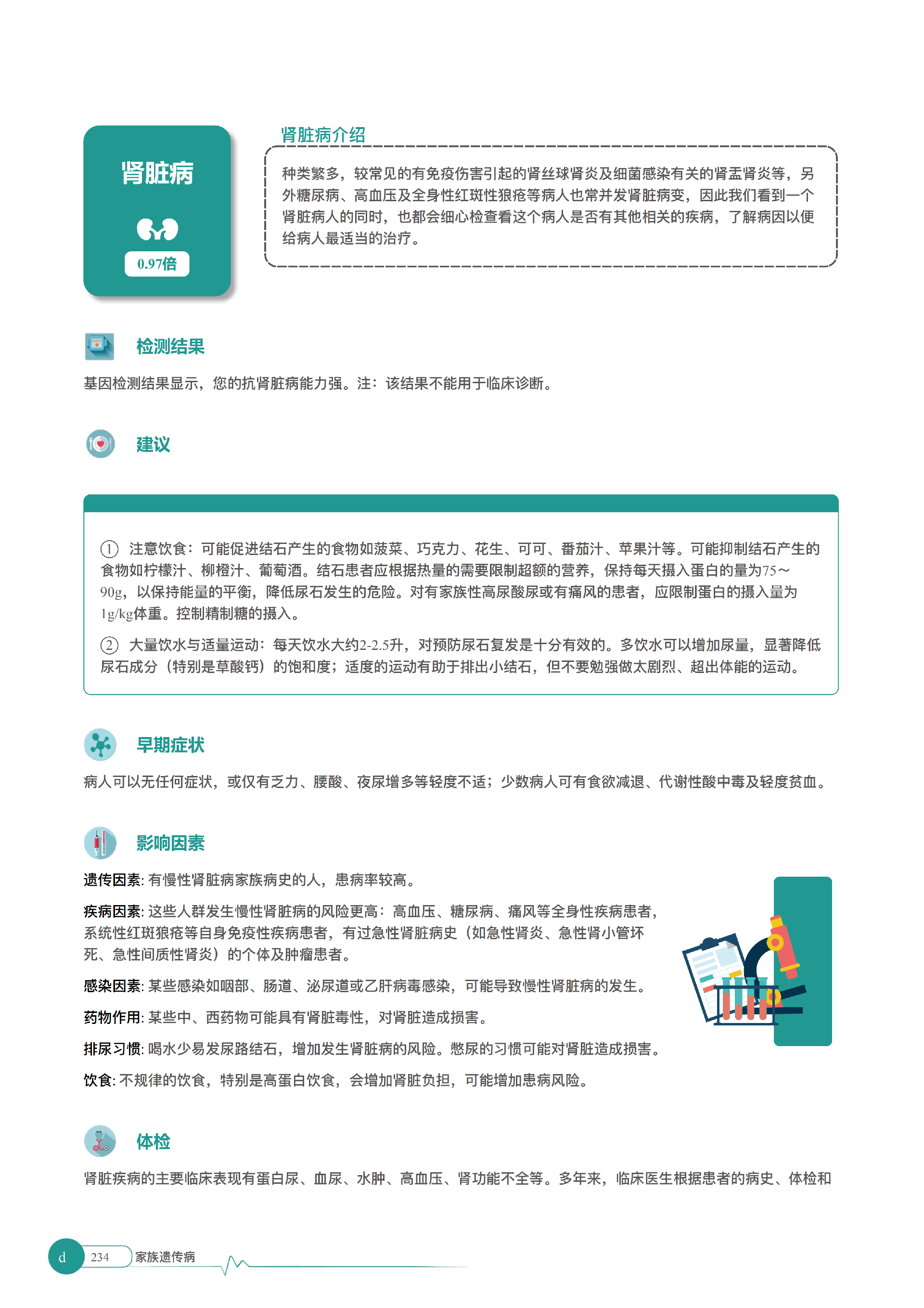 在核心的家族遗传风险筛查中,多项疾病风险值得重点关注:特发性膜性肾病(风险倍数 10.20 倍,终生患病率 10.20%)、老年性黄斑病变(9.92 倍,14.88%)的风险显著高于正常人群;掌腱膜挛缩症(7.19 倍)、非酒精性脂肪性肝病(4.90 倍)等疾病的遗传倾向亦需警惕;此外,静脉血栓栓塞(2.02 倍)、外周动脉病变(1.97 倍)等循环系统疾病,以及睡眠脚动症(2.38 倍)、妥瑞症(1.82 倍)等神经系统疾病,其风险也高于平均水平。风险倍数高于 1 代表患病概率超常人,低于 1 则更具抗病优势,需注意的是,风险高低不代表必然发病,仍需结合环境、生活习惯等因素综合判断。