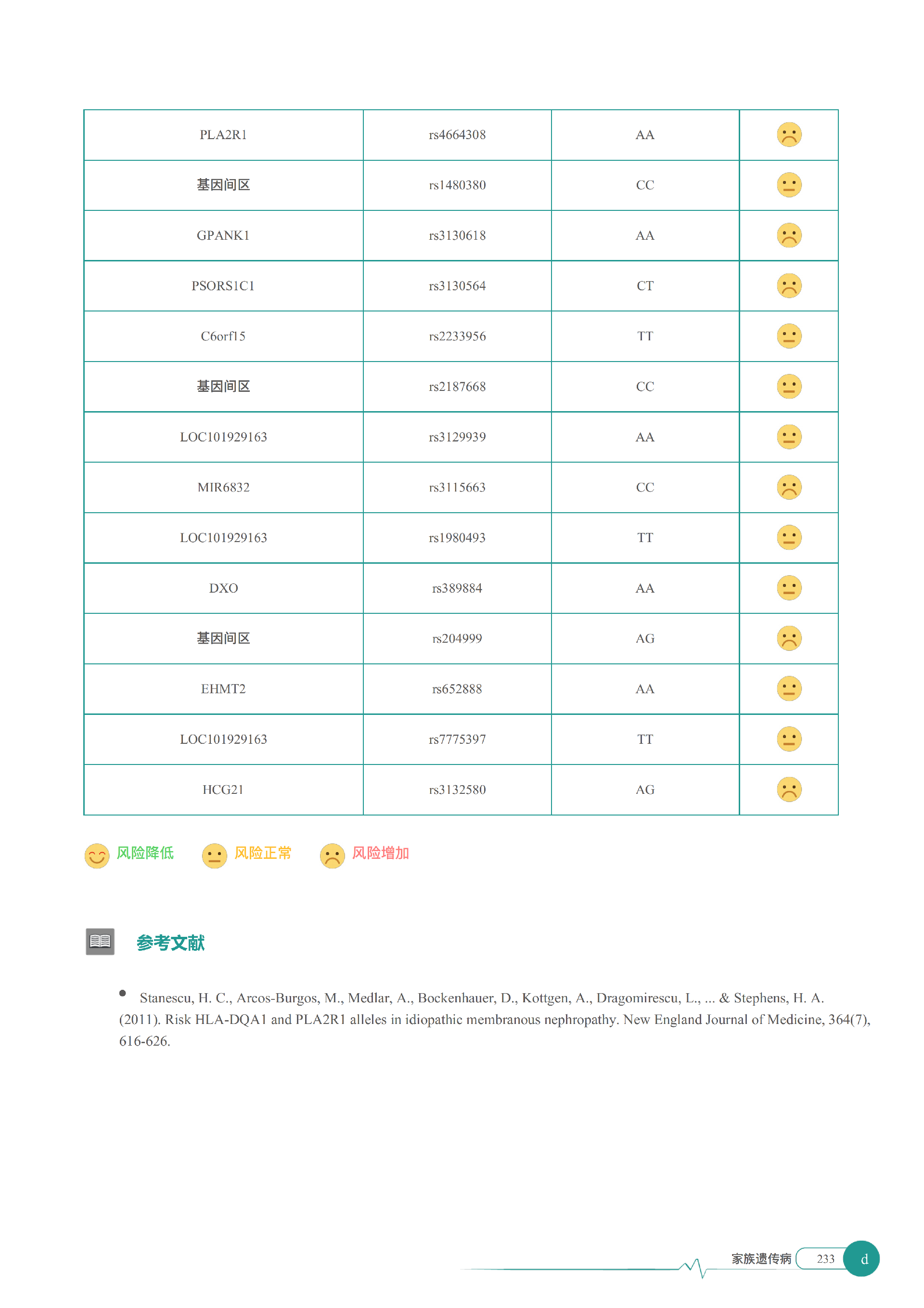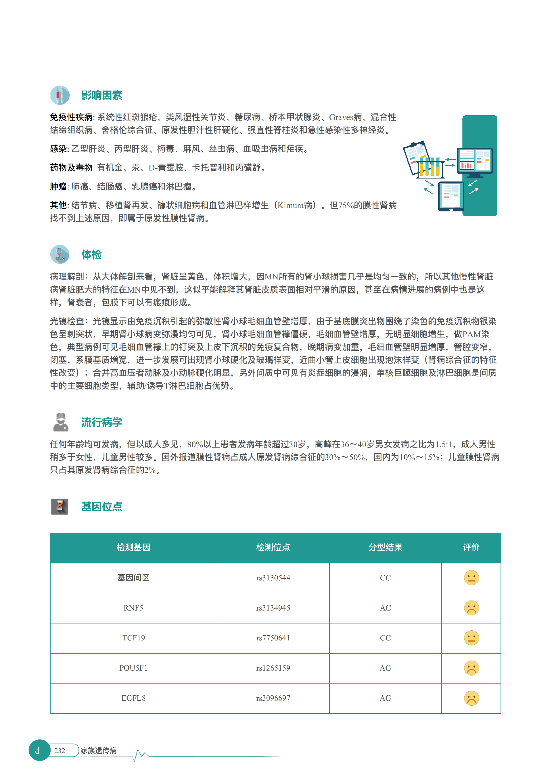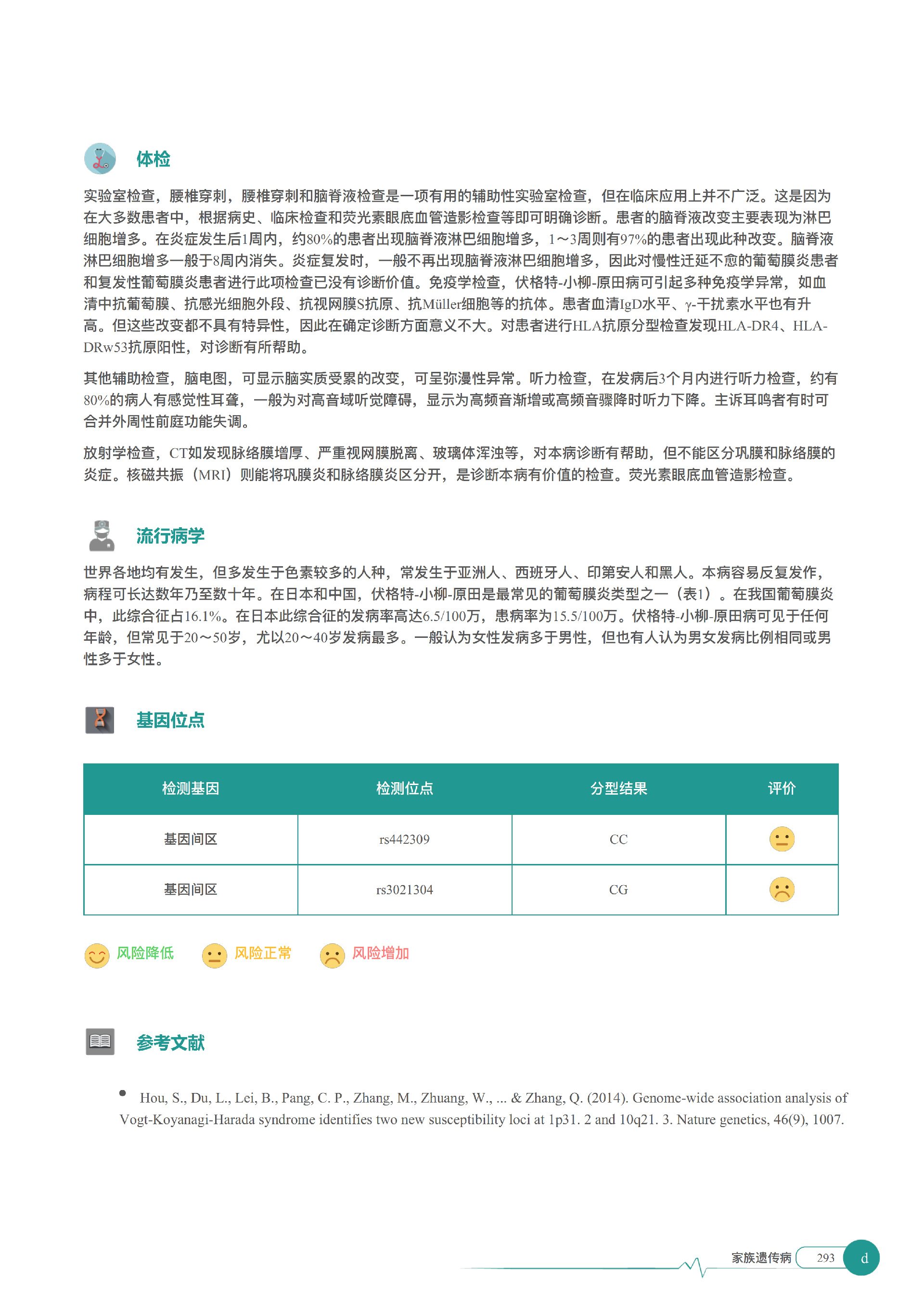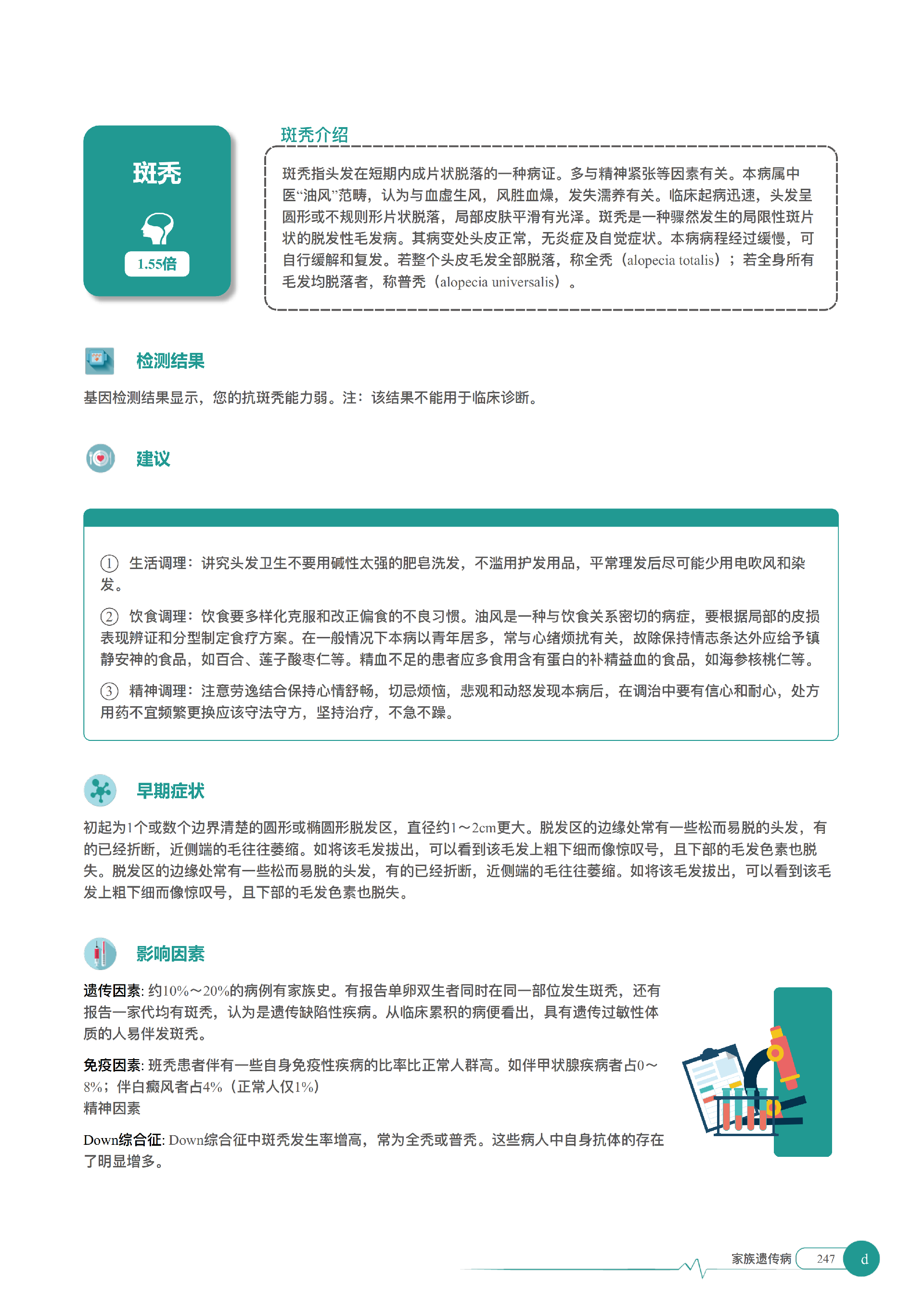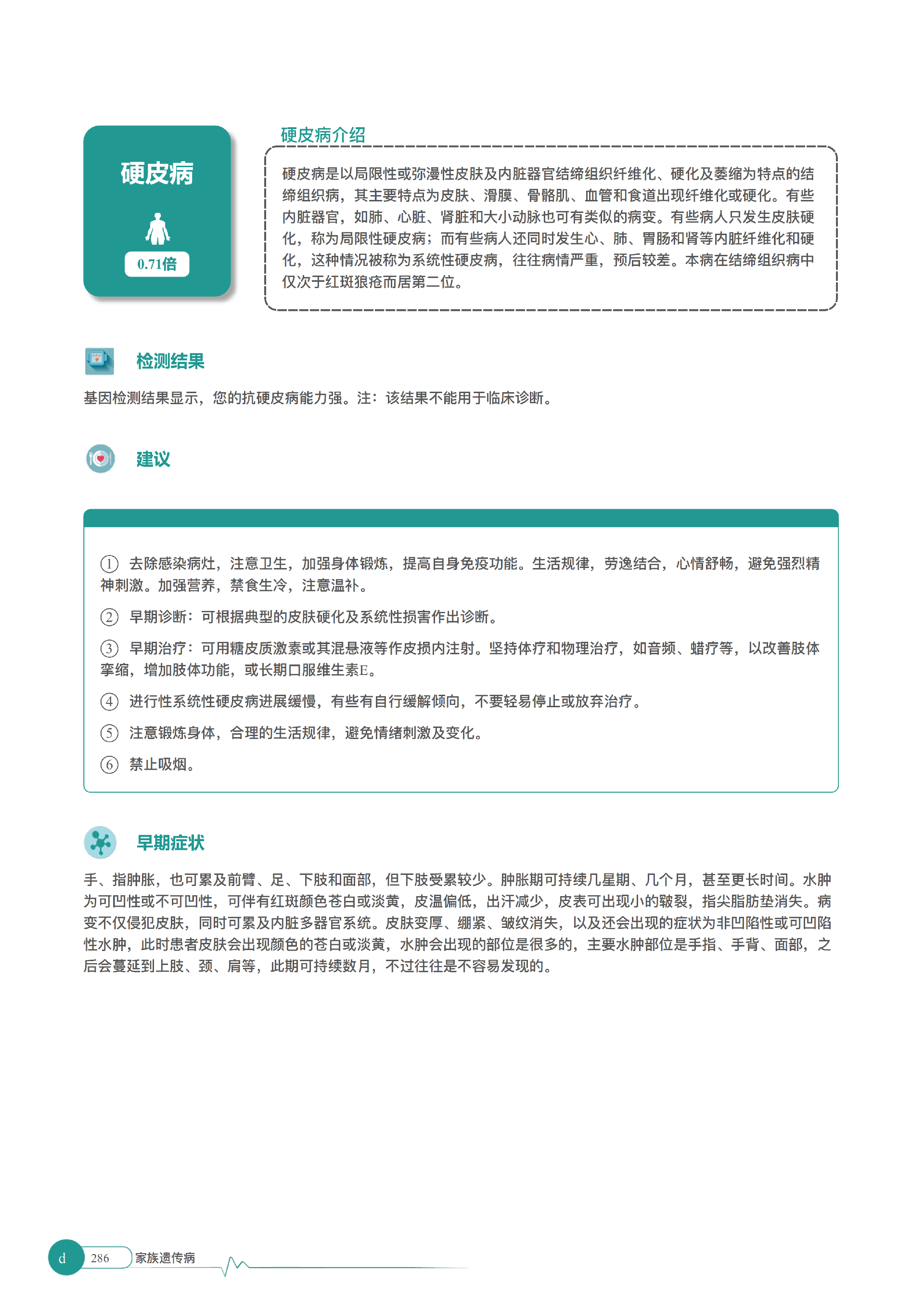 在核心的家族遗传风险筛查中,多项疾病风险值得重点关注:特发性膜性肾病(风险倍数 10.20 倍,终生患病率 10.20%)、老年性黄斑病变(9.92 倍,14.88%)的风险显著高于正常人群;掌腱膜挛缩症(7.19 倍)、非酒精性脂肪性肝病(4.90 倍)等疾病的遗传倾向亦需警惕;此外,静脉血栓栓塞(2.02 倍)、外周动脉病变(1.97 倍)等循环系统疾病,以及睡眠脚动症(2.38 倍)、妥瑞症(1.82 倍)等神经系统疾病,其风险也高于平均水平。风险倍数高于 1 代表患病概率超常人,低于 1 则更具抗病优势,需注意的是,风险高低不代表必然发病,仍需结合环境、生活习惯等因素综合判断。