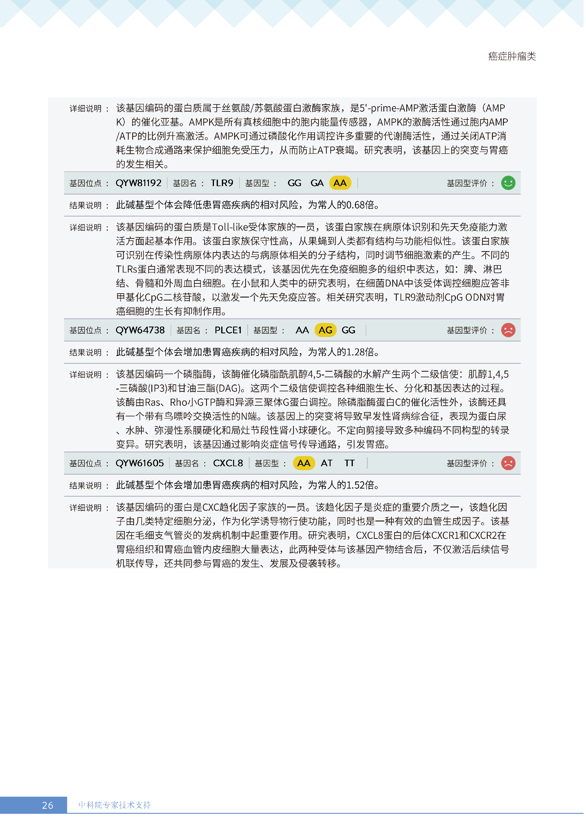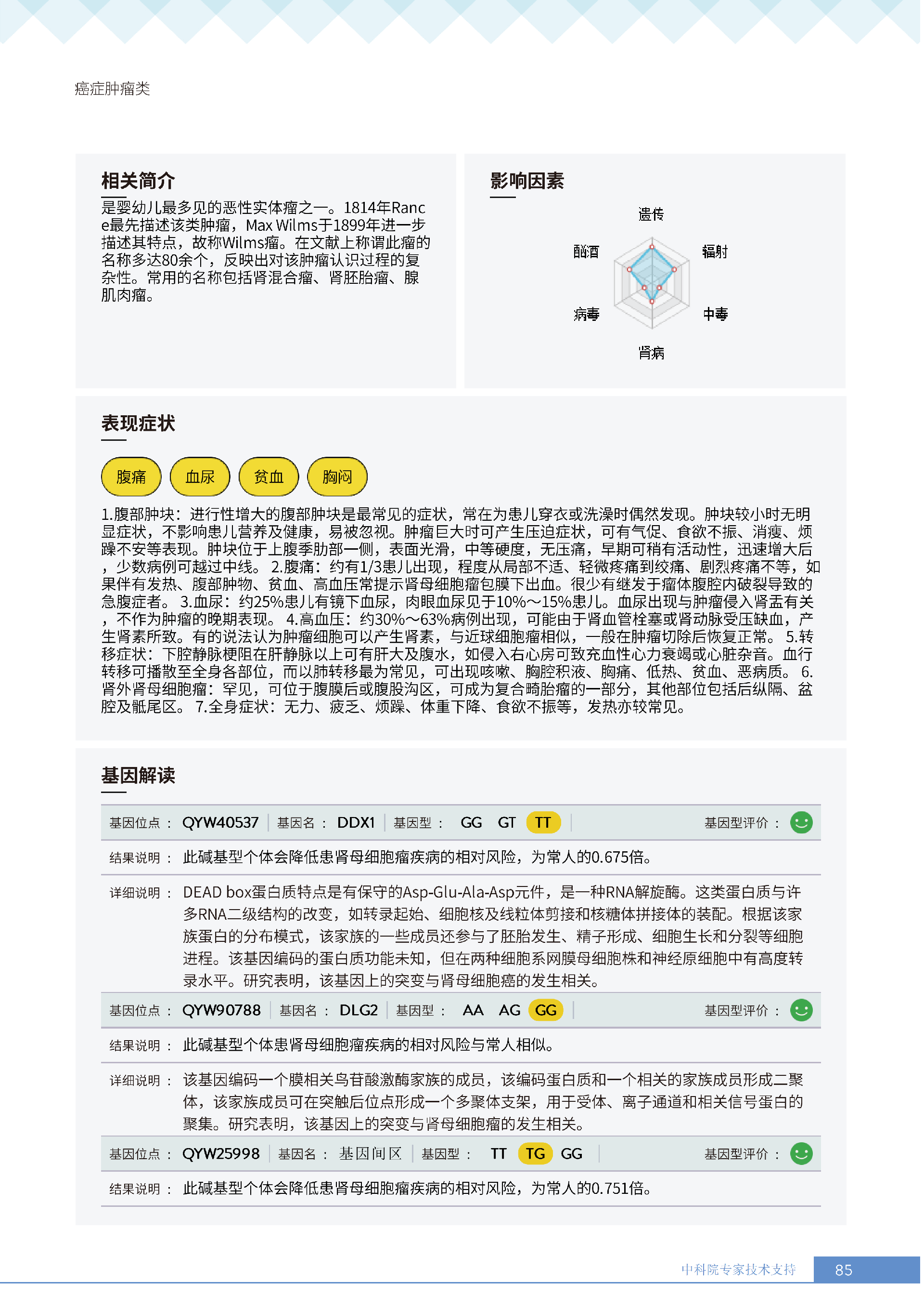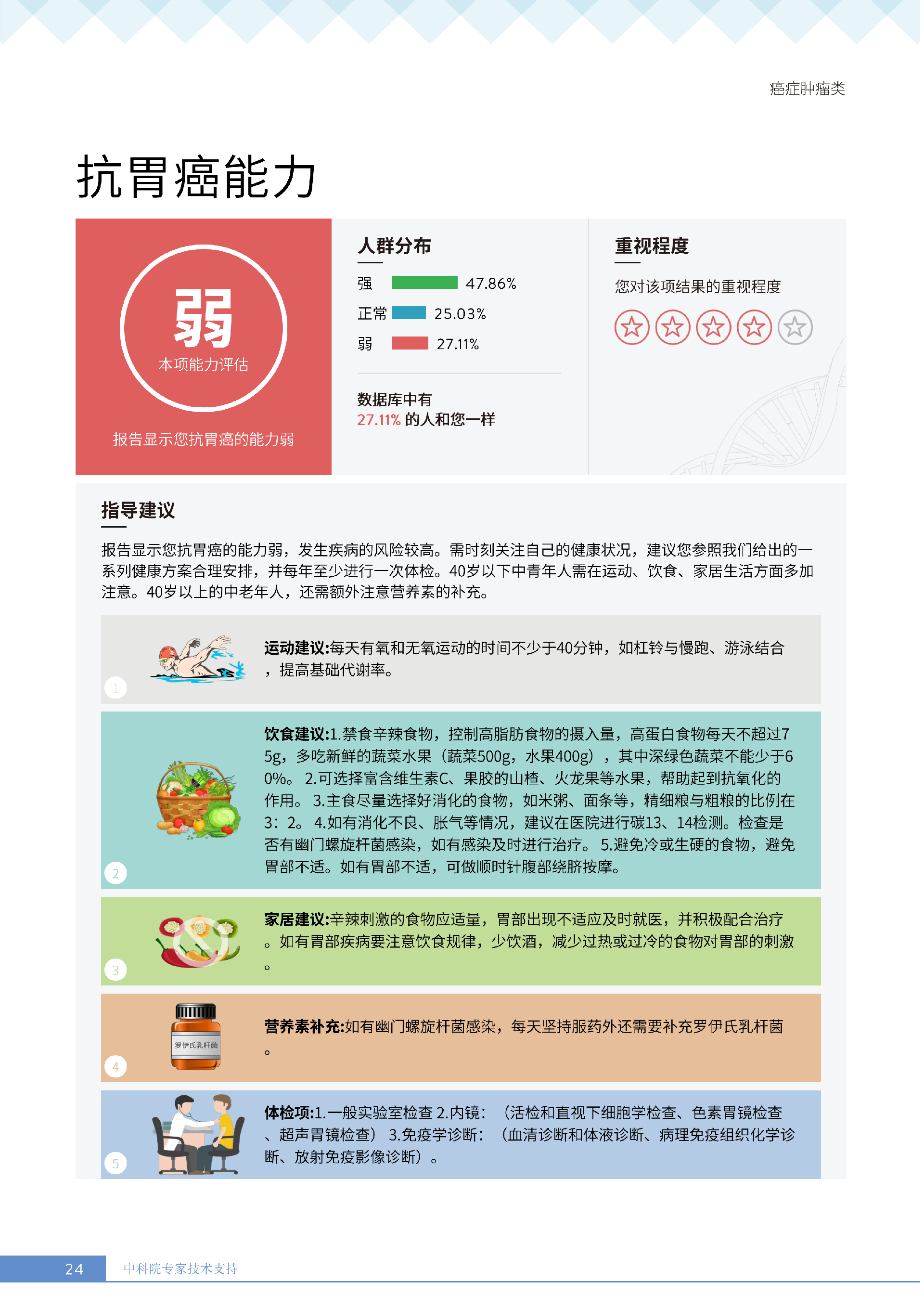 就像下面王女士的报告所呈现的:她抗胃癌、肾癌、胆囊癌等 9 项癌症的能力较弱,其中抗肾癌能力弱的人群占比仅 13.36%,抗甲状腺癌弱的人群占比更是低至 10.55%—— 这些风险若不靠筛查,单靠日常体感根本无法察觉。试想,若未通过基因筛查发现抗胃癌能力弱,可能就不会重视幽门螺杆菌检测,也不会刻意控制高蛋白摄入;若不知抗肾癌能力薄弱,或许仍会忽视重金属接触风险,也不会有意识地保证每日 1800ml 饮水。正是筛查,让这些 “看不见的风险” 变成了 “可应对的目标”,避免了在健康盲区里被动承受风险。