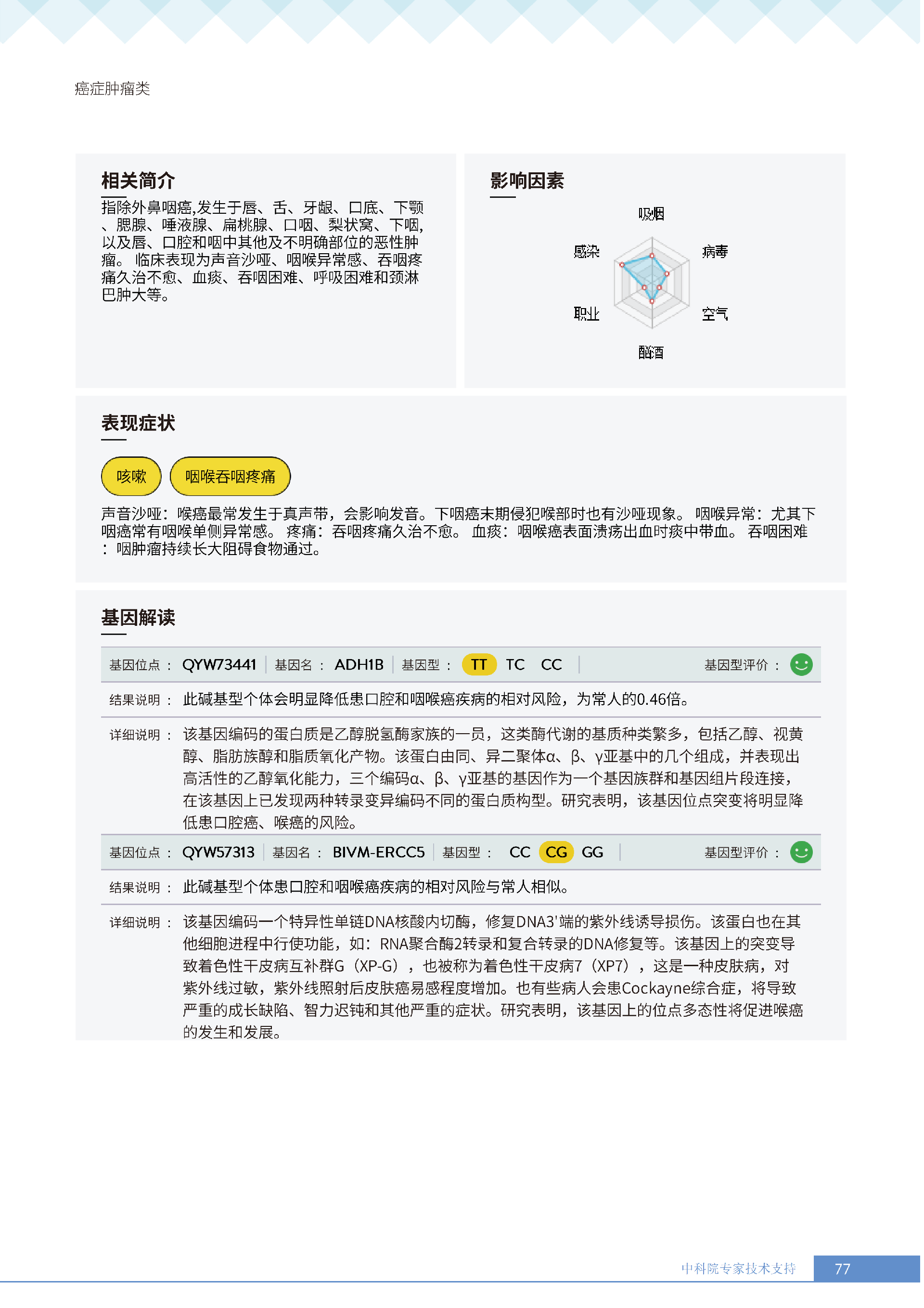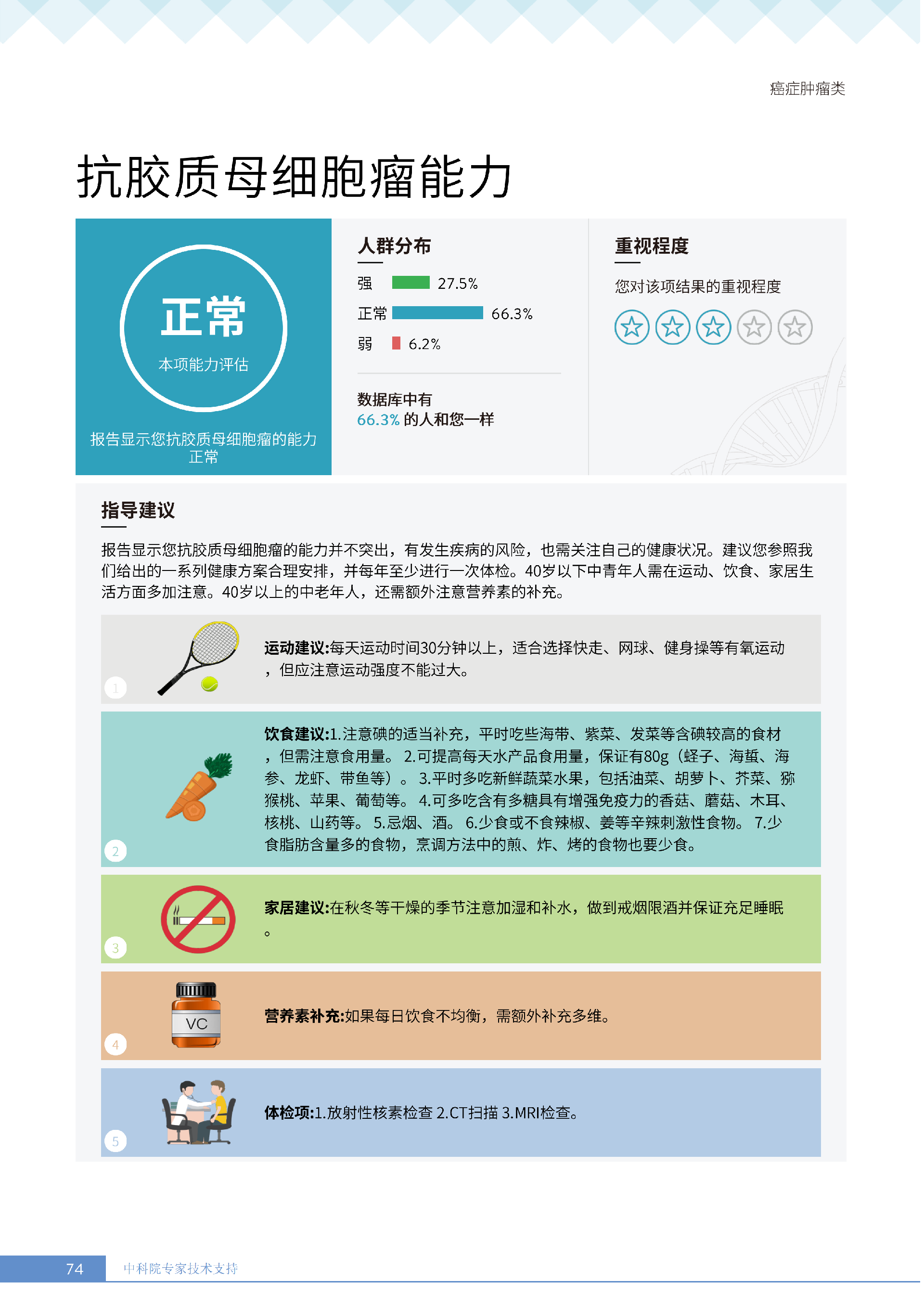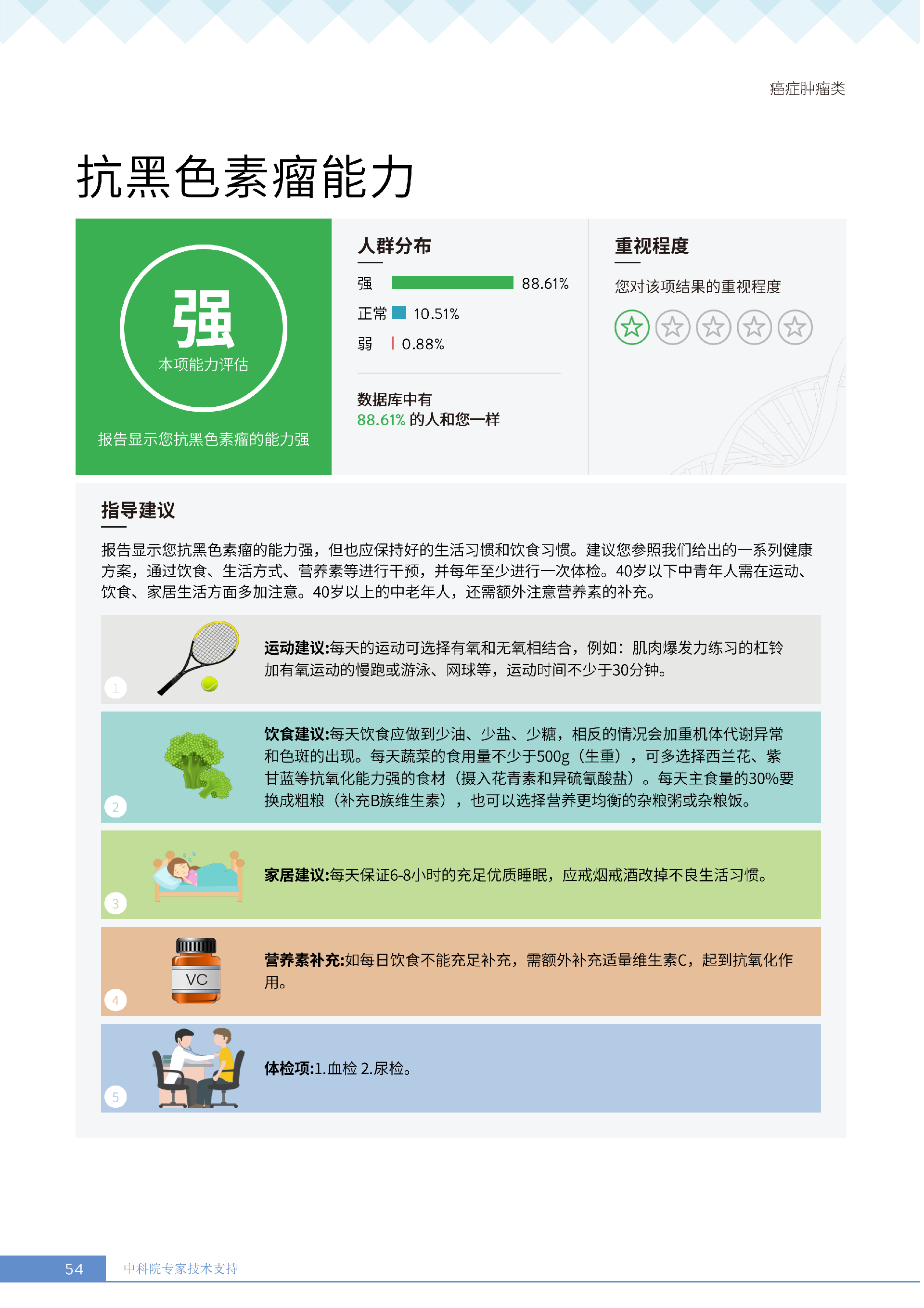 更重要的是,癌症筛查能精准适配个体差异,避免 “一刀切” 的盲目预防。有人像王女士一样,抗黑色素瘤能力强(88.61% 人群同水平),筛查能帮她明确 “无需过度焦虑此项”,可将精力放在薄弱项上;有人可能抗肺癌能力弱,筛查则会提示避免空气污染、定期做肺部 CT—— 它不是让所有人都陷入 “恐癌焦虑”,而是基于每个人的基因、年龄、生活环境等,画出 “个性化风险地图”,让预防有重点、干预有方向。