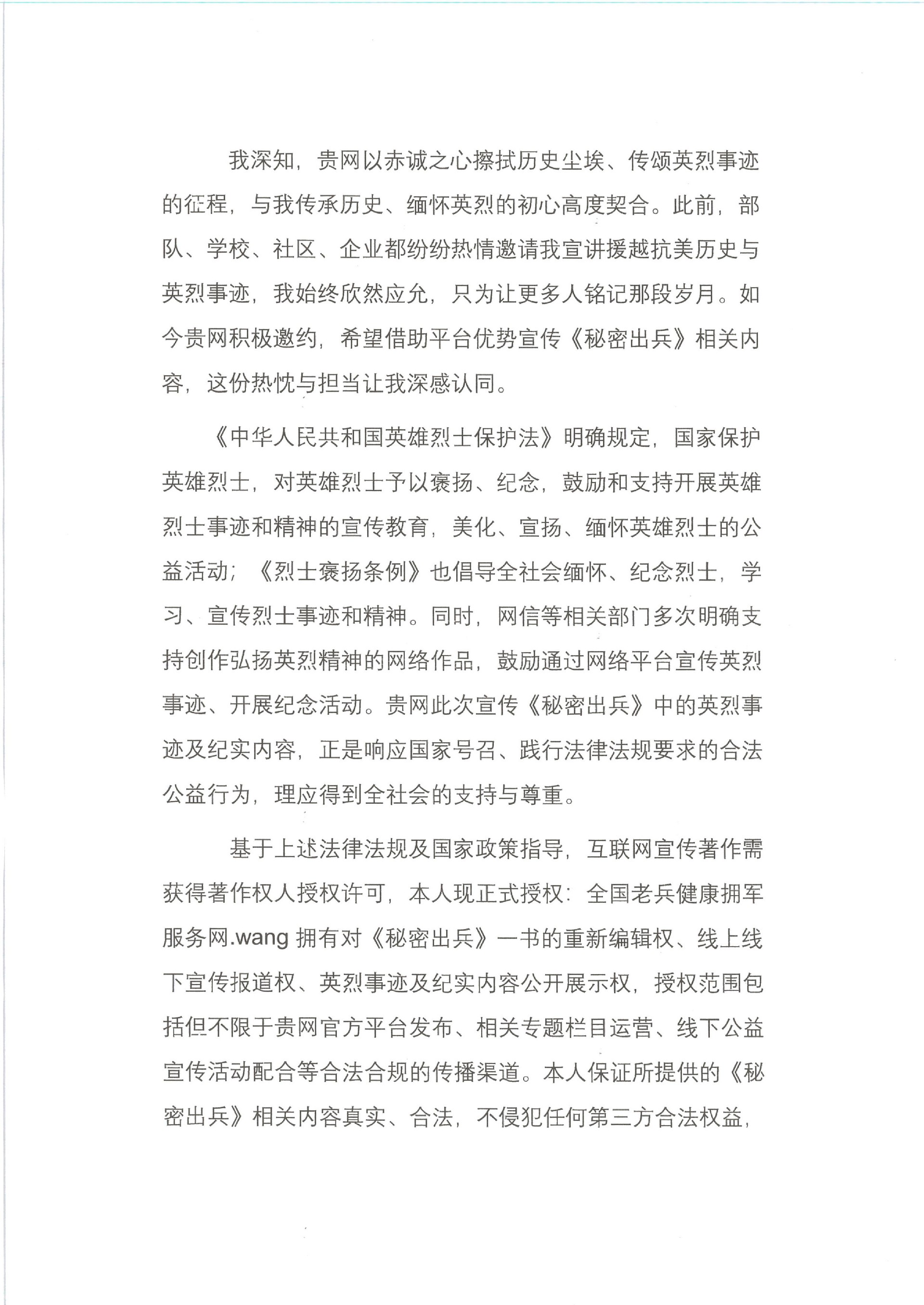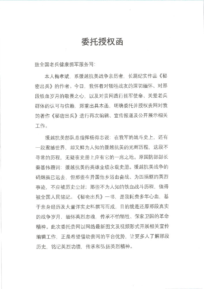 授权委托合法宣传纪实长篇《秘密出兵》中援越抗美烈士事迹及尘封红色记忆
