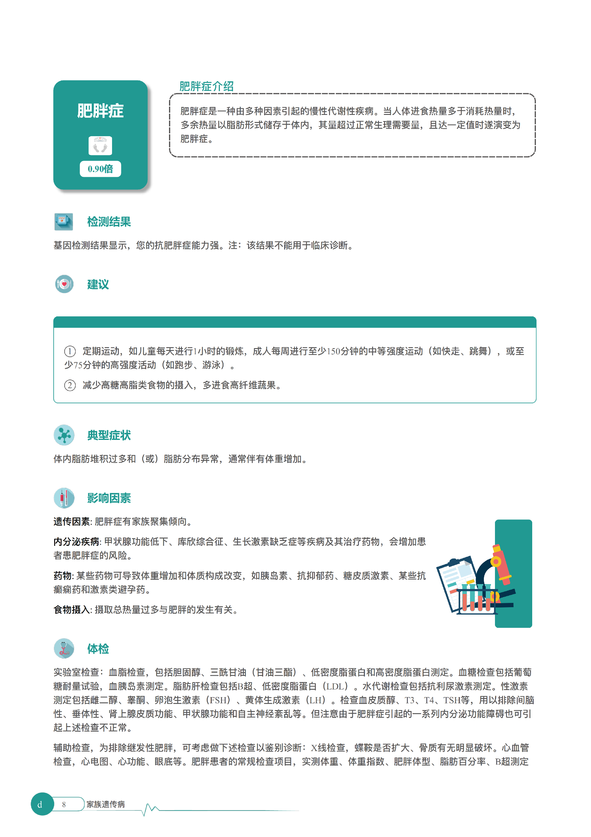 报告不仅呈现风险,更提供可落地的健康建议:针对高风险疾病,如糖尿病肾病需定期监测肾功能与尿蛋白,非酒精性脂肪性肝病需控制 BMI 在 18.5-23.9 区间;针对低风险或抗病能力较强的疾病(如肥胖症 0.90 倍、2 型糖尿病 0.83 倍),也建议通过规律运动、合理膳食巩固健康优势。同时,我们在精准用药、营养代谢等领域的分析,将为您未来的医疗选择与生活方式调整提供科学依据。
