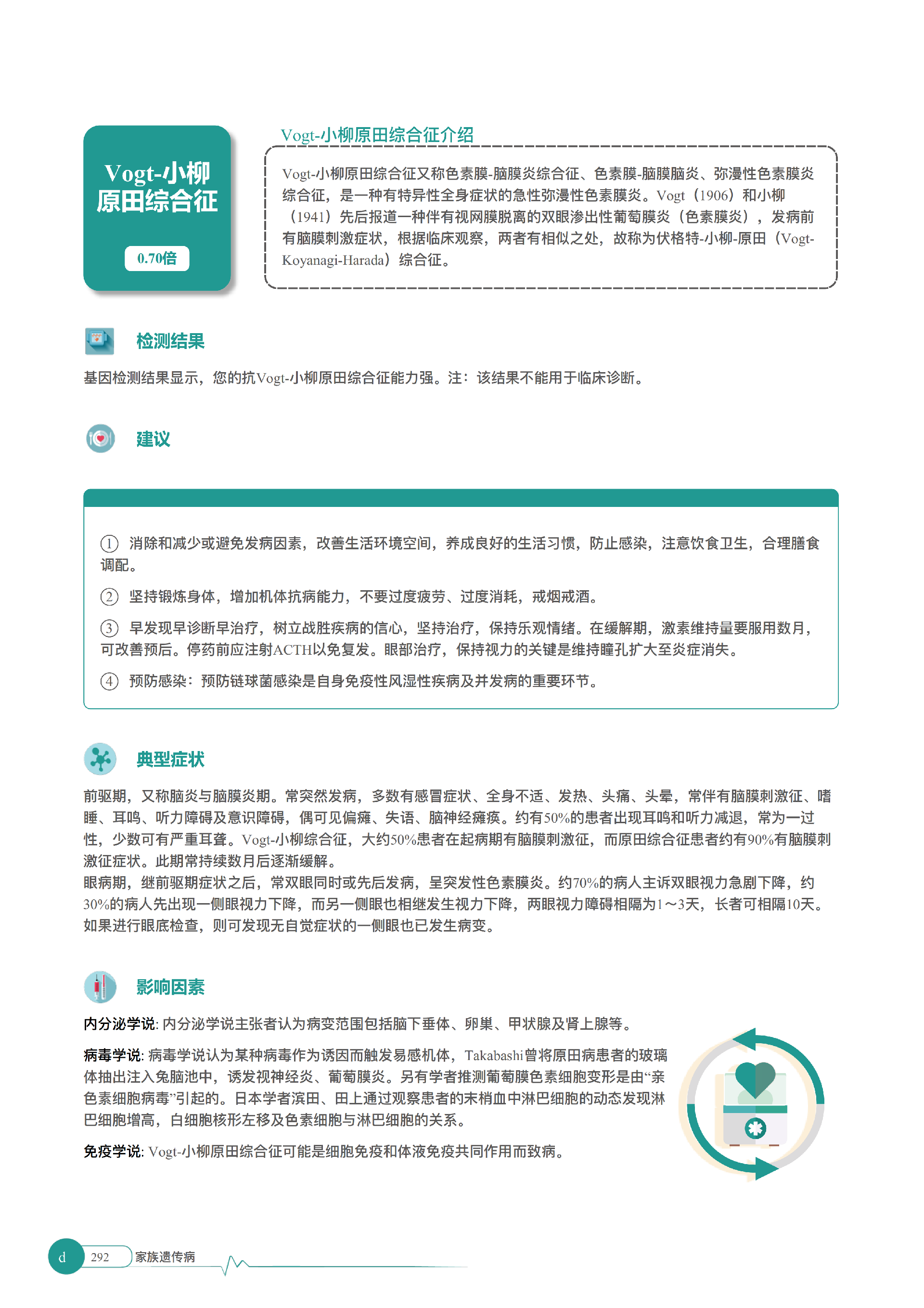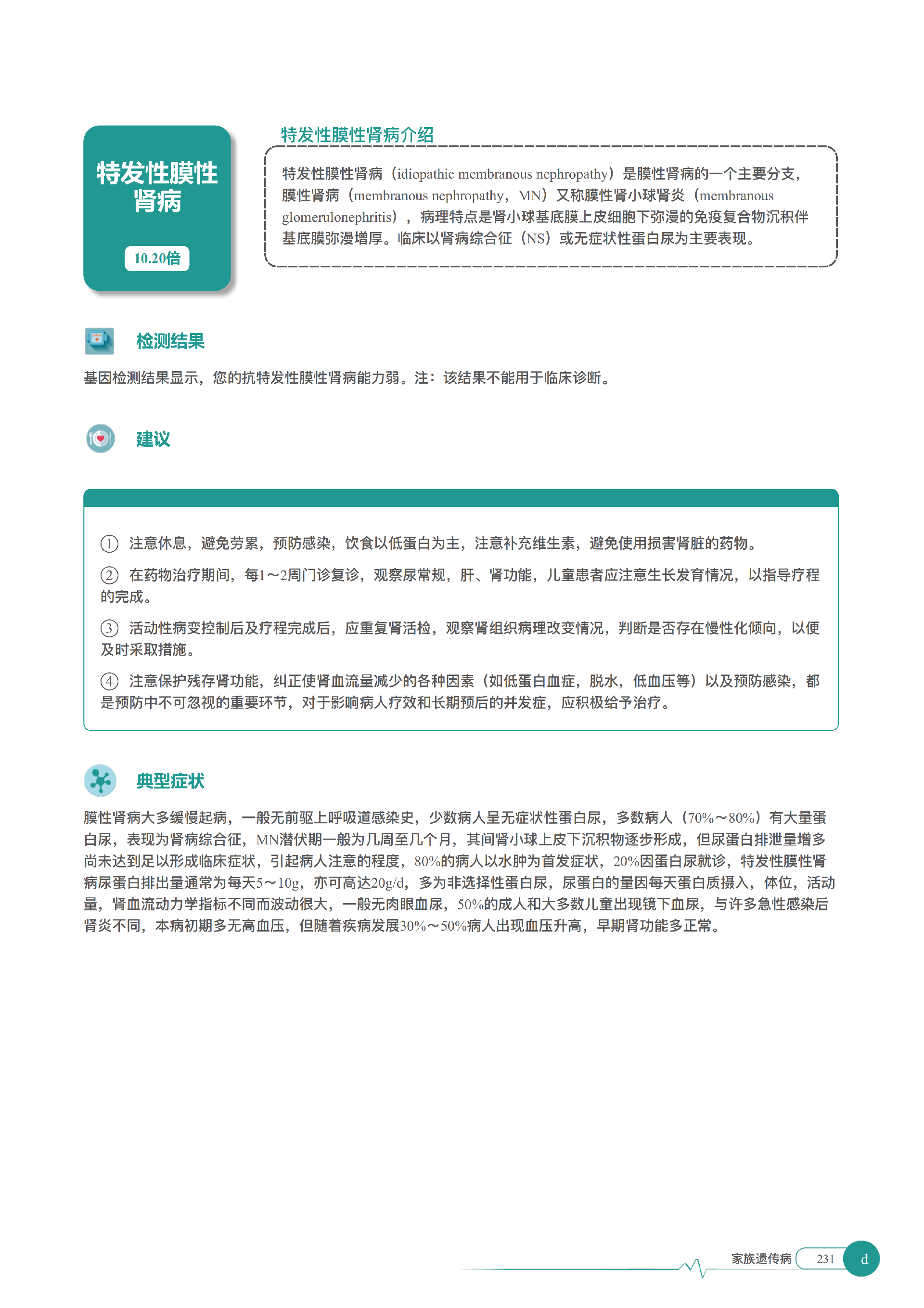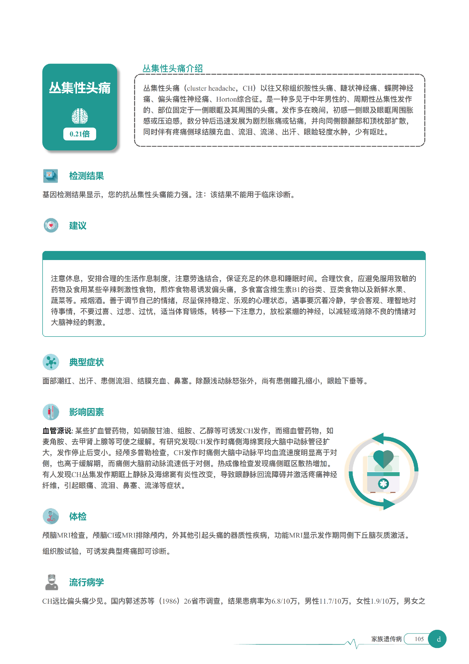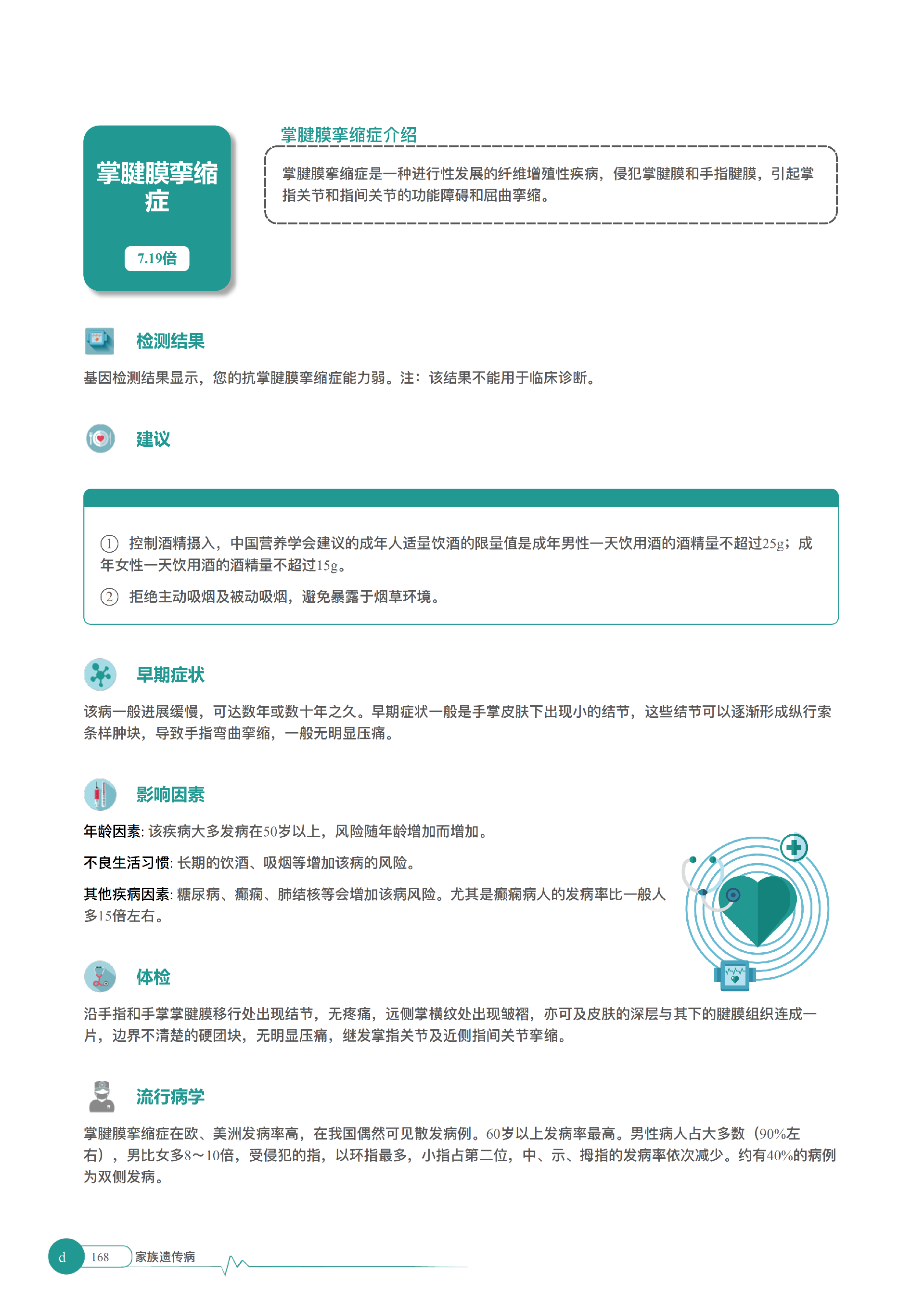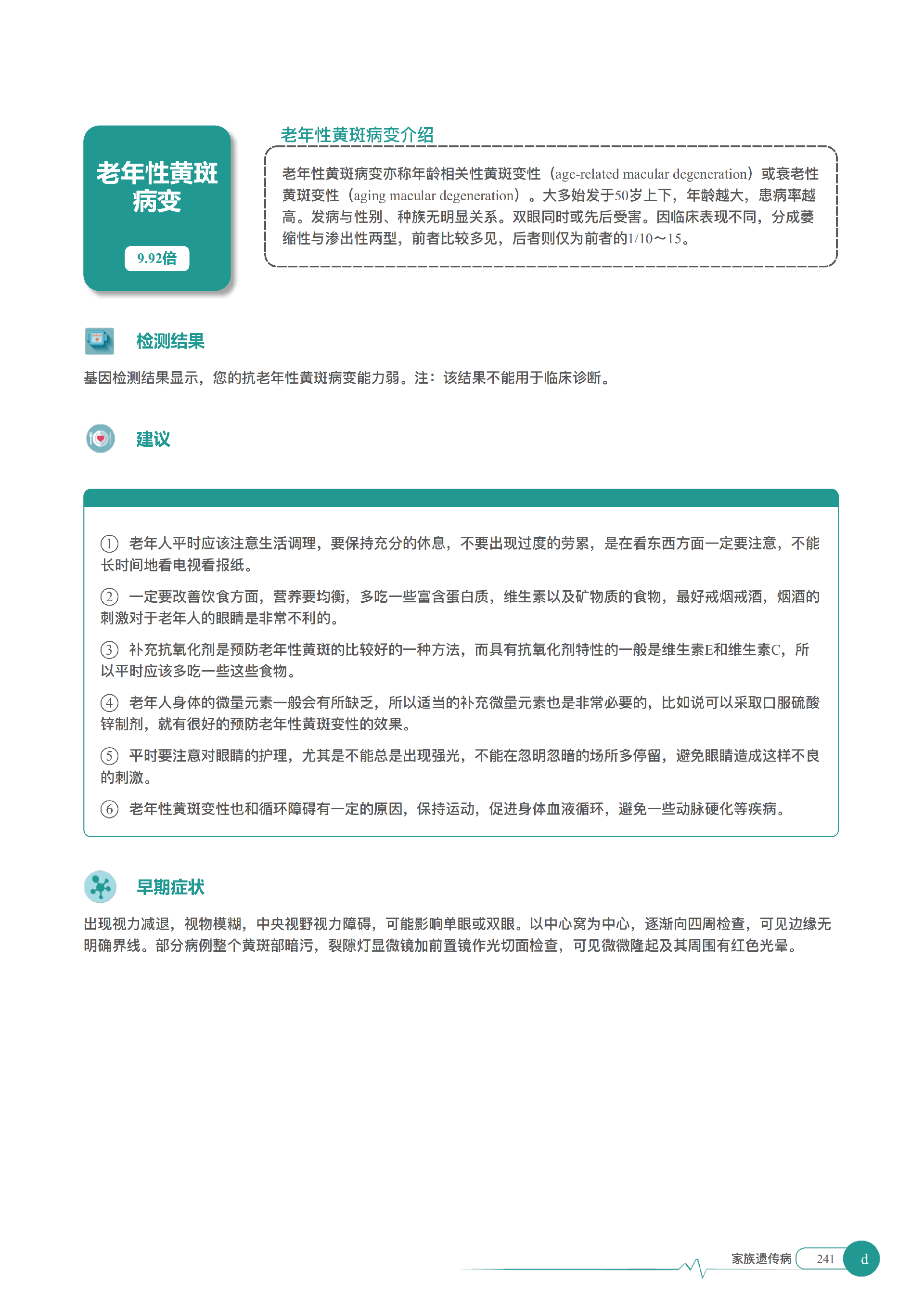 在核心的家族遗传风险筛查中,多项疾病风险值得重点关注:特发性膜性肾病(风险倍数 10.20 倍,终生患病率 10.20%)、老年性黄斑病变(9.92 倍,14.88%)的风险显著高于正常人群;掌腱膜挛缩症(7.19 倍)、非酒精性脂肪性肝病(4.90 倍)等疾病的遗传倾向亦需警惕;此外,静脉血栓栓塞(2.02 倍)、外周动脉病变(1.97 倍)等循环系统疾病,以及睡眠脚动症(2.38 倍)、妥瑞症(1.82 倍)等神经系统疾病,其风险也高于平均水平。风险倍数高于 1 代表患病概率超常人,低于 1 则更具抗病优势,需注意的是,风险高低不代表必然发病,仍需结合环境、生活习惯等因素综合判断。