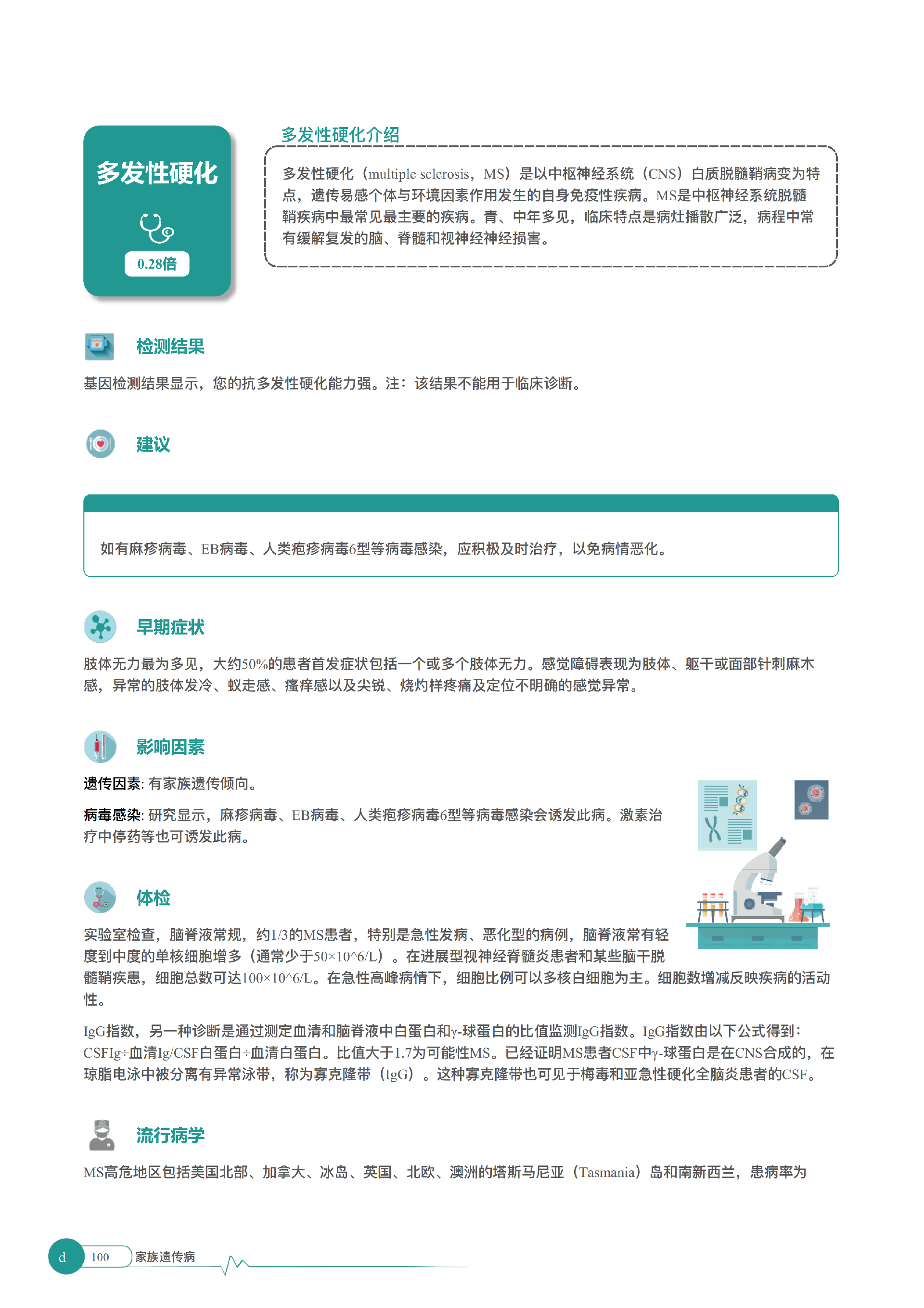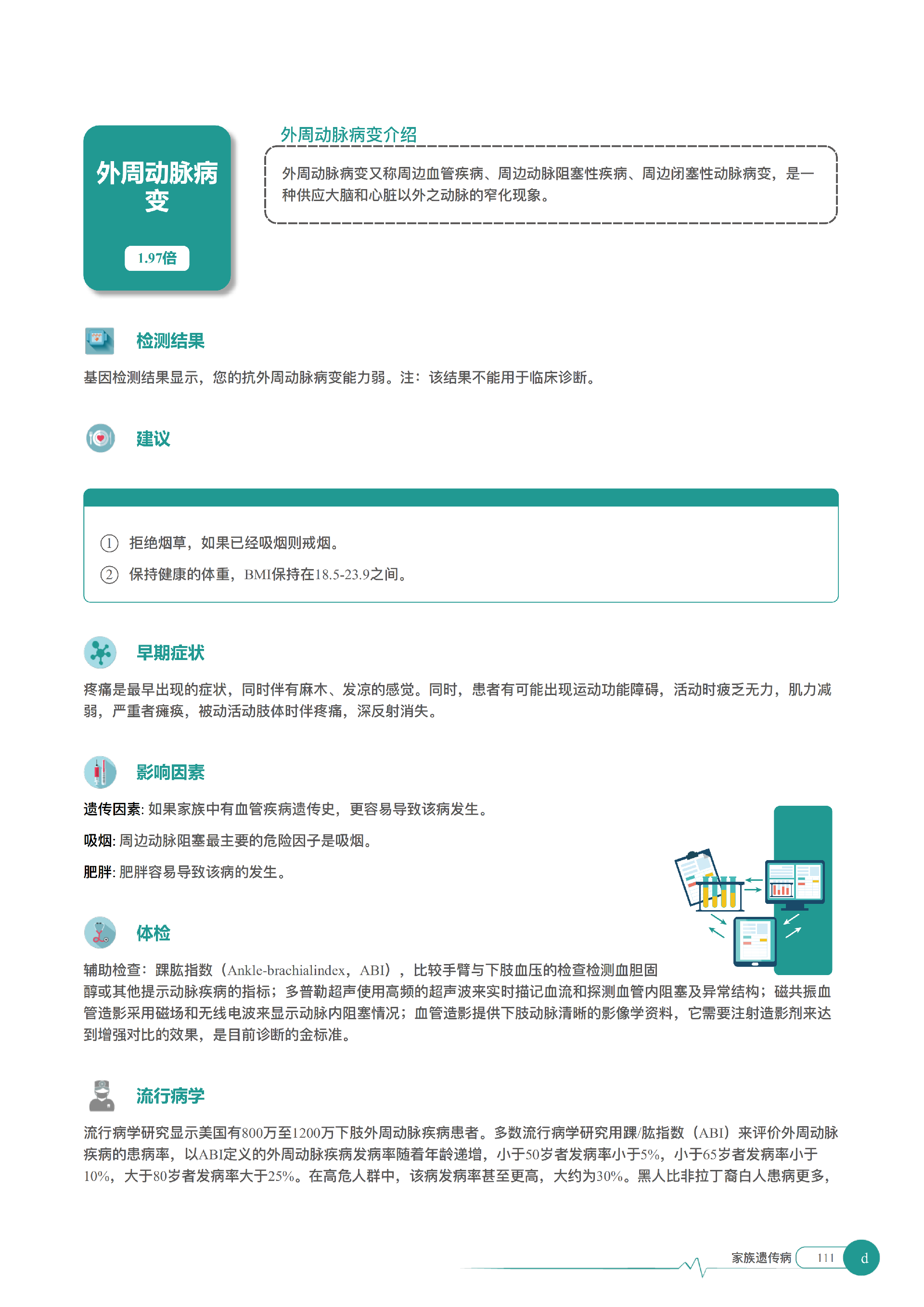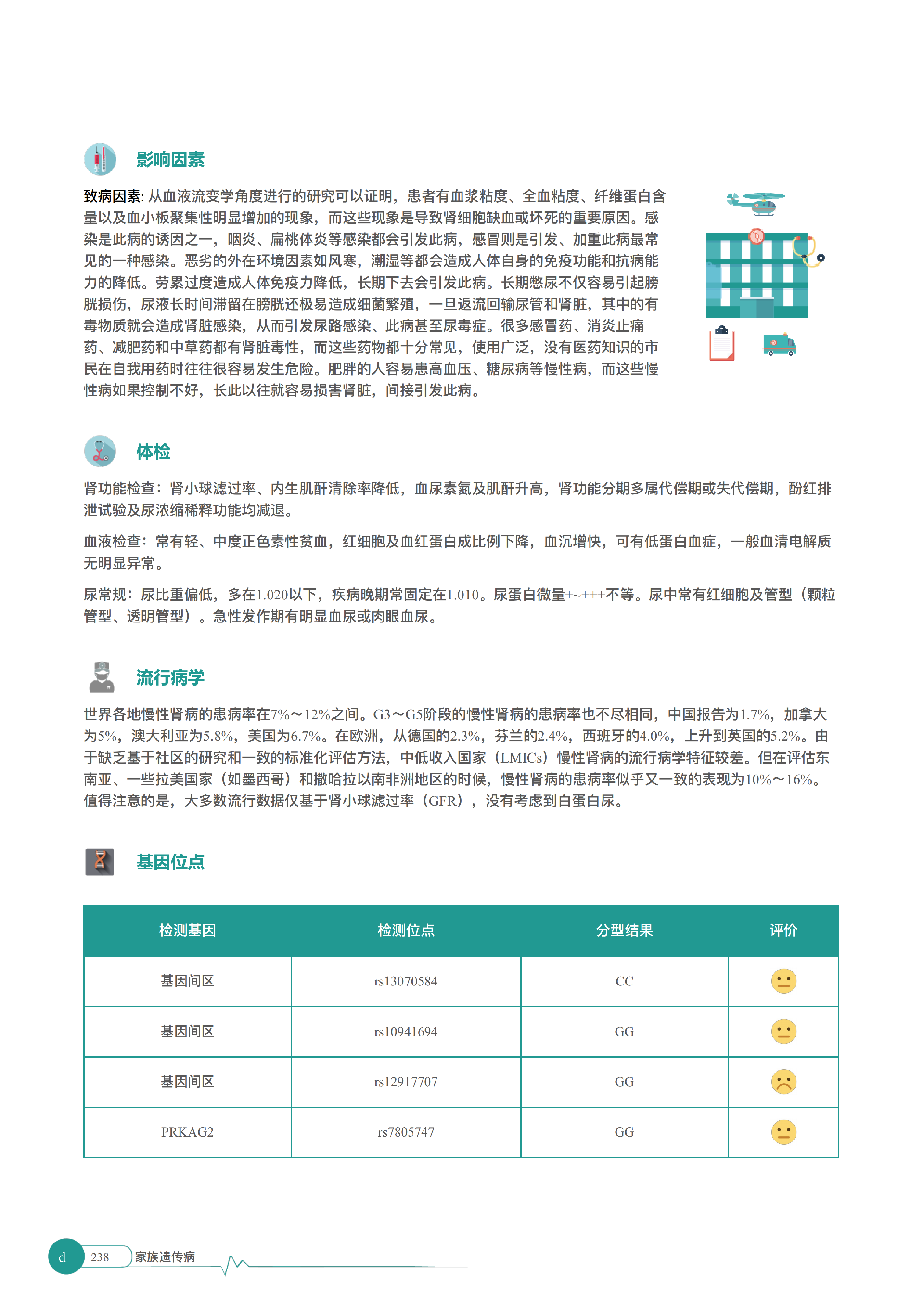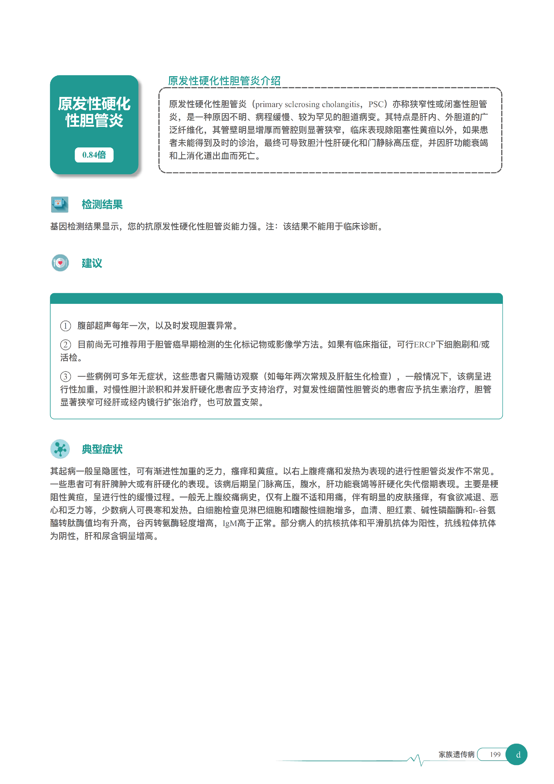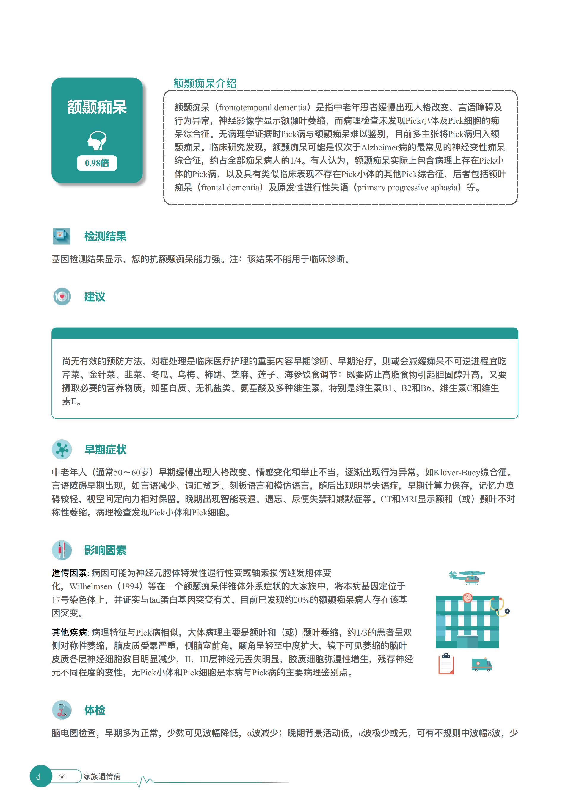 在核心的家族遗传风险筛查中,多项疾病风险值得重点关注:特发性膜性肾病(风险倍数 10.20 倍,终生患病率 10.20%)、老年性黄斑病变(9.92 倍,14.88%)的风险显著高于正常人群;掌腱膜挛缩症(7.19 倍)、非酒精性脂肪性肝病(4.90 倍)等疾病的遗传倾向亦需警惕;此外,静脉血栓栓塞(2.02 倍)、外周动脉病变(1.97 倍)等循环系统疾病,以及睡眠脚动症(2.38 倍)、妥瑞症(1.82 倍)等神经系统疾病,其风险也高于平均水平。风险倍数高于 1 代表患病概率超常人,低于 1 则更具抗病优势,需注意的是,风险高低不代表必然发病,仍需结合环境、生活习惯等因素综合判断。