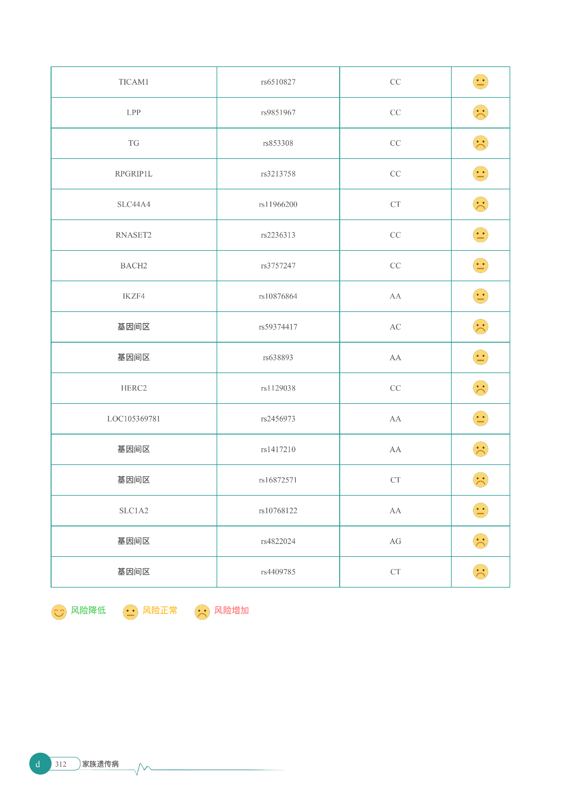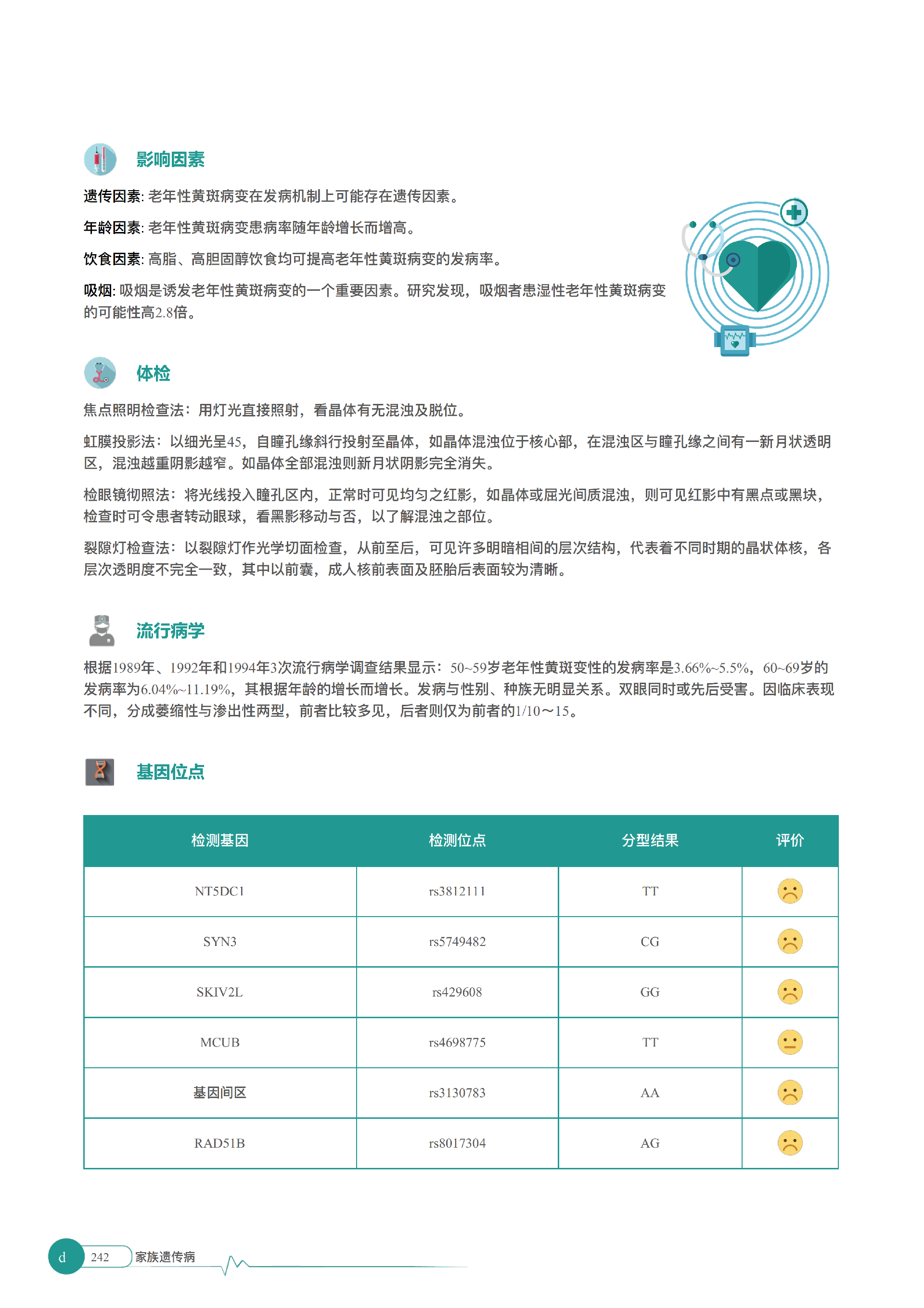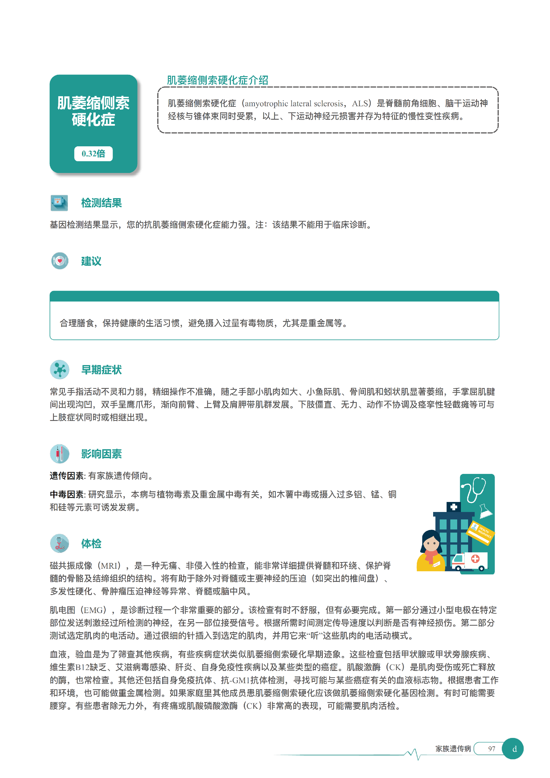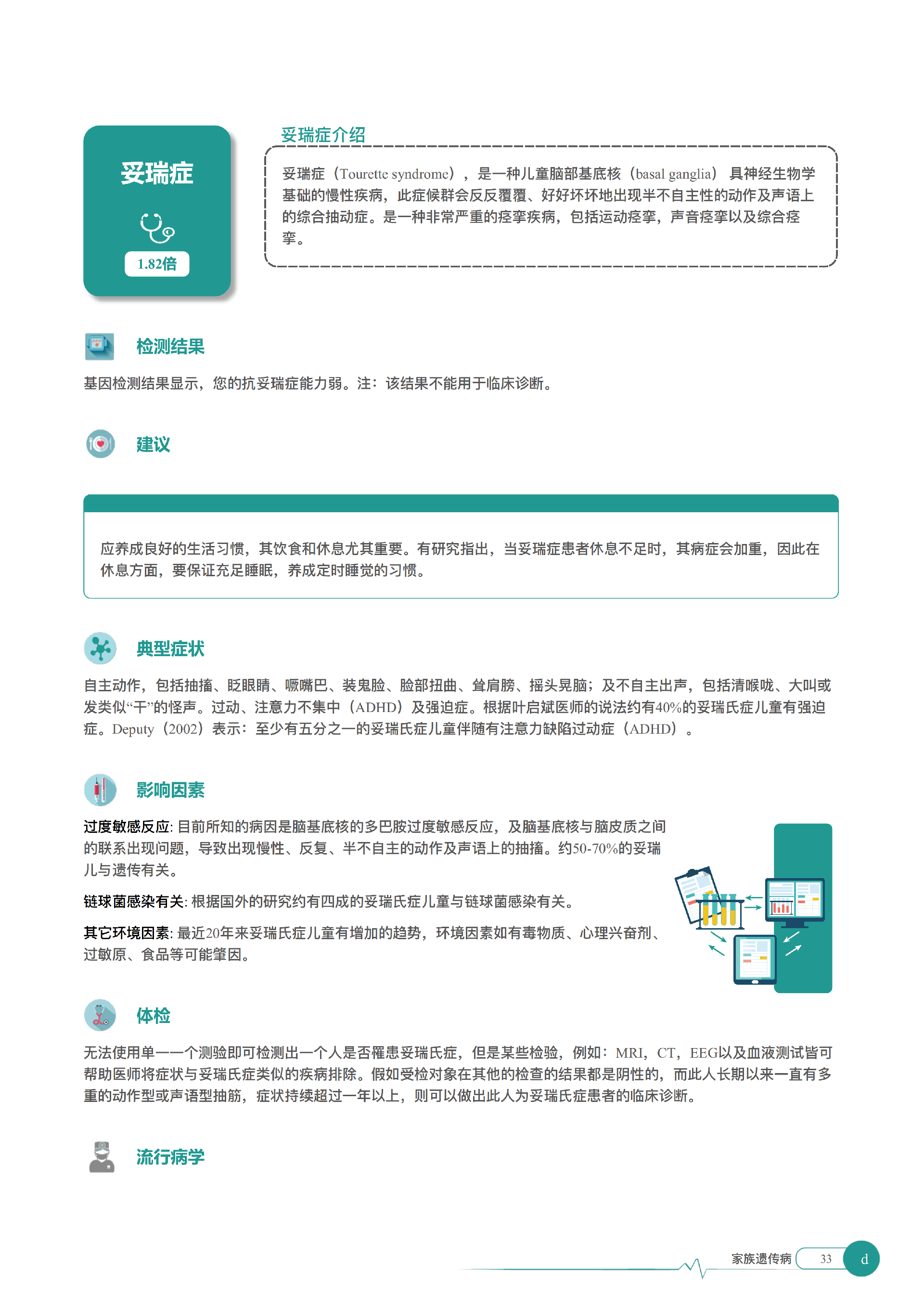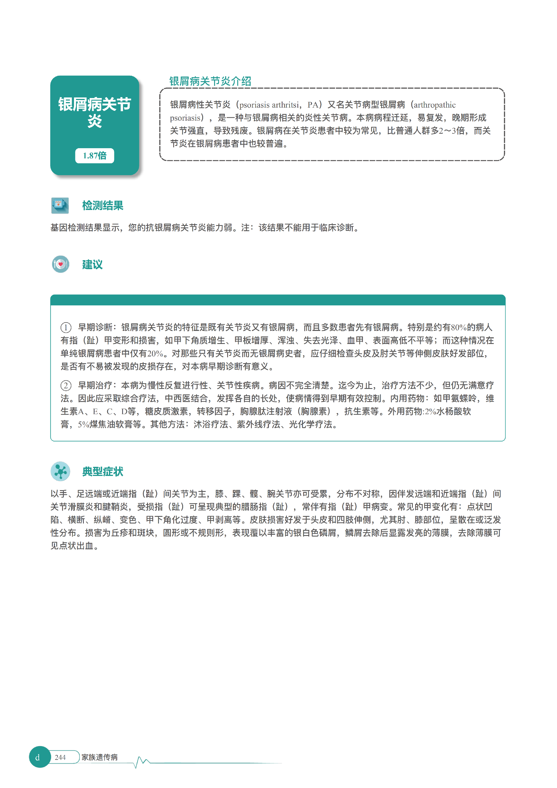 在核心的家族遗传风险筛查中,多项疾病风险值得重点关注:特发性膜性肾病(风险倍数 10.20 倍,终生患病率 10.20%)、老年性黄斑病变(9.92 倍,14.88%)的风险显著高于正常人群;掌腱膜挛缩症(7.19 倍)、非酒精性脂肪性肝病(4.90 倍)等疾病的遗传倾向亦需警惕;此外,静脉血栓栓塞(2.02 倍)、外周动脉病变(1.97 倍)等循环系统疾病,以及睡眠脚动症(2.38 倍)、妥瑞症(1.82 倍)等神经系统疾病,其风险也高于平均水平。风险倍数高于 1 代表患病概率超常人,低于 1 则更具抗病优势,需注意的是,风险高低不代表必然发病,仍需结合环境、生活习惯等因素综合判断。