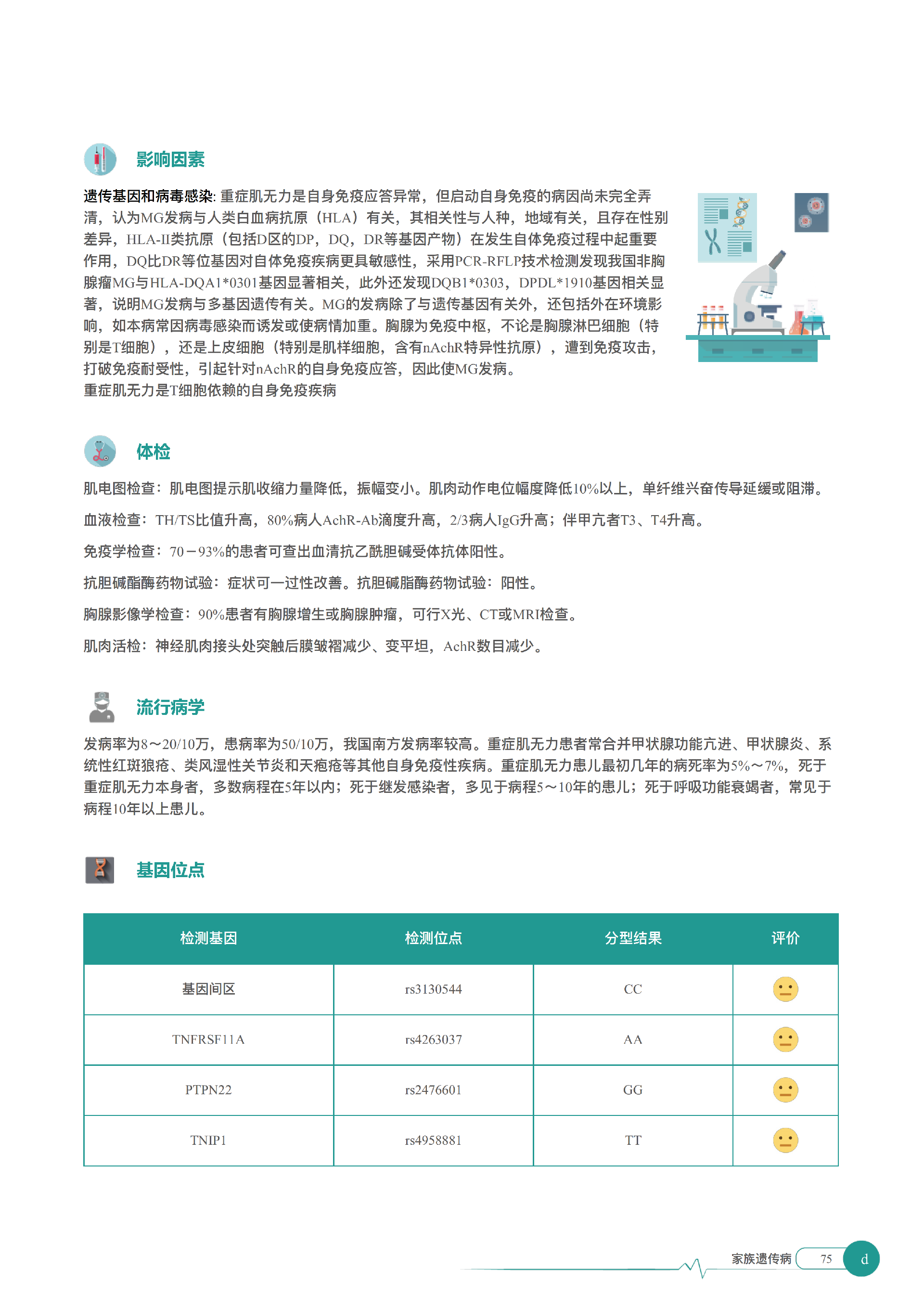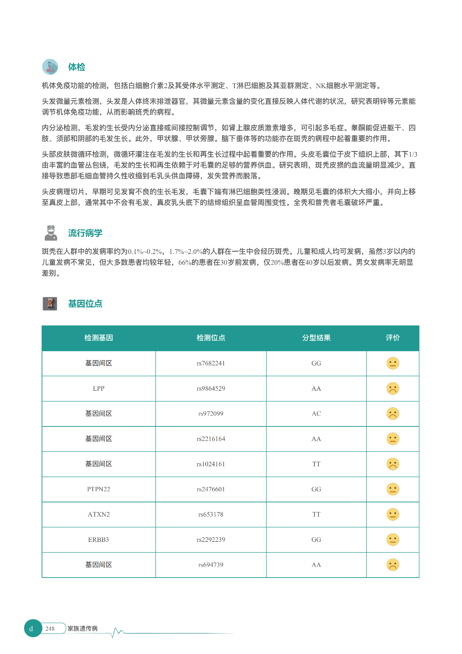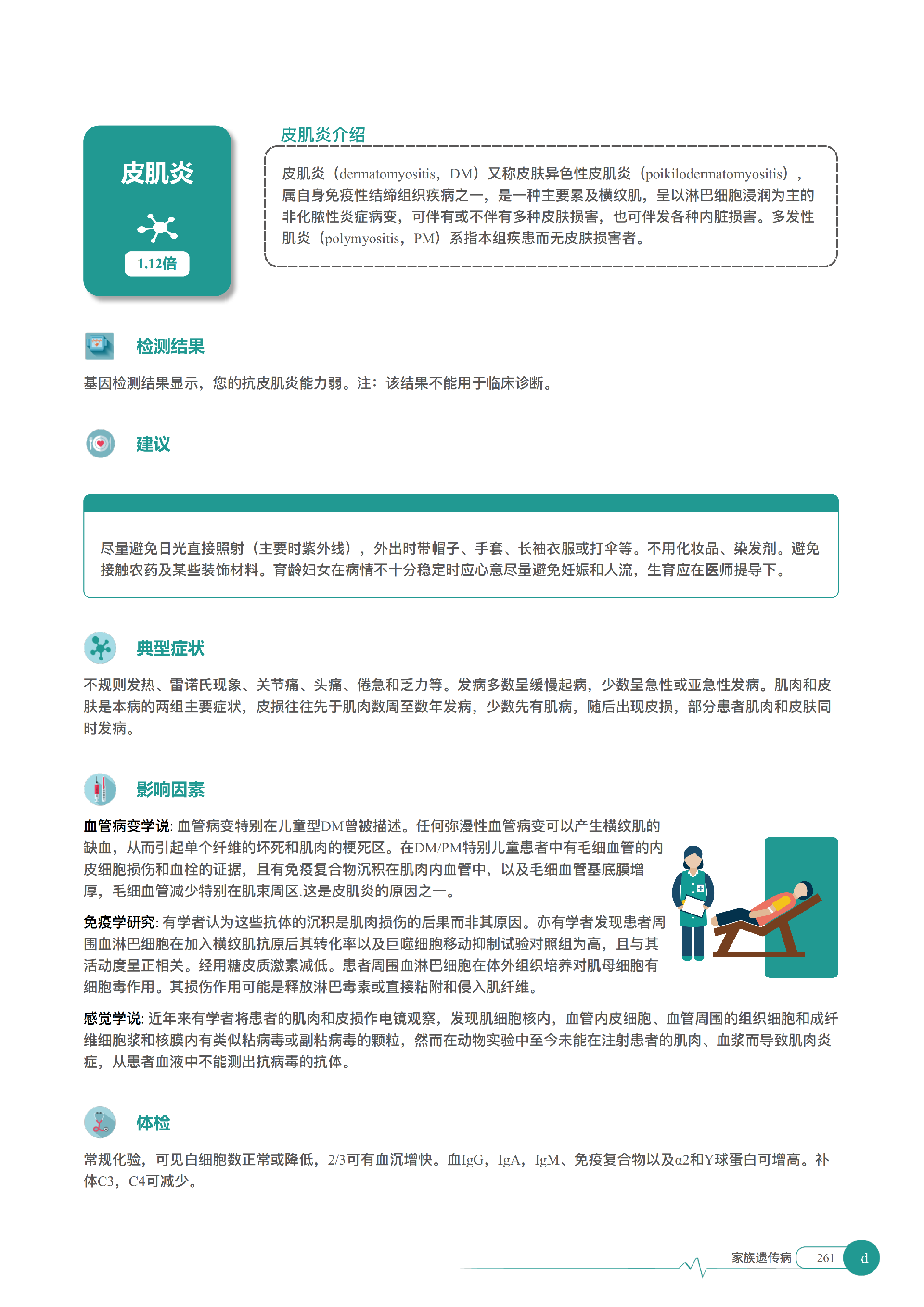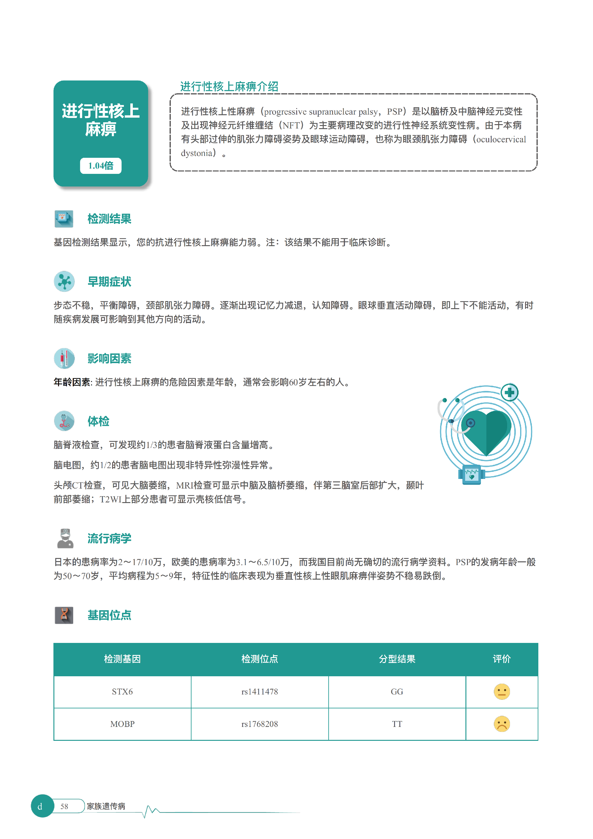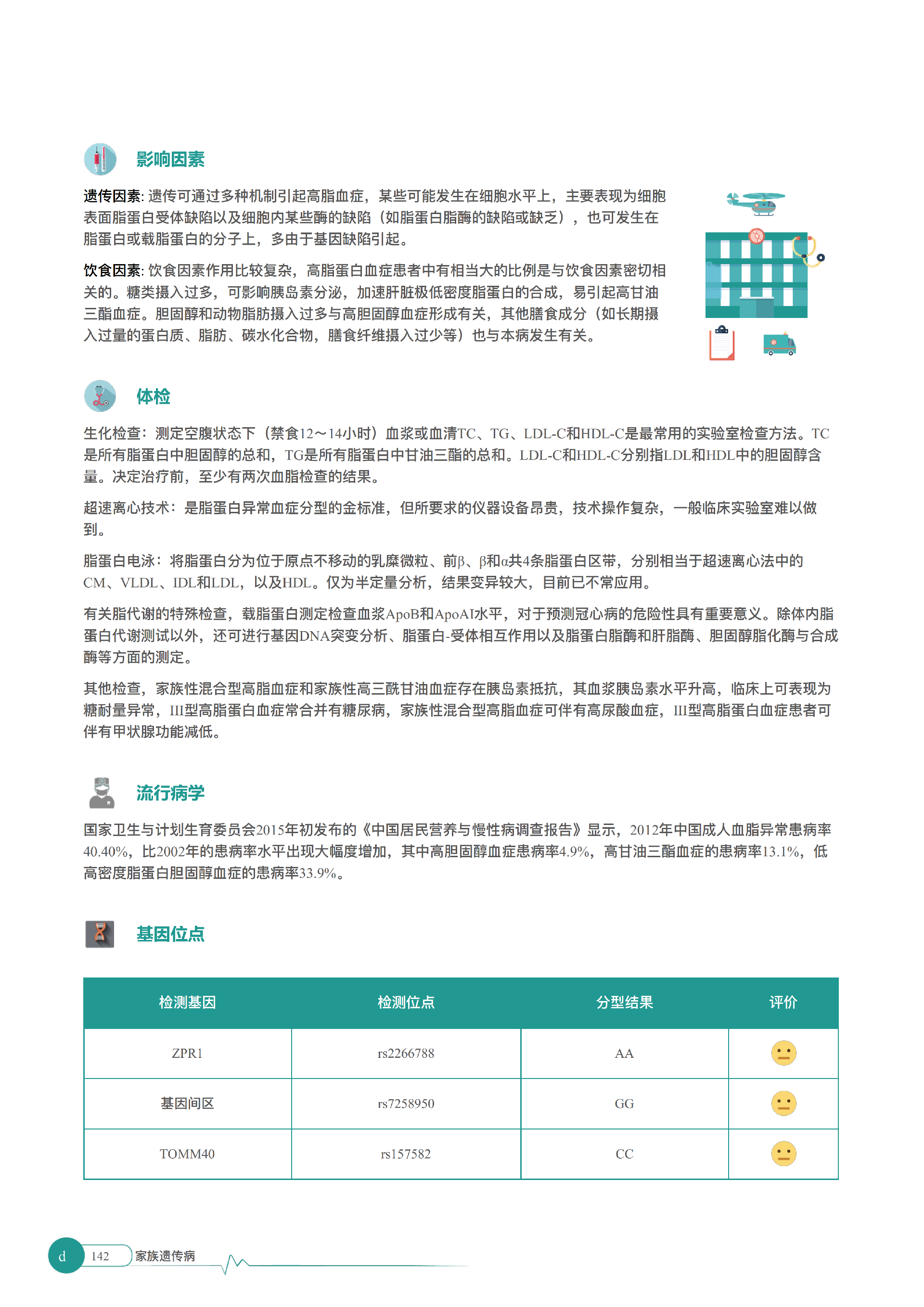 在核心的家族遗传风险筛查中,多项疾病风险值得重点关注:特发性膜性肾病(风险倍数 10.20 倍,终生患病率 10.20%)、老年性黄斑病变(9.92 倍,14.88%)的风险显著高于正常人群;掌腱膜挛缩症(7.19 倍)、非酒精性脂肪性肝病(4.90 倍)等疾病的遗传倾向亦需警惕;此外,静脉血栓栓塞(2.02 倍)、外周动脉病变(1.97 倍)等循环系统疾病,以及睡眠脚动症(2.38 倍)、妥瑞症(1.82 倍)等神经系统疾病,其风险也高于平均水平。风险倍数高于 1 代表患病概率超常人,低于 1 则更具抗病优势,需注意的是,风险高低不代表必然发病,仍需结合环境、生活习惯等因素综合判断。