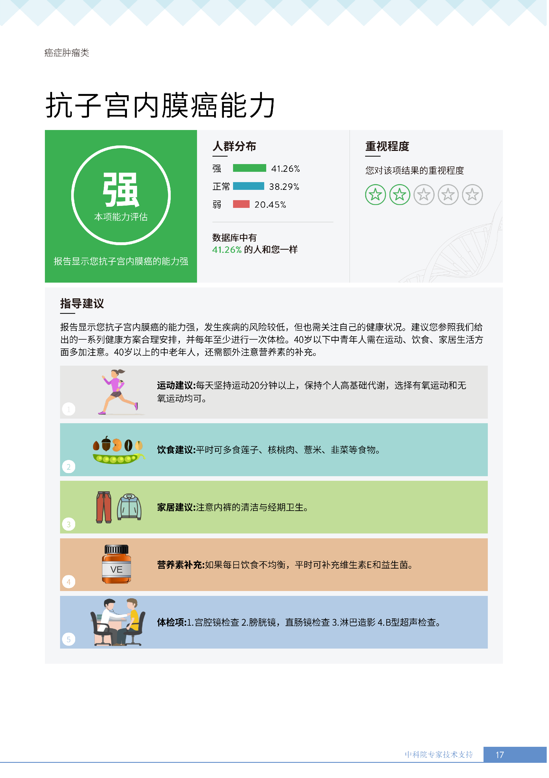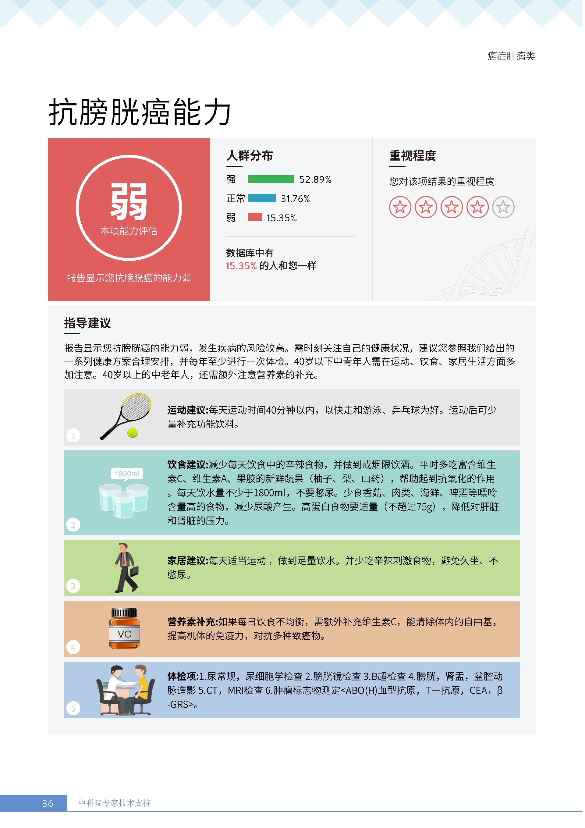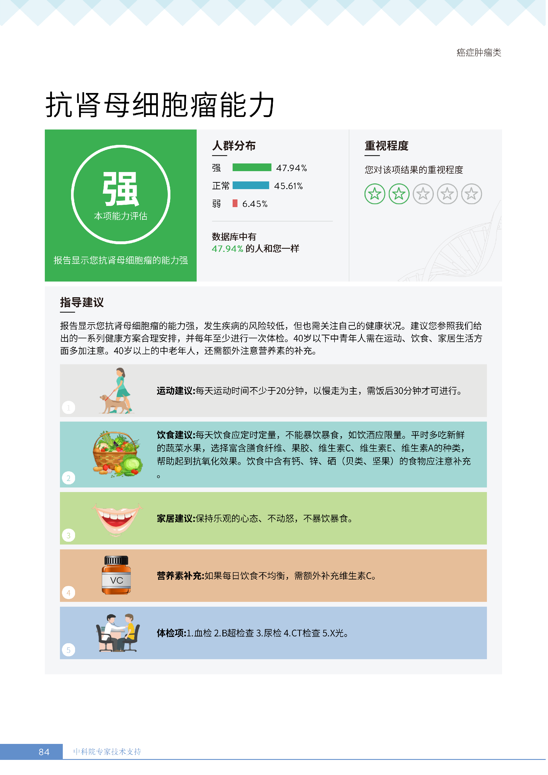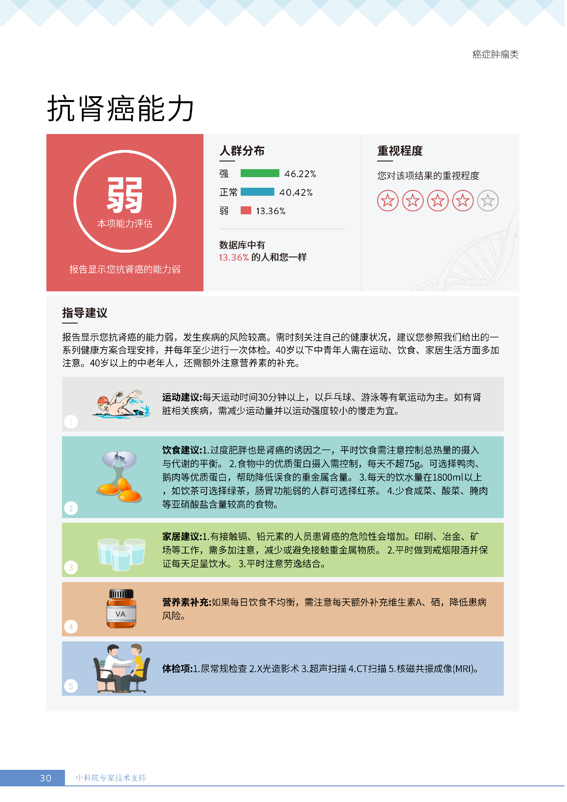 就像下面王女士的报告所呈现的:她抗胃癌、肾癌、胆囊癌等 9 项癌症的能力较弱,其中抗肾癌能力弱的人群占比仅 13.36%,抗甲状腺癌弱的人群占比更是低至 10.55%—— 这些风险若不靠筛查,单靠日常体感根本无法察觉。试想,若未通过基因筛查发现抗胃癌能力弱,可能就不会重视幽门螺杆菌检测,也不会刻意控制高蛋白摄入;若不知抗肾癌能力薄弱,或许仍会忽视重金属接触风险,也不会有意识地保证每日 1800ml 饮水。正是筛查,让这些 “看不见的风险” 变成了 “可应对的目标”,避免了在健康盲区里被动承受风险。