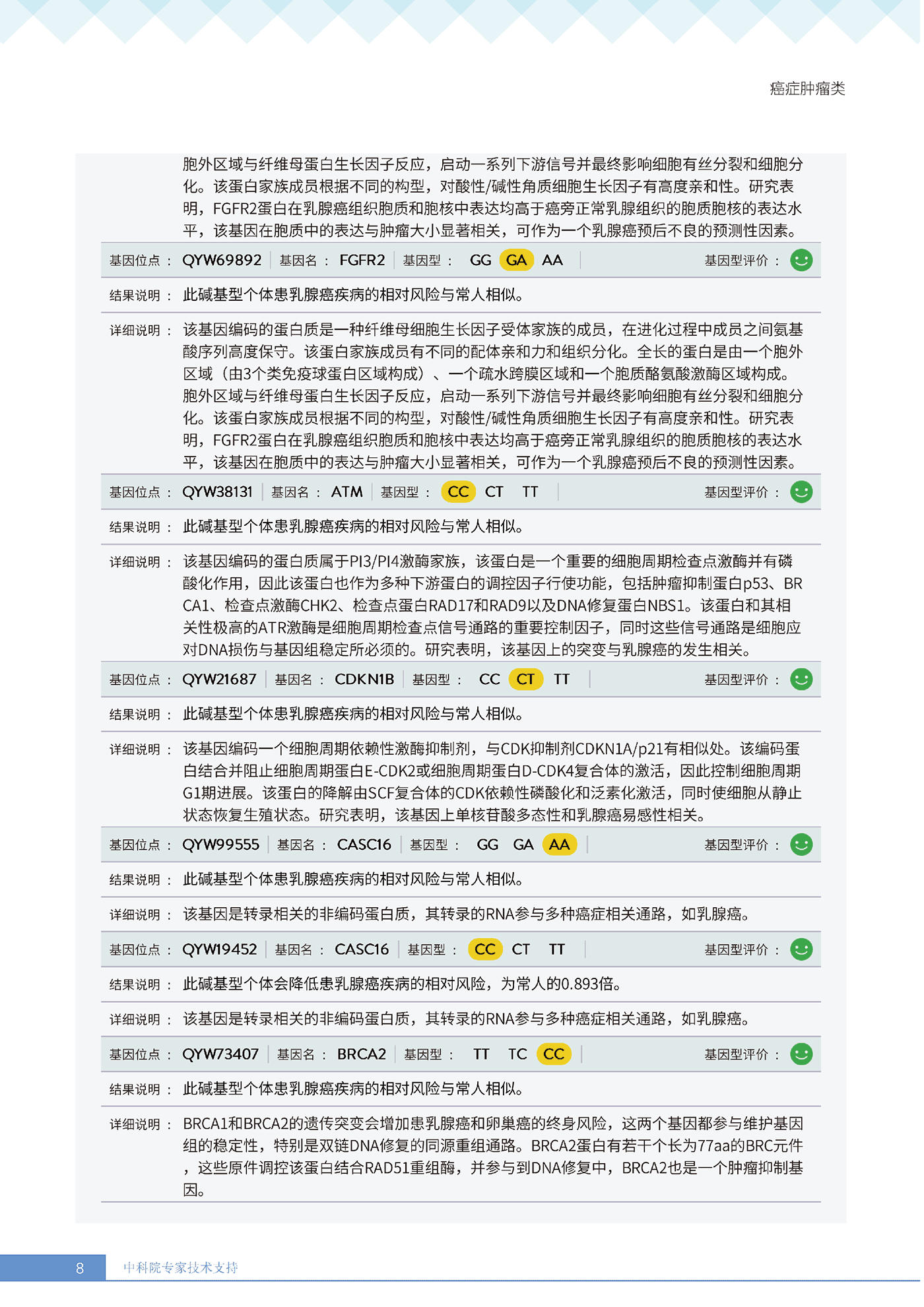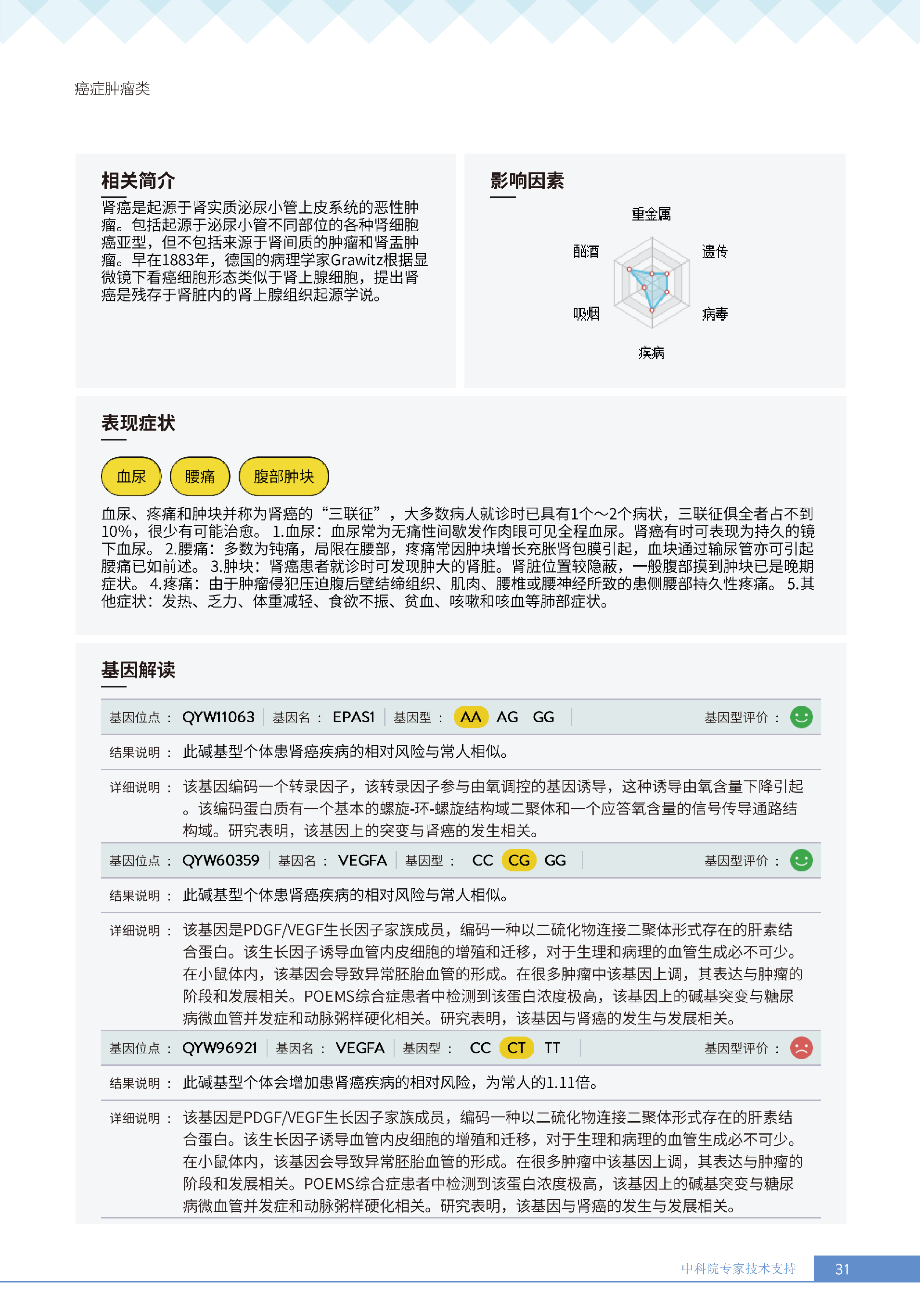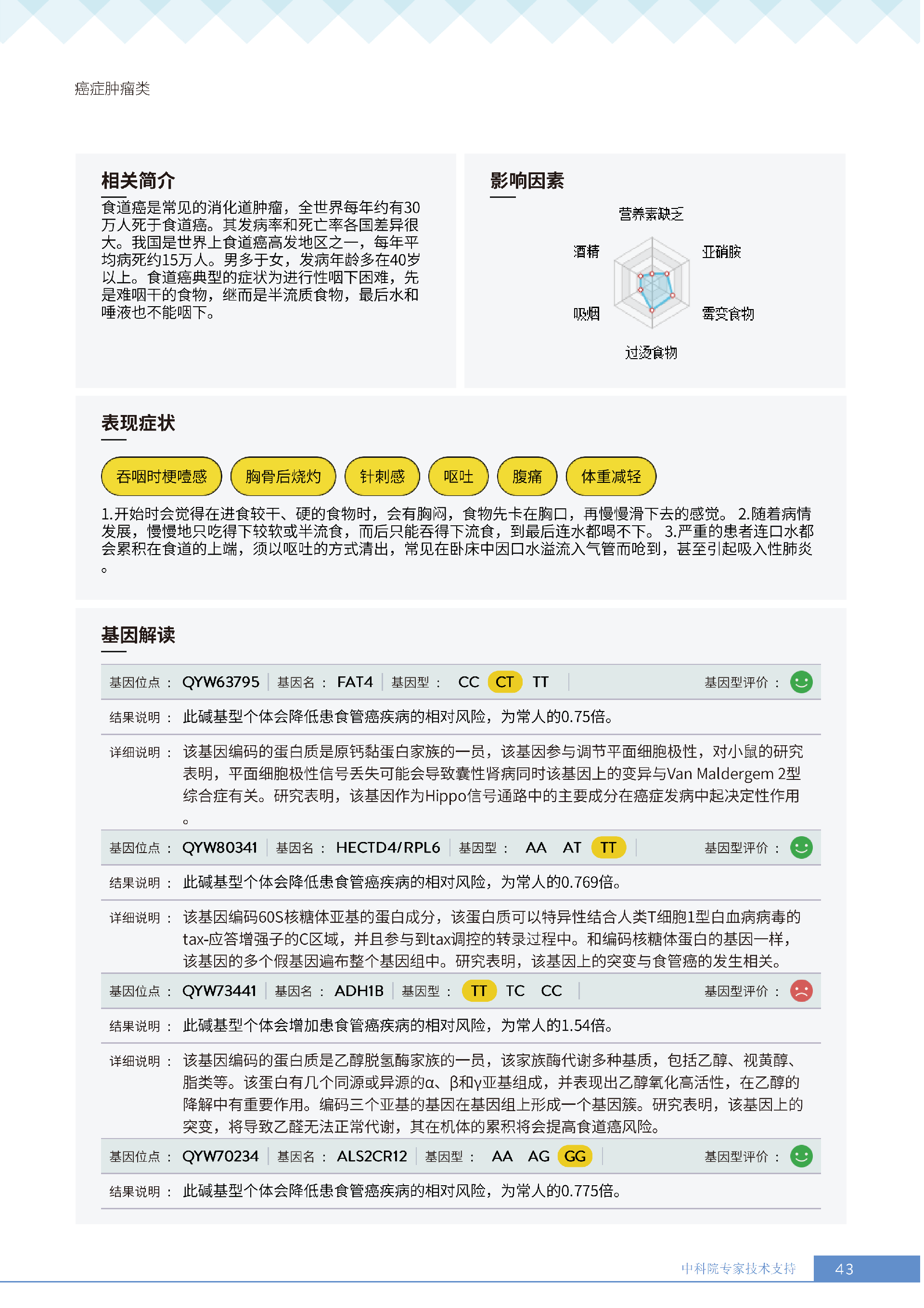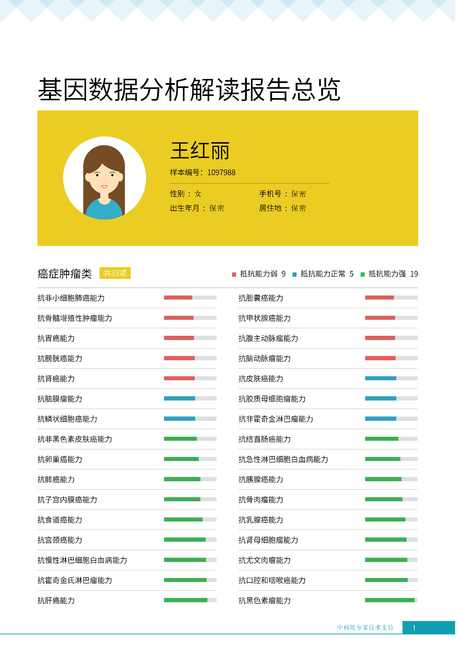 就像下面王女士的报告所呈现的:她抗胃癌、肾癌、胆囊癌等 9 项癌症的能力较弱,其中抗肾癌能力弱的人群占比仅 13.36%,抗甲状腺癌弱的人群占比更是低至 10.55%—— 这些风险若不靠筛查,单靠日常体感根本无法察觉。试想,若未通过基因筛查发现抗胃癌能力弱,可能就不会重视幽门螺杆菌检测,也不会刻意控制高蛋白摄入;若不知抗肾癌能力薄弱,或许仍会忽视重金属接触风险,也不会有意识地保证每日 1800ml 饮水。正是筛查,让这些 “看不见的风险” 变成了 “可应对的目标”,避免了在健康盲区里被动承受风险。