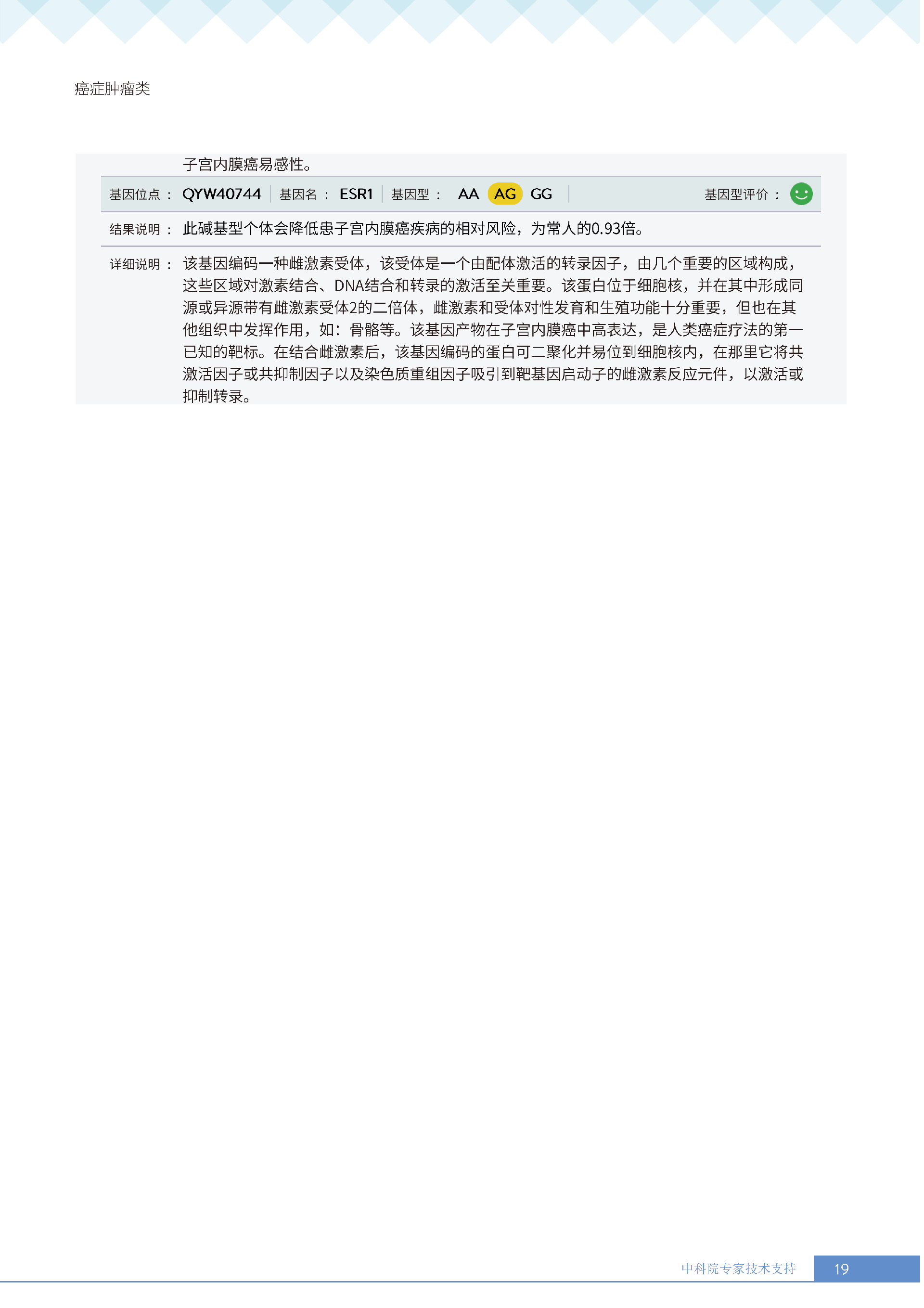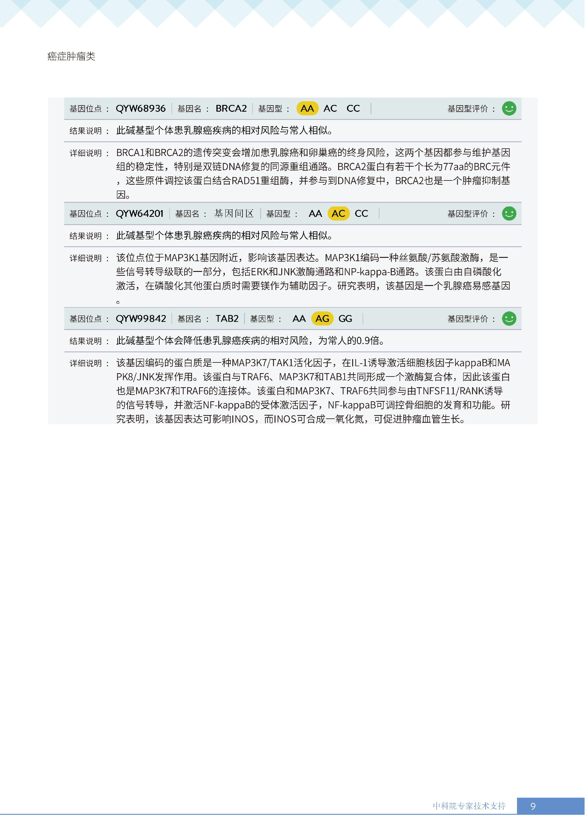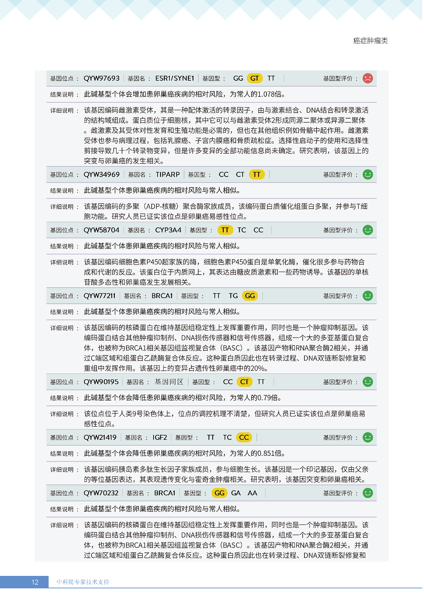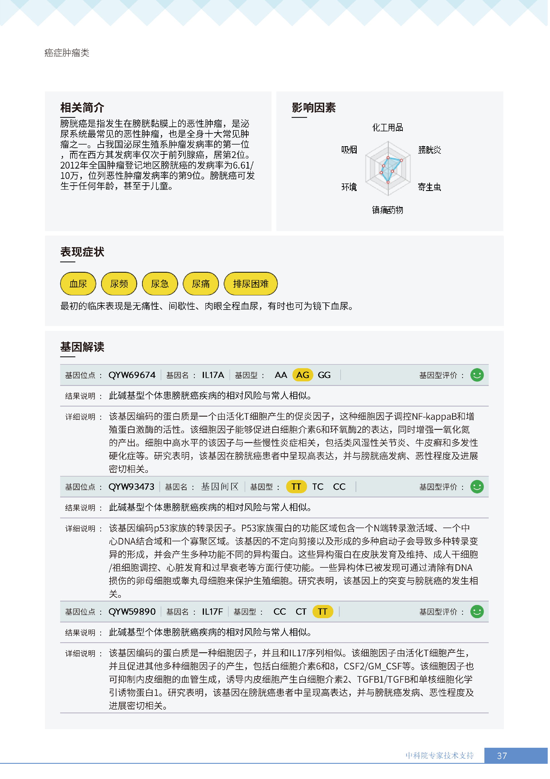 就像下面王女士的报告所呈现的:她抗胃癌、肾癌、胆囊癌等 9 项癌症的能力较弱,其中抗肾癌能力弱的人群占比仅 13.36%,抗甲状腺癌弱的人群占比更是低至 10.55%—— 这些风险若不靠筛查,单靠日常体感根本无法察觉。试想,若未通过基因筛查发现抗胃癌能力弱,可能就不会重视幽门螺杆菌检测,也不会刻意控制高蛋白摄入;若不知抗肾癌能力薄弱,或许仍会忽视重金属接触风险,也不会有意识地保证每日 1800ml 饮水。正是筛查,让这些 “看不见的风险” 变成了 “可应对的目标”,避免了在健康盲区里被动承受风险。