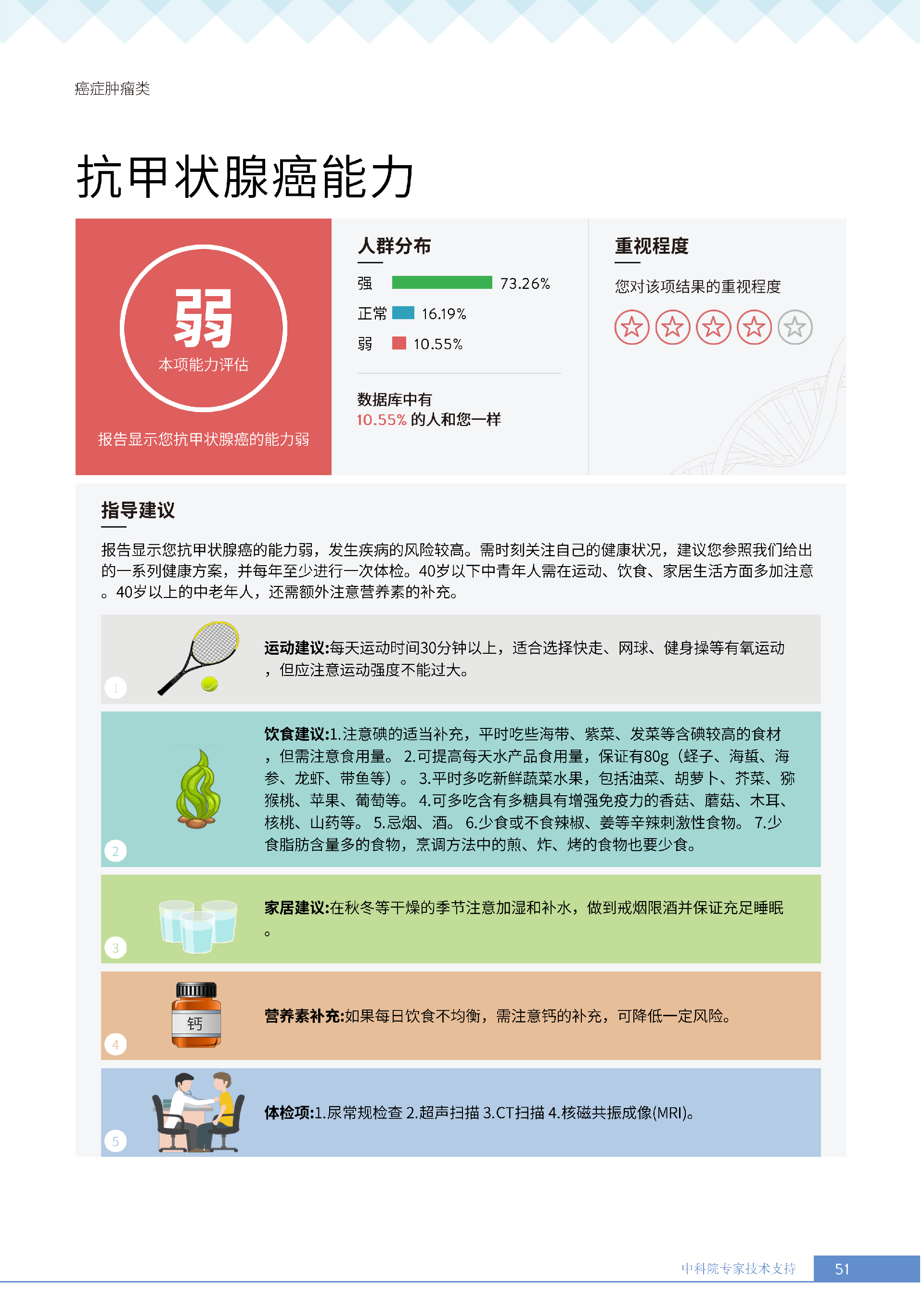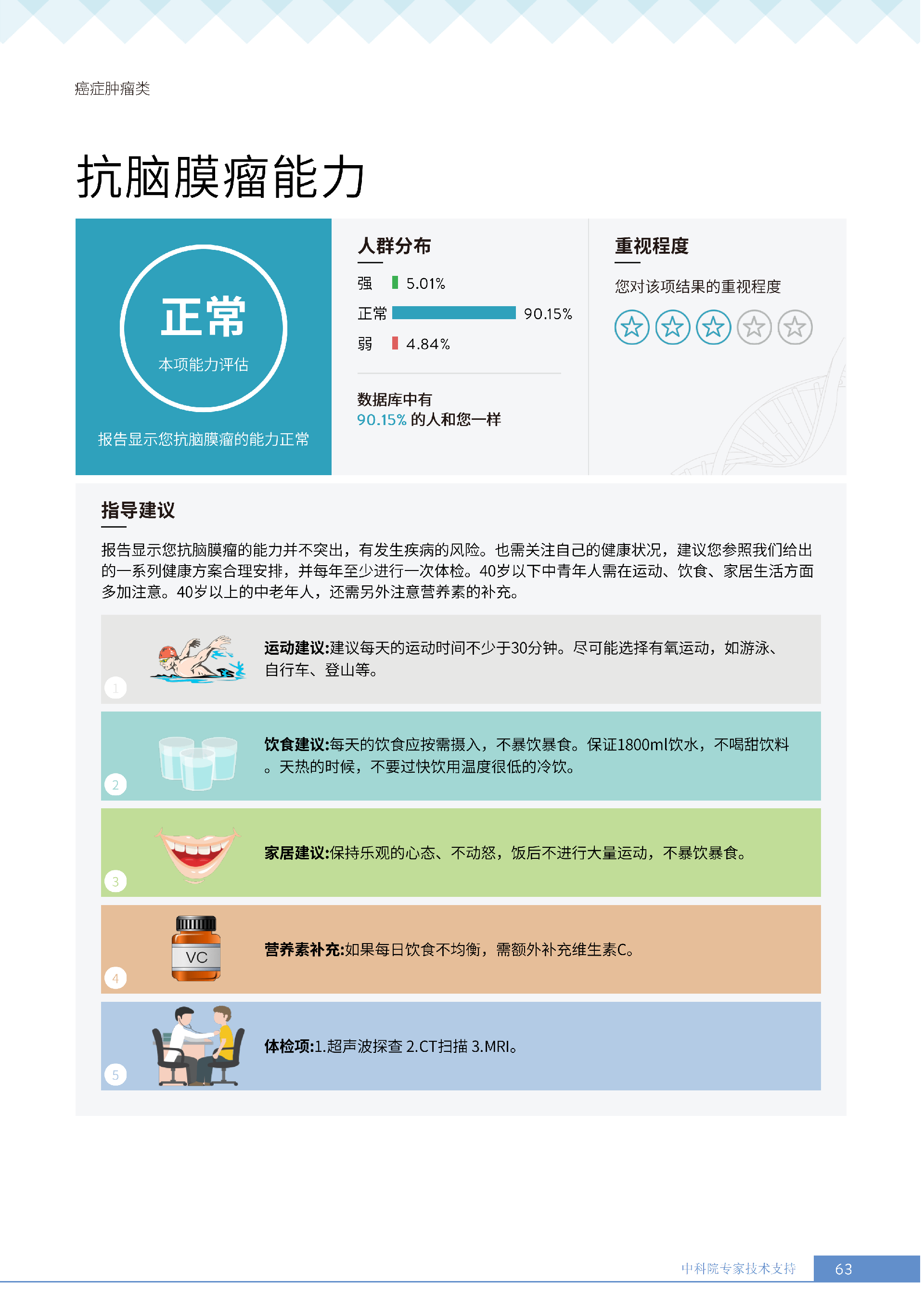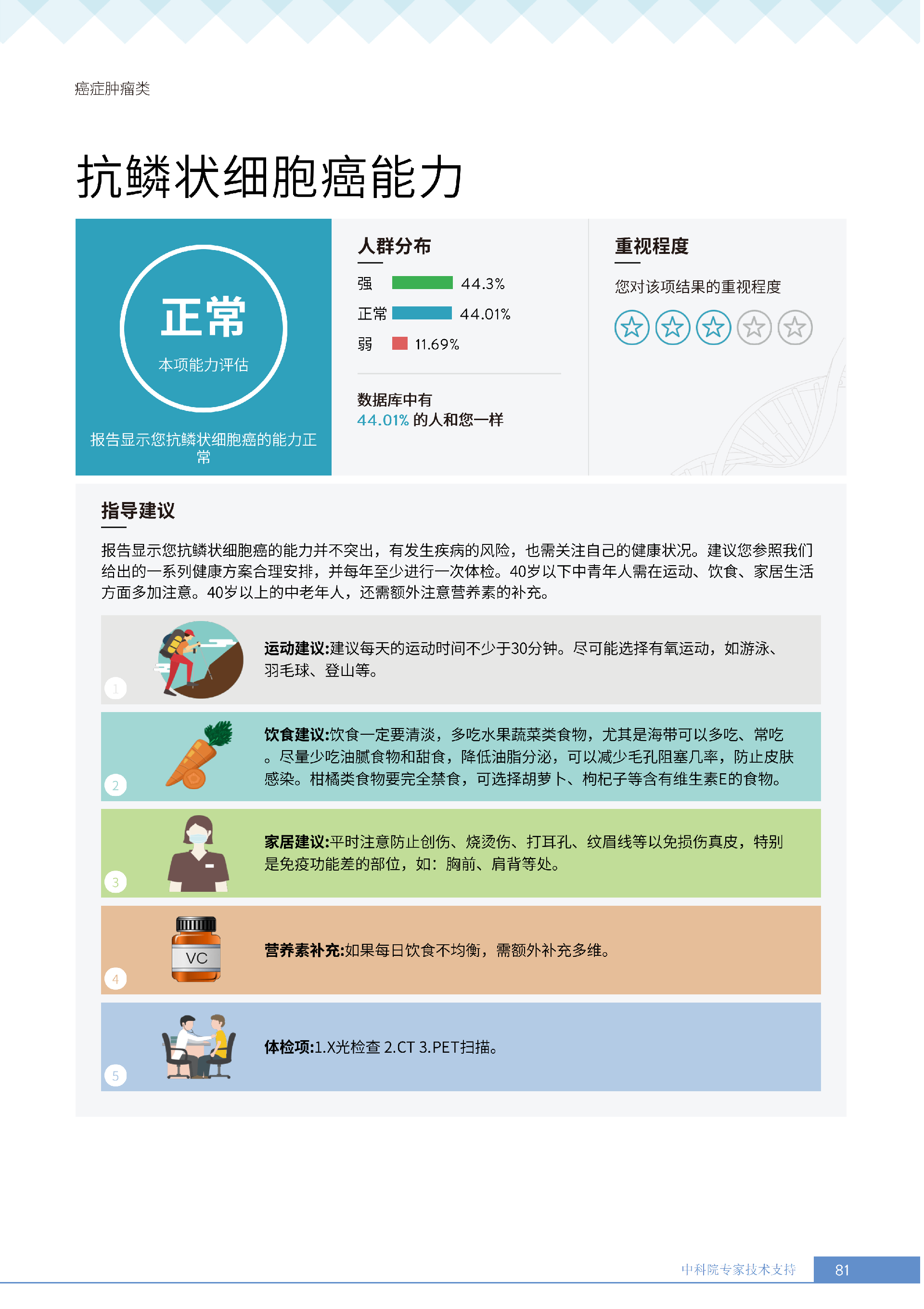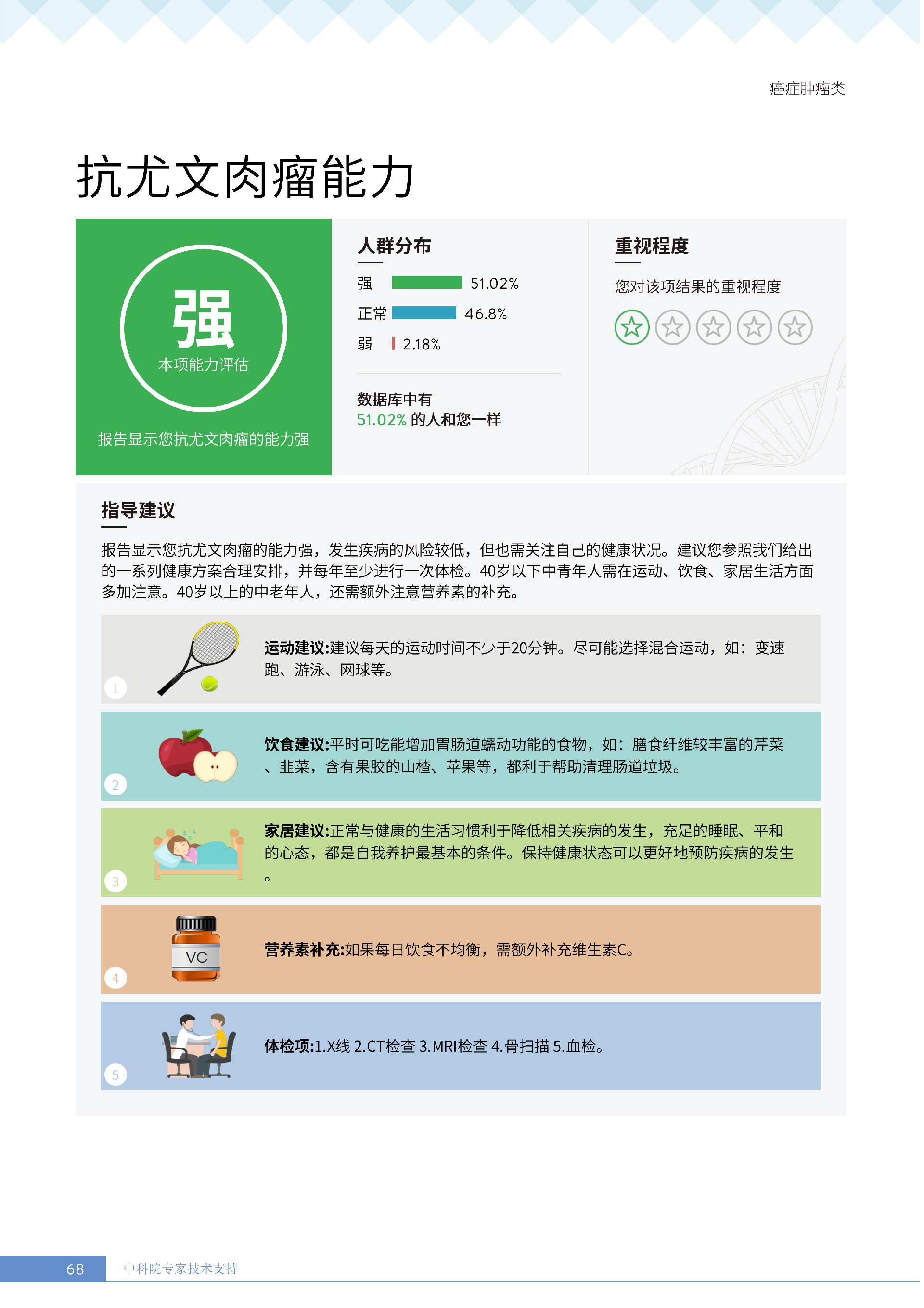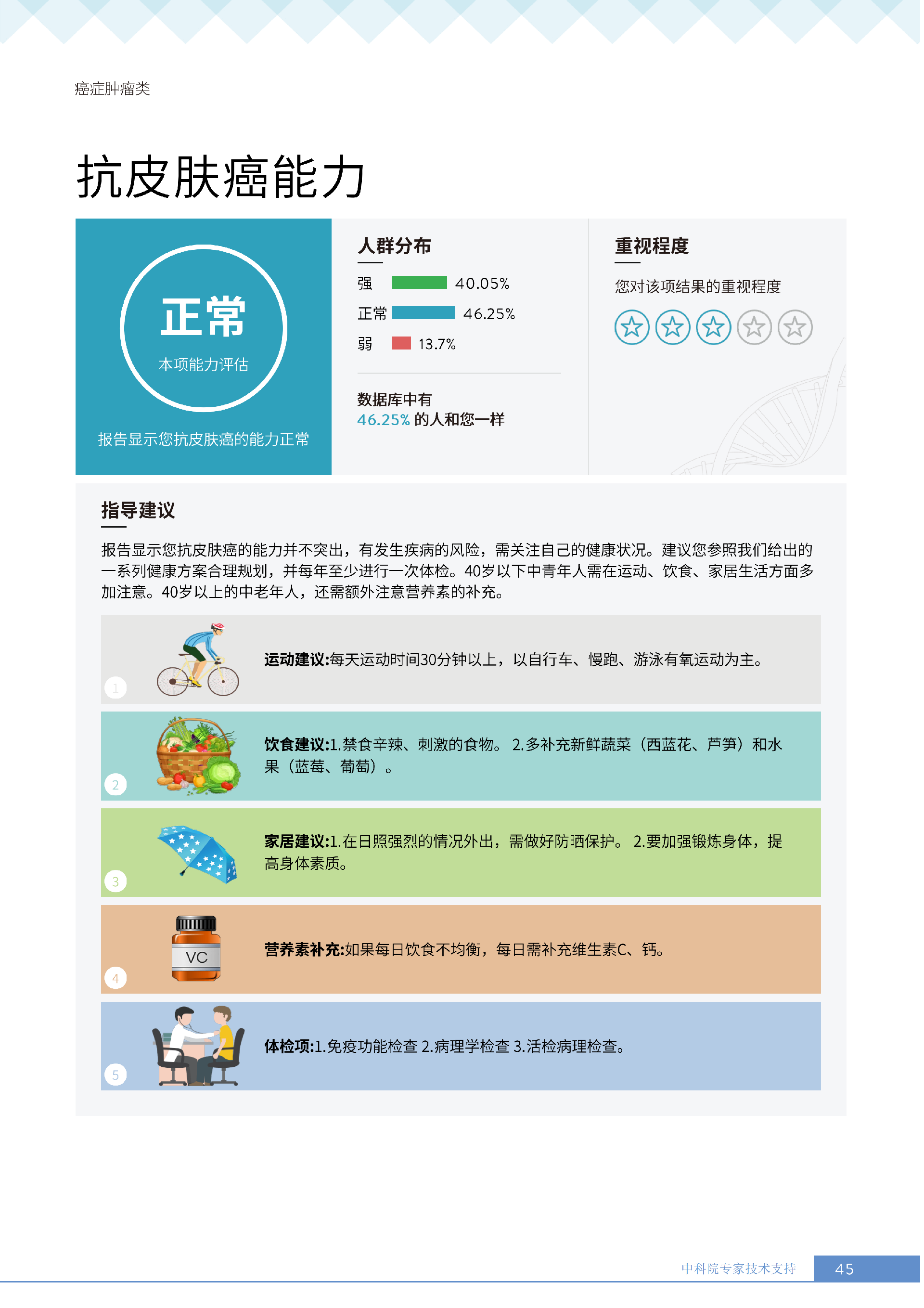 更重要的是,癌症筛查能精准适配个体差异,避免 “一刀切” 的盲目预防。有人像王女士一样,抗黑色素瘤能力强(88.61% 人群同水平),筛查能帮她明确 “无需过度焦虑此项”,可将精力放在薄弱项上;有人可能抗肺癌能力弱,筛查则会提示避免空气污染、定期做肺部 CT—— 它不是让所有人都陷入 “恐癌焦虑”,而是基于每个人的基因、年龄、生活环境等,画出 “个性化风险地图”,让预防有重点、干预有方向。
