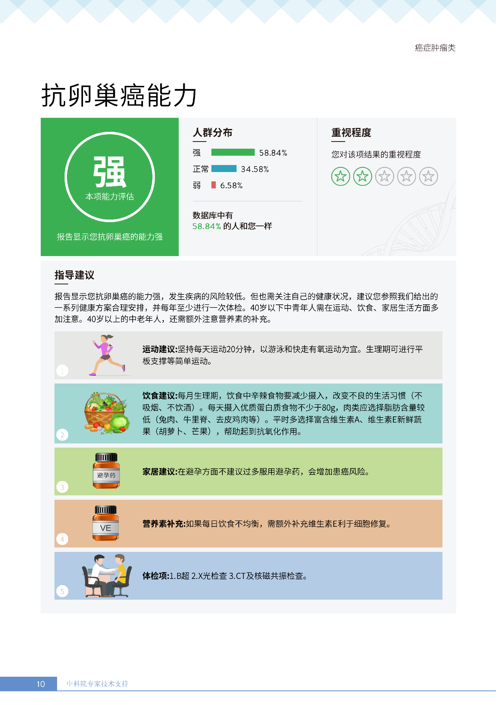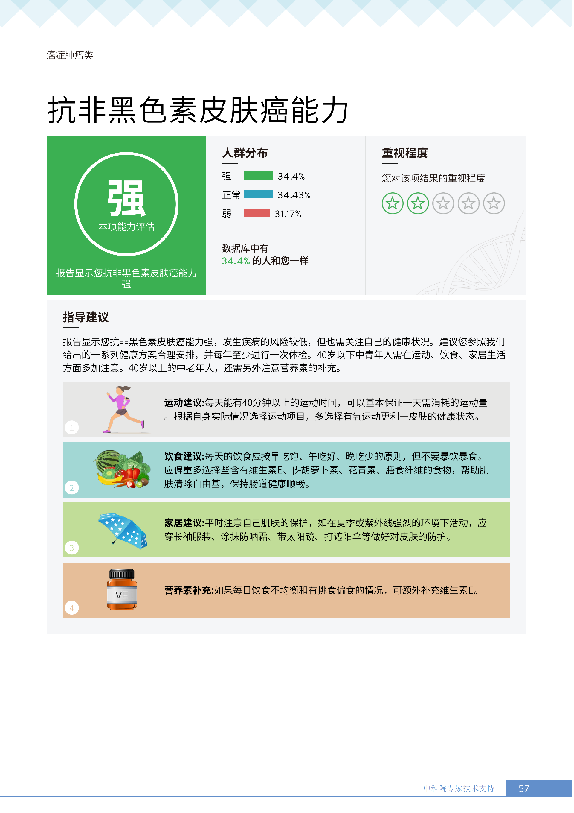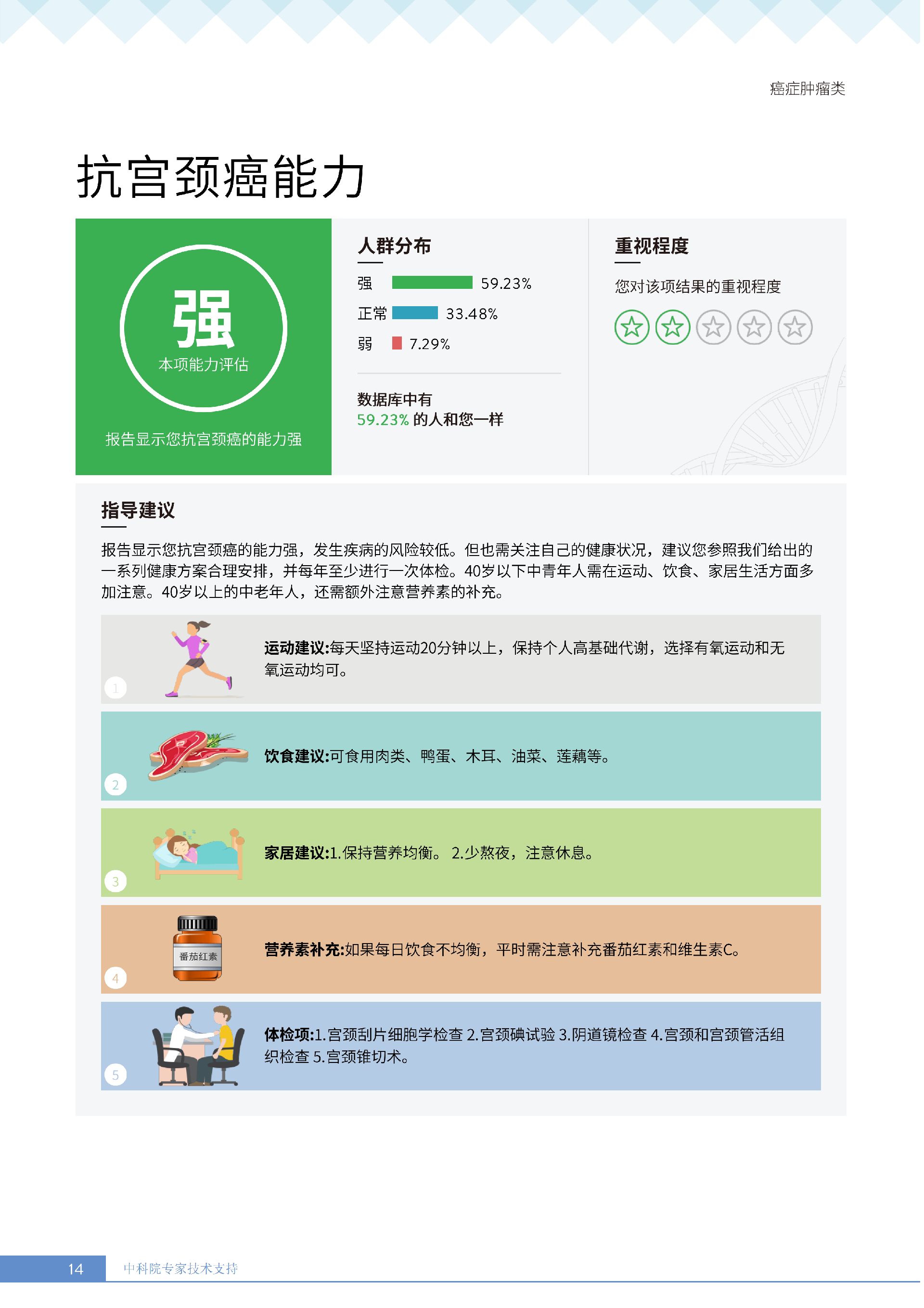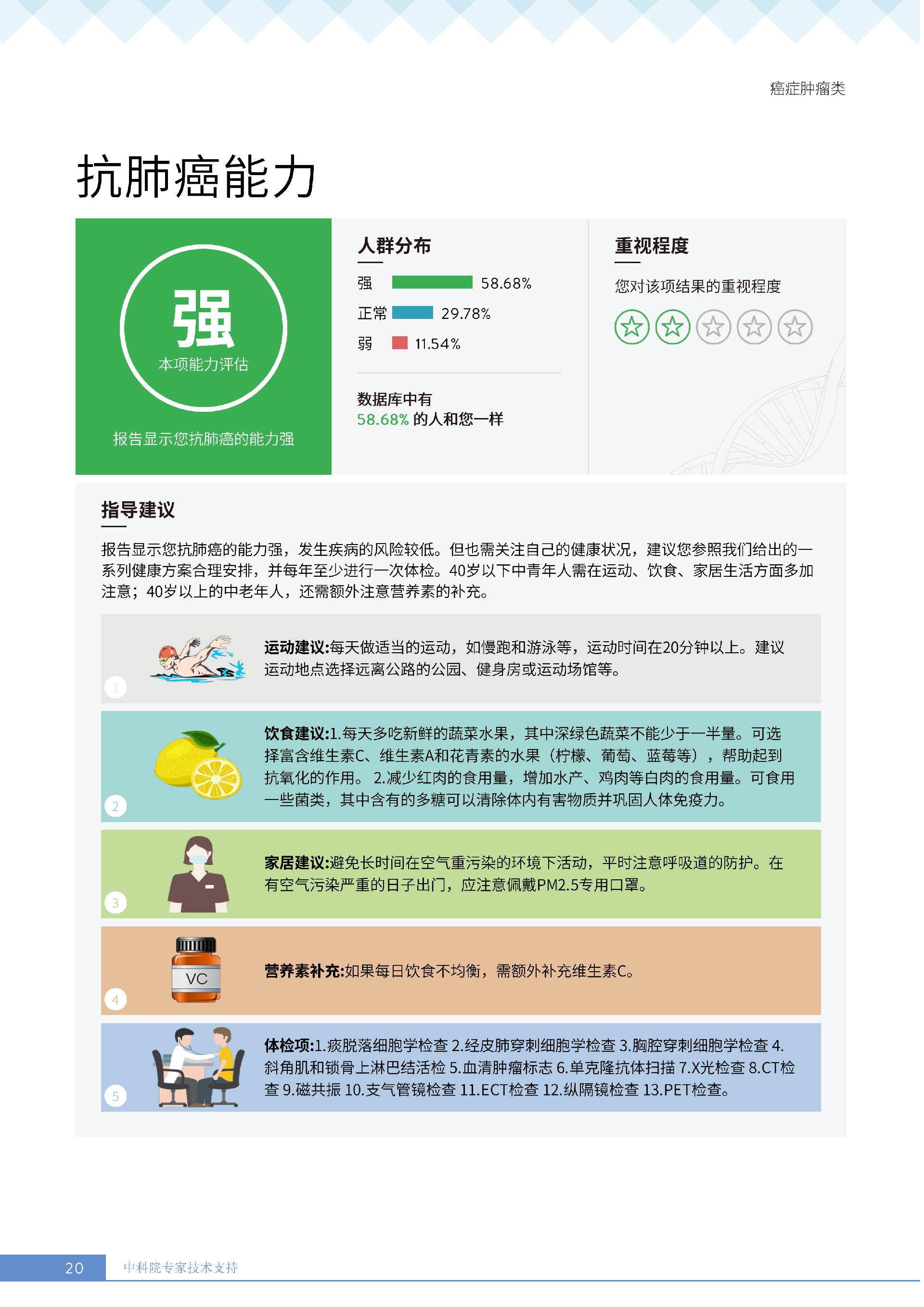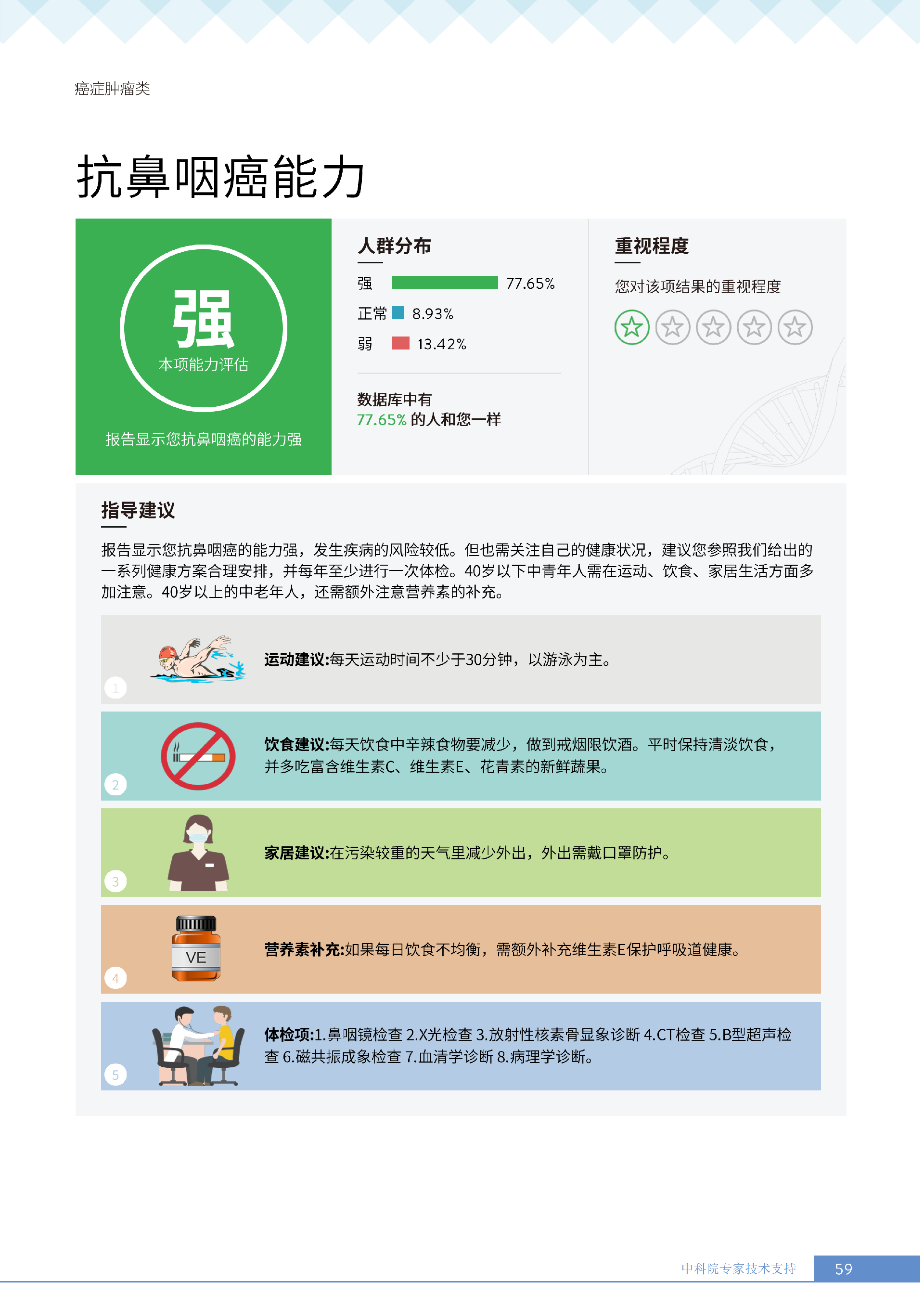 更重要的是,癌症筛查能精准适配个体差异,避免 “一刀切” 的盲目预防。有人像王女士一样,抗黑色素瘤能力强(88.61% 人群同水平),筛查能帮她明确 “无需过度焦虑此项”,可将精力放在薄弱项上;有人可能抗肺癌能力弱,筛查则会提示避免空气污染、定期做肺部 CT—— 它不是让所有人都陷入 “恐癌焦虑”,而是基于每个人的基因、年龄、生活环境等,画出 “个性化风险地图”,让预防有重点、干预有方向。