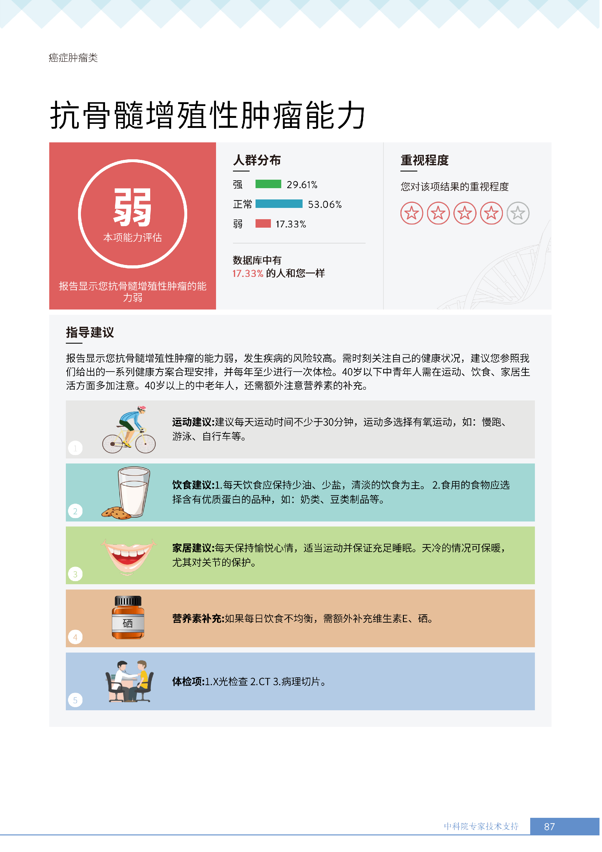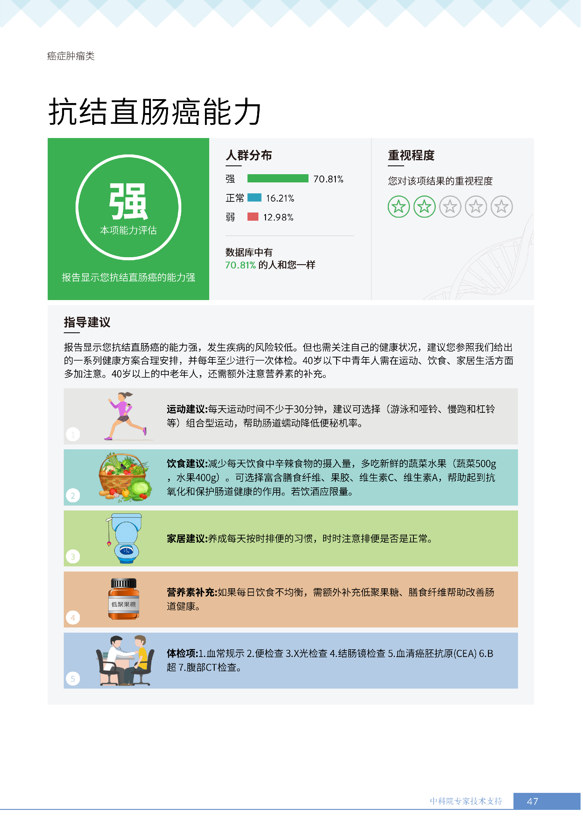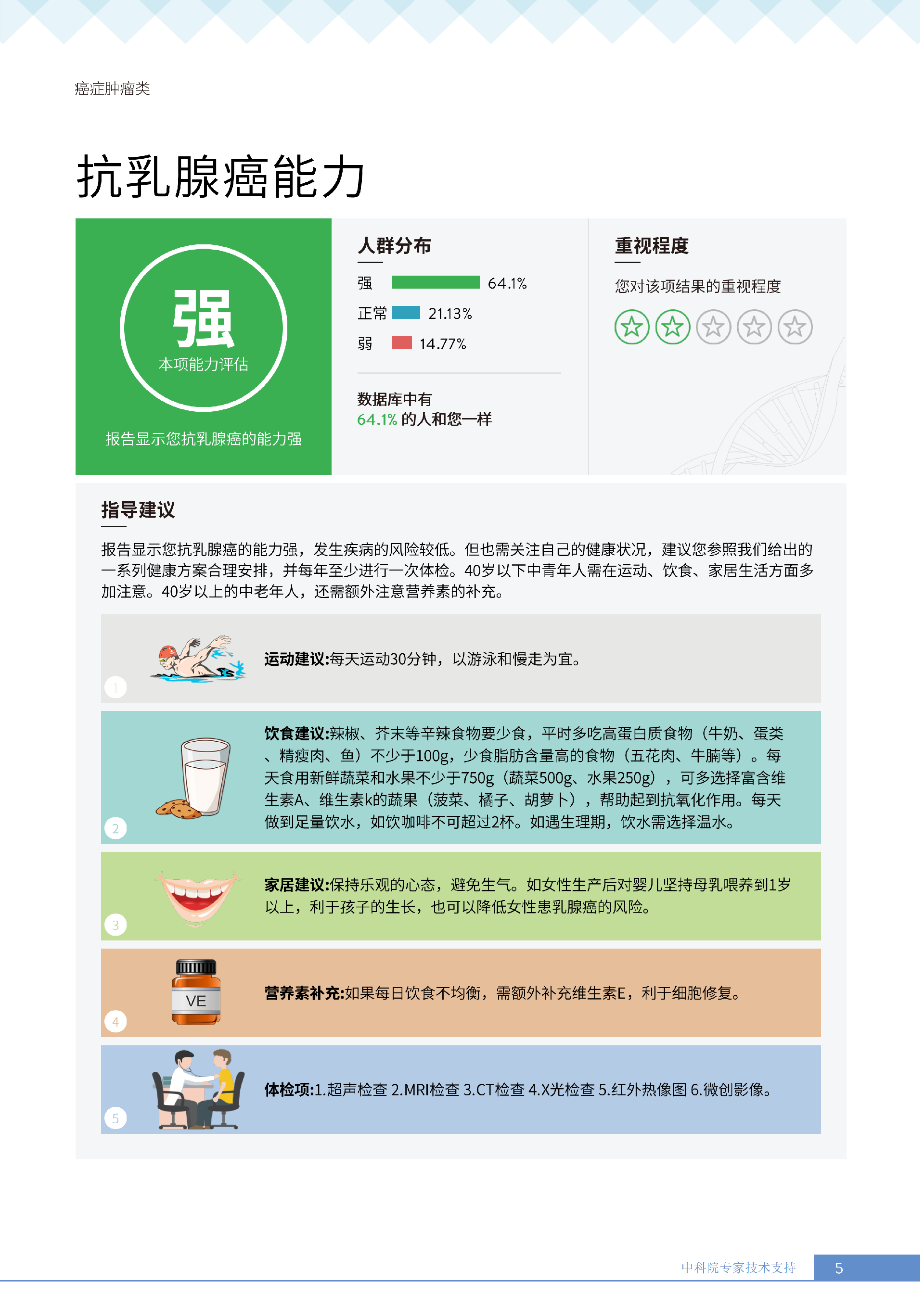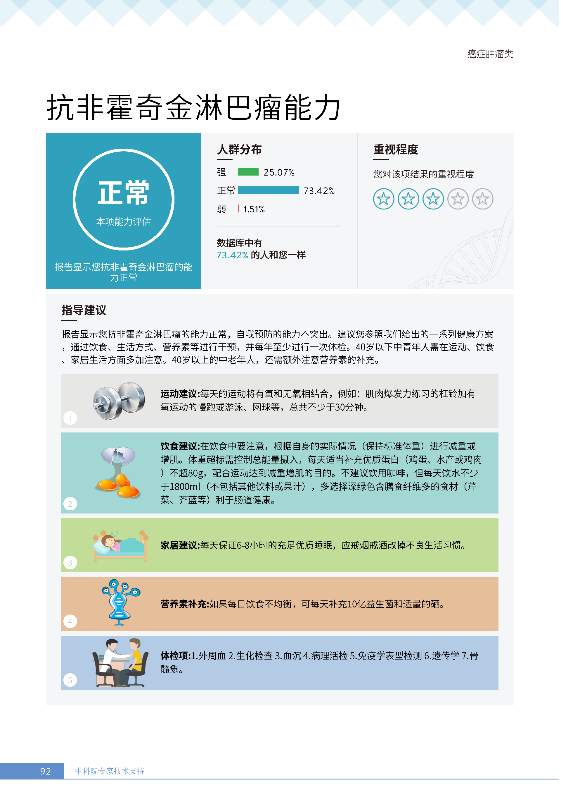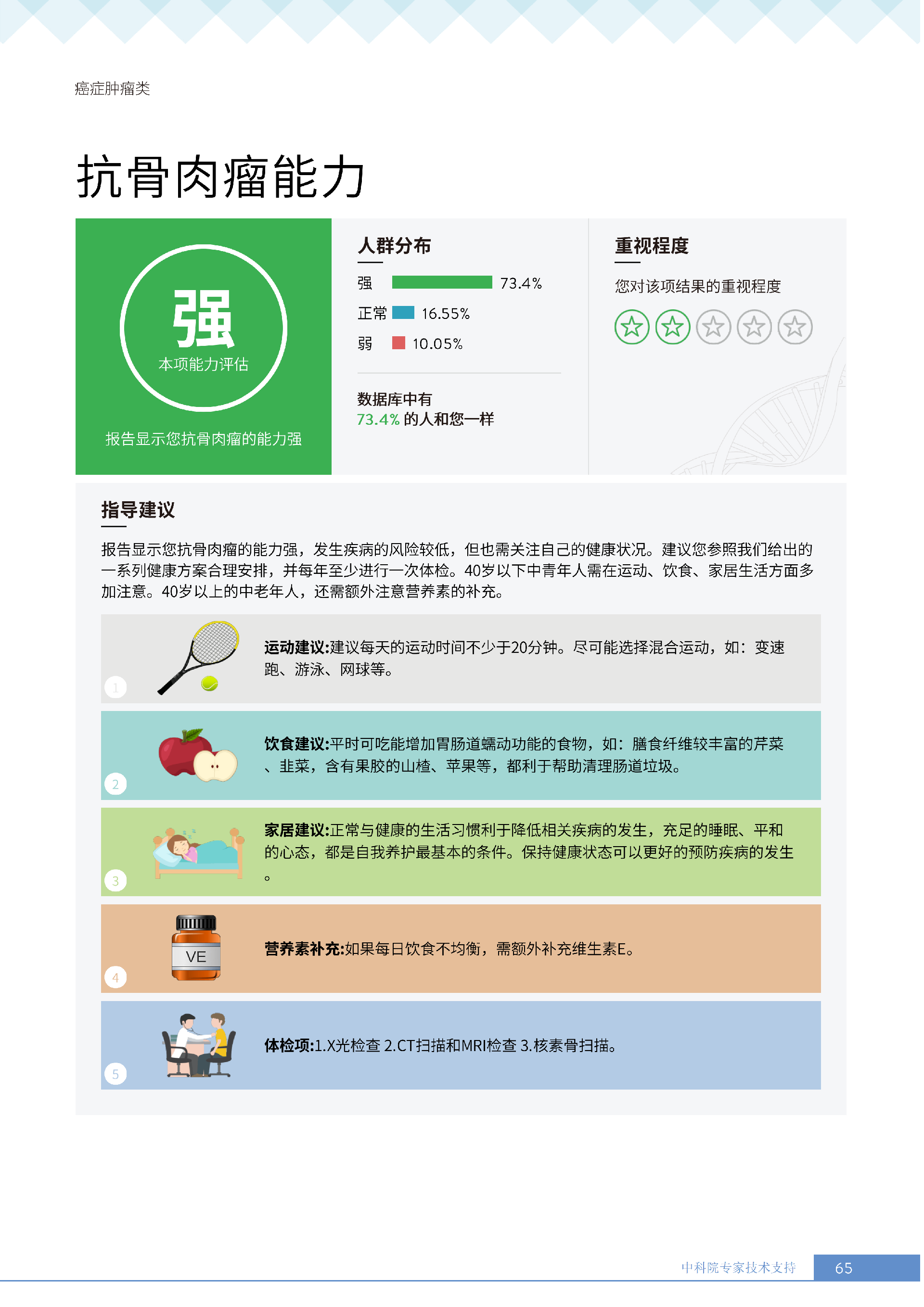 更重要的是,癌症筛查能精准适配个体差异,避免 “一刀切” 的盲目预防。有人像王女士一样,抗黑色素瘤能力强(88.61% 人群同水平),筛查能帮她明确 “无需过度焦虑此项”,可将精力放在薄弱项上;有人可能抗肺癌能力弱,筛查则会提示避免空气污染、定期做肺部 CT—— 它不是让所有人都陷入 “恐癌焦虑”,而是基于每个人的基因、年龄、生活环境等,画出 “个性化风险地图”,让预防有重点、干预有方向。