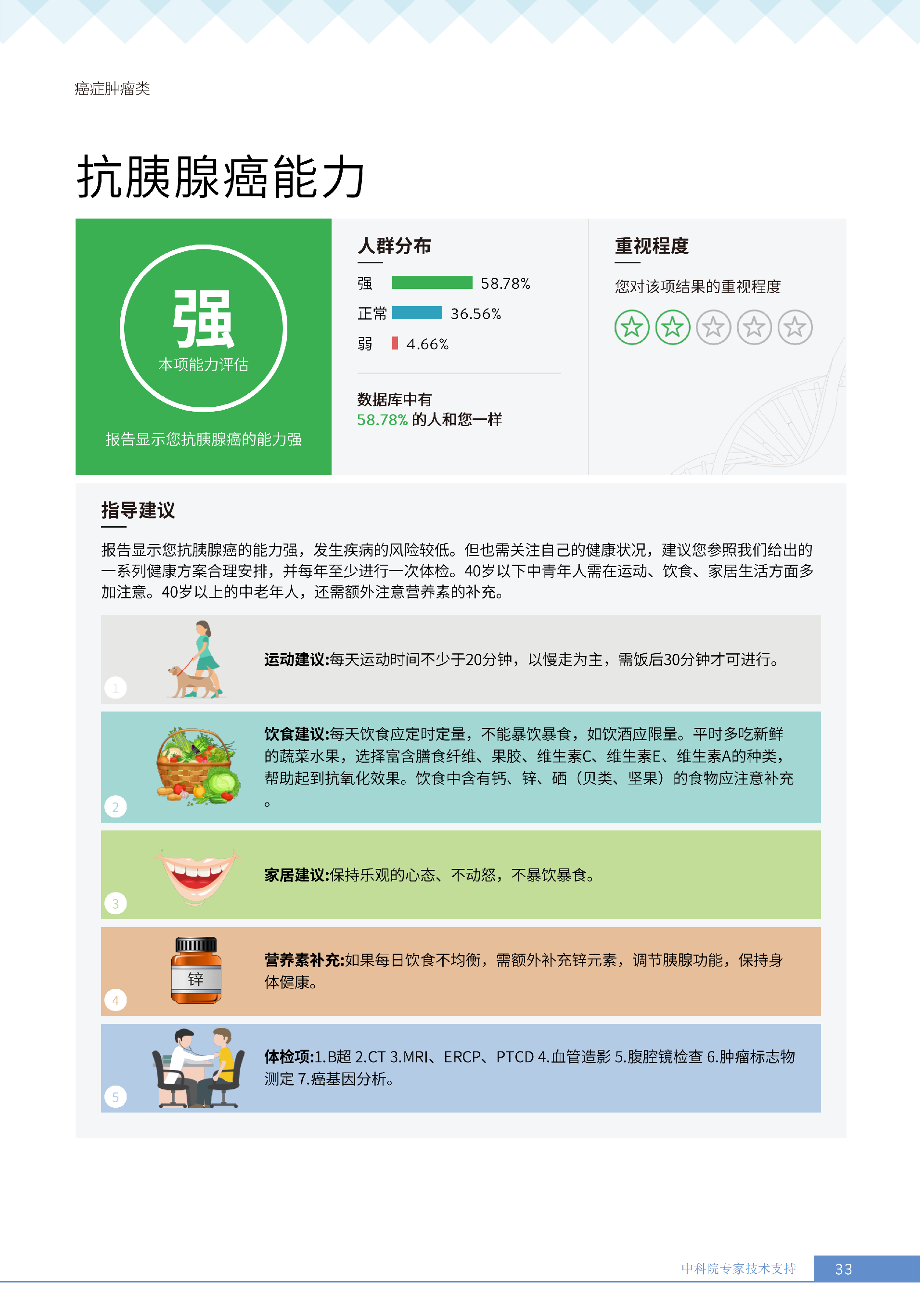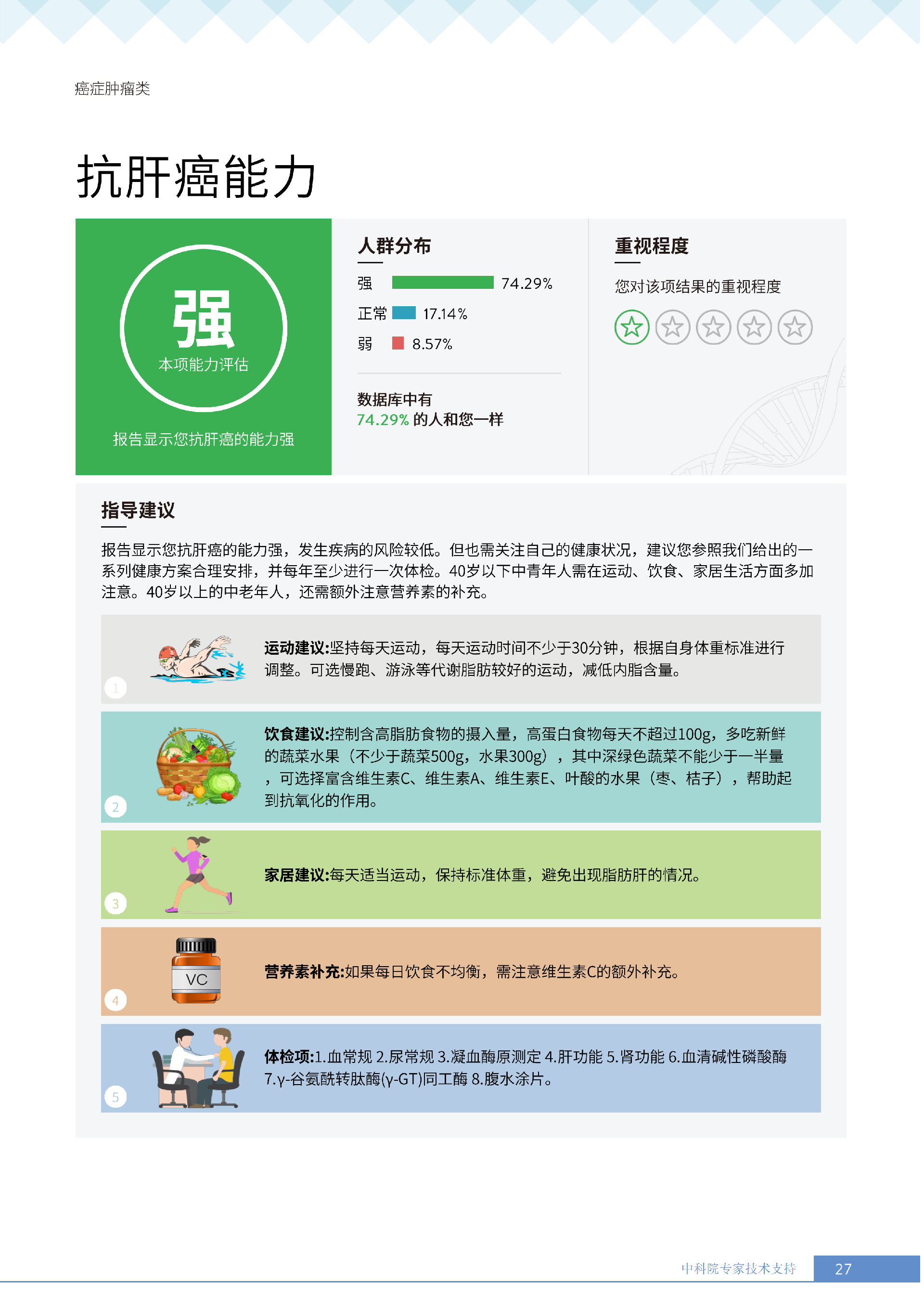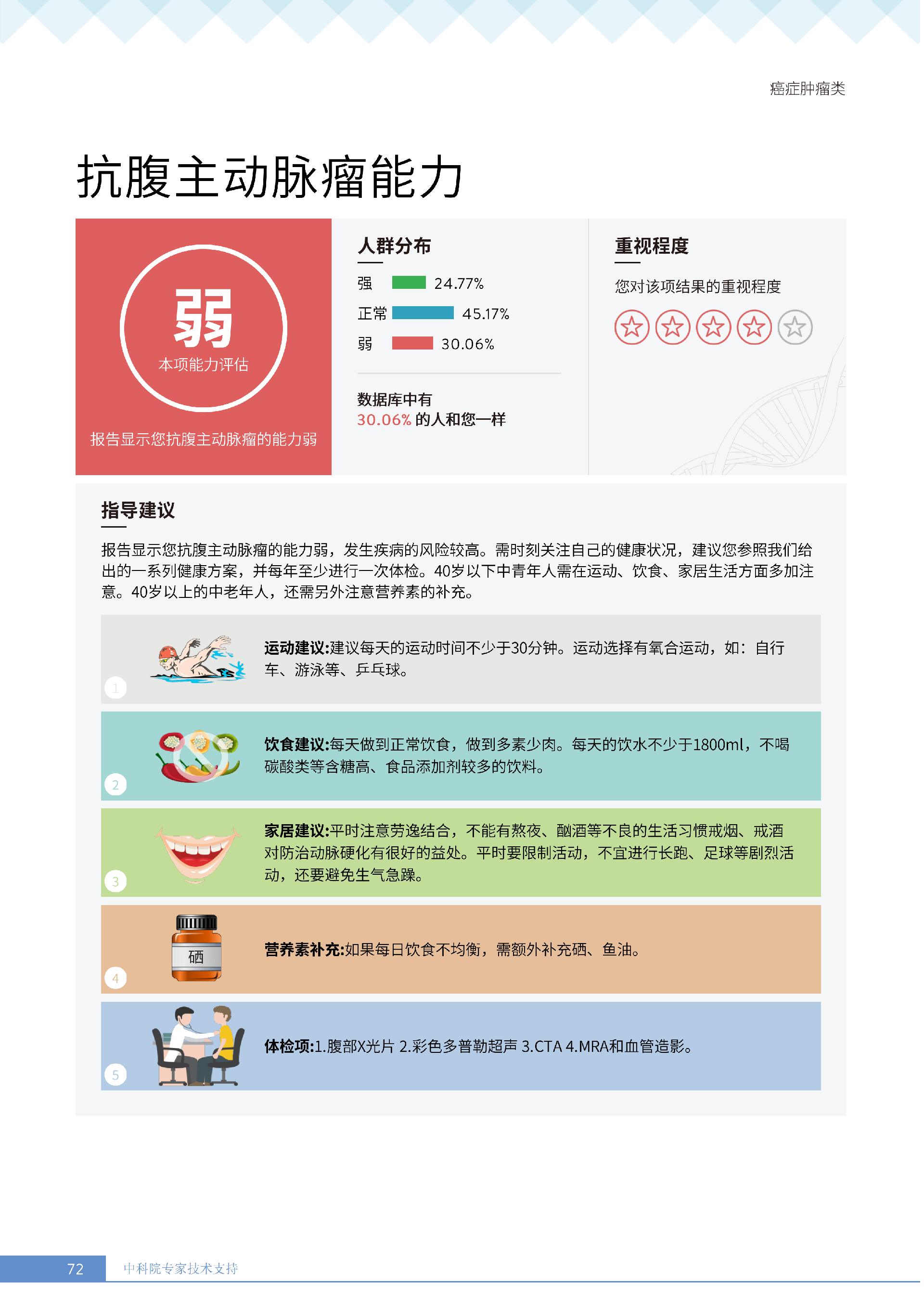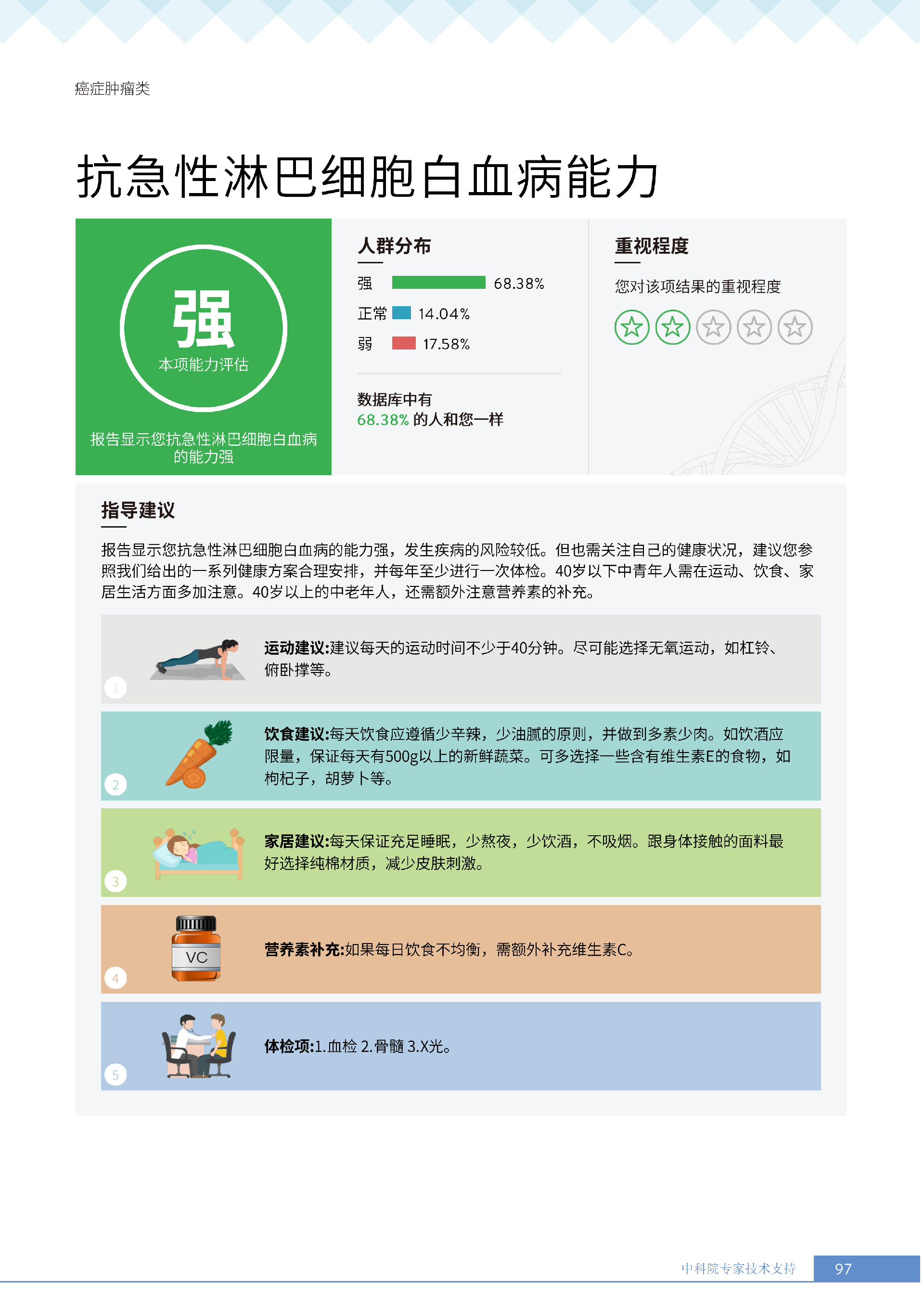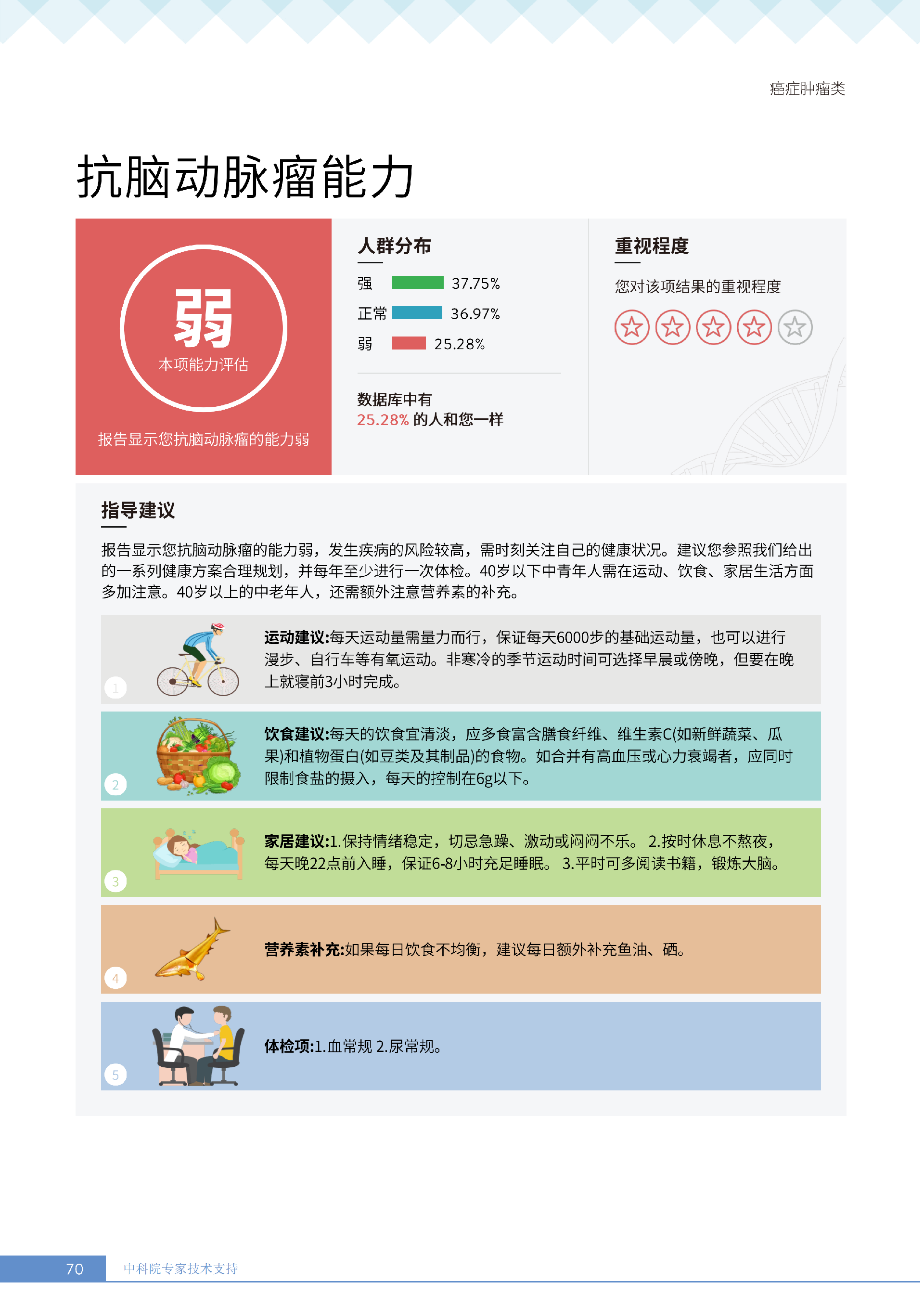 更重要的是,癌症筛查能精准适配个体差异,避免 “一刀切” 的盲目预防。有人像王女士一样,抗黑色素瘤能力强(88.61% 人群同水平),筛查能帮她明确 “无需过度焦虑此项”,可将精力放在薄弱项上;有人可能抗肺癌能力弱,筛查则会提示避免空气污染、定期做肺部 CT—— 它不是让所有人都陷入 “恐癌焦虑”,而是基于每个人的基因、年龄、生活环境等,画出 “个性化风险地图”,让预防有重点、干预有方向。