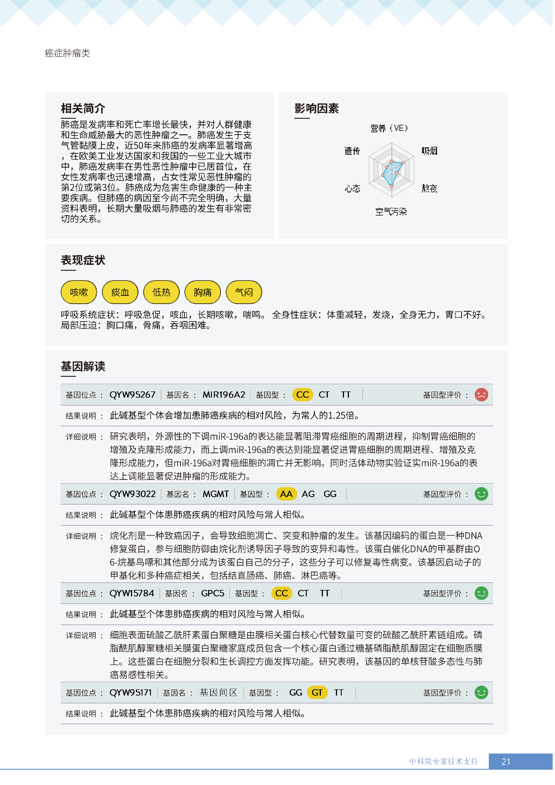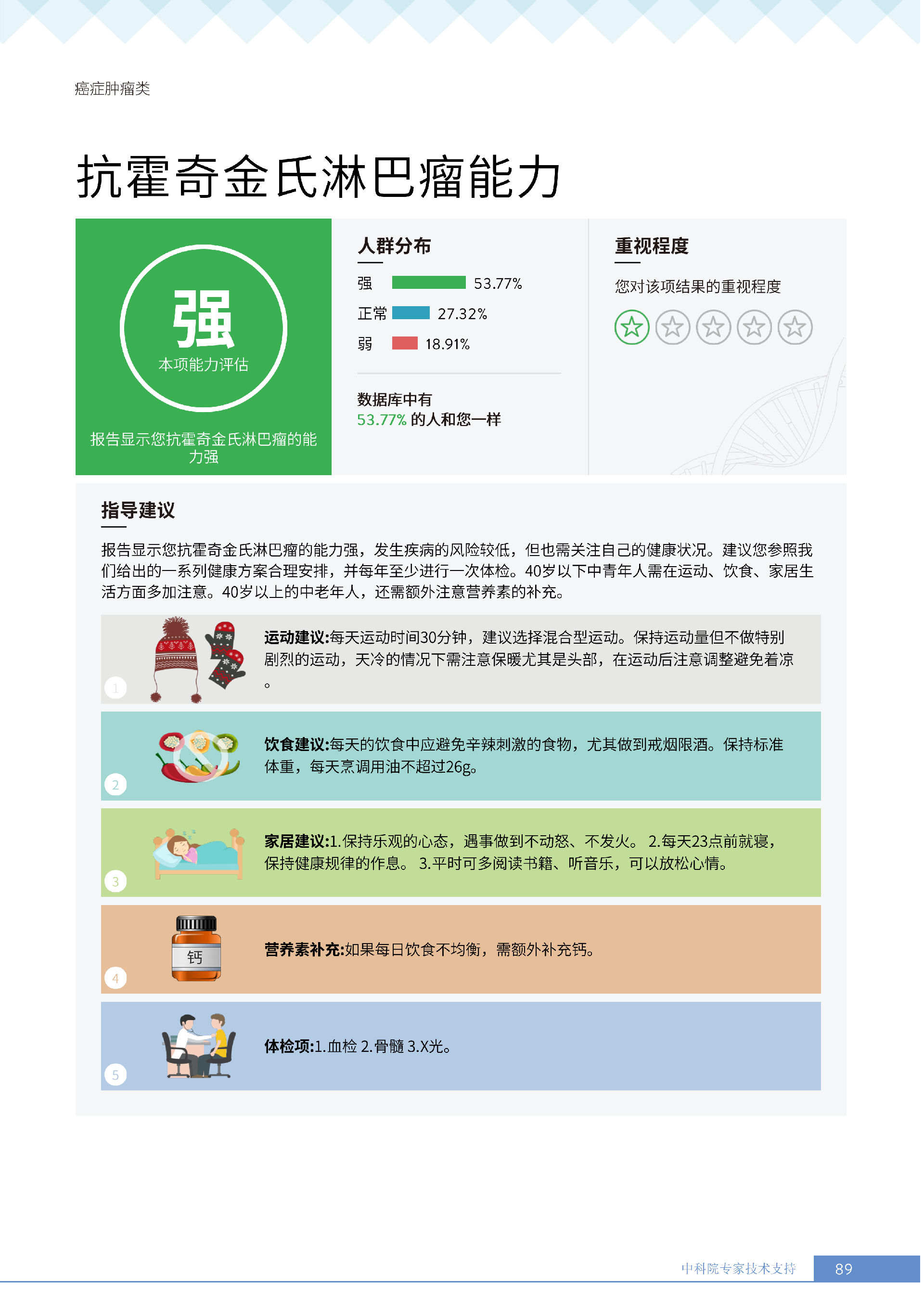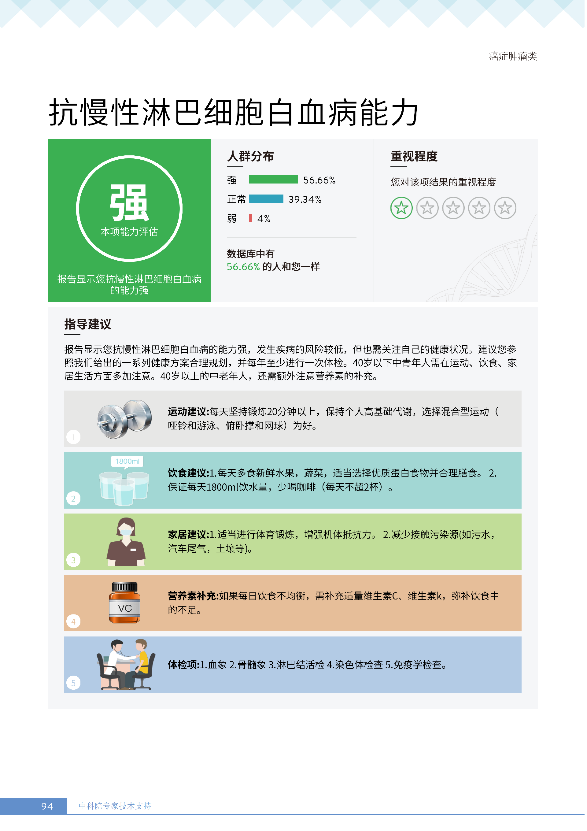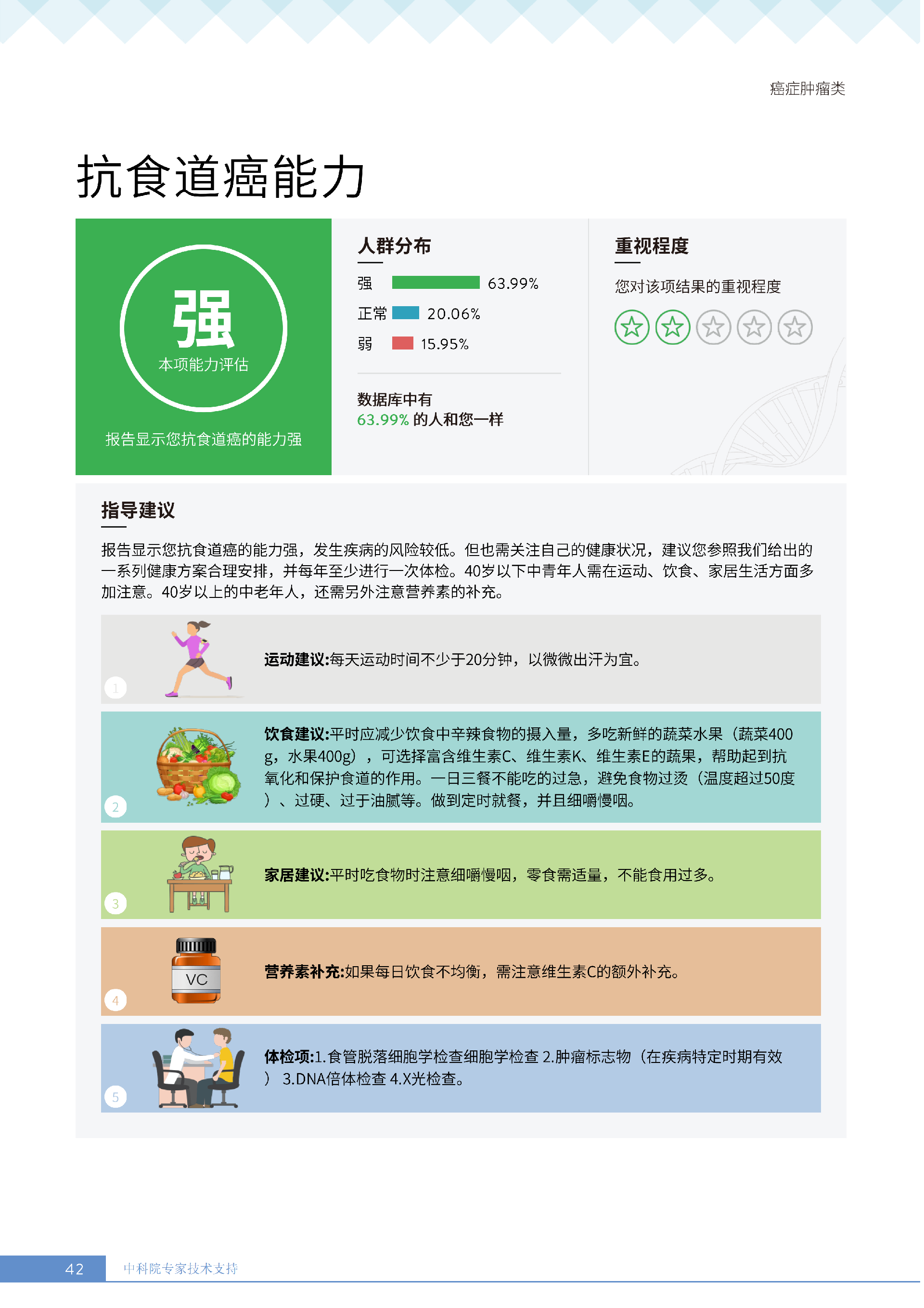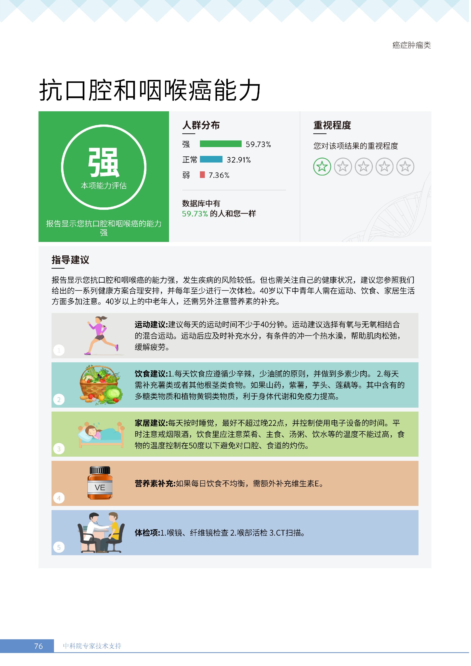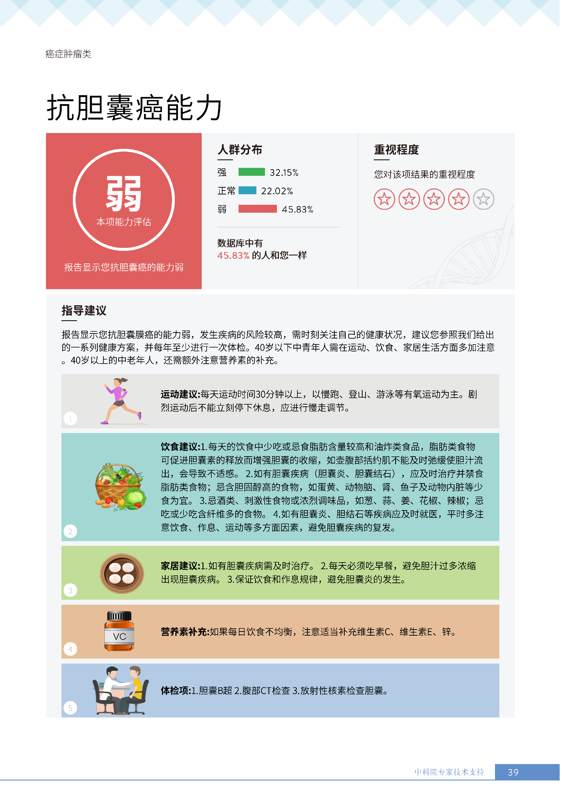 更重要的是,癌症筛查能精准适配个体差异,避免 “一刀切” 的盲目预防。有人像王女士一样,抗黑色素瘤能力强(88.61% 人群同水平),筛查能帮她明确 “无需过度焦虑此项”,可将精力放在薄弱项上;有人可能抗肺癌能力弱,筛查则会提示避免空气污染、定期做肺部 CT—— 它不是让所有人都陷入 “恐癌焦虑”,而是基于每个人的基因、年龄、生活环境等,画出 “个性化风险地图”,让预防有重点、干预有方向。