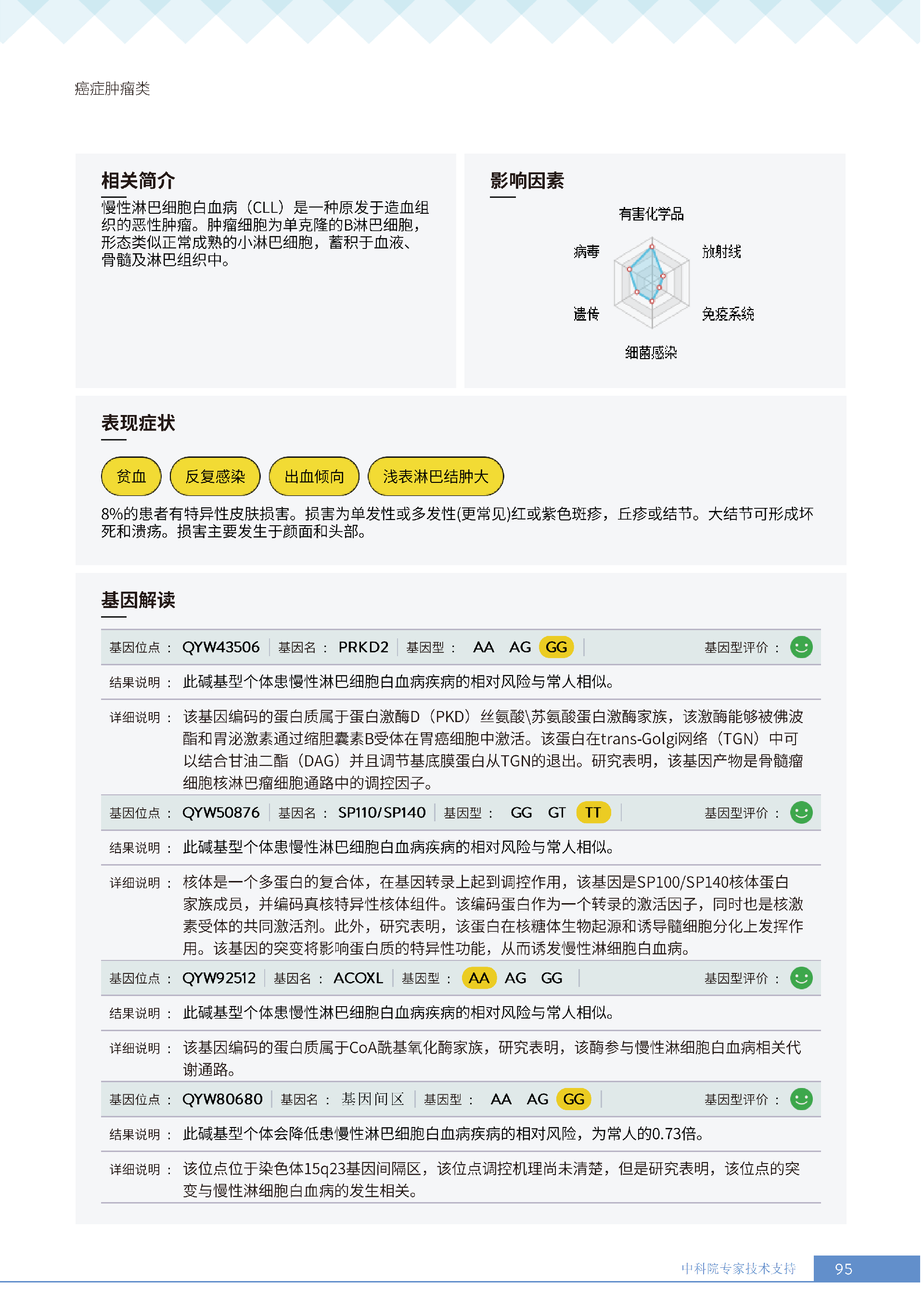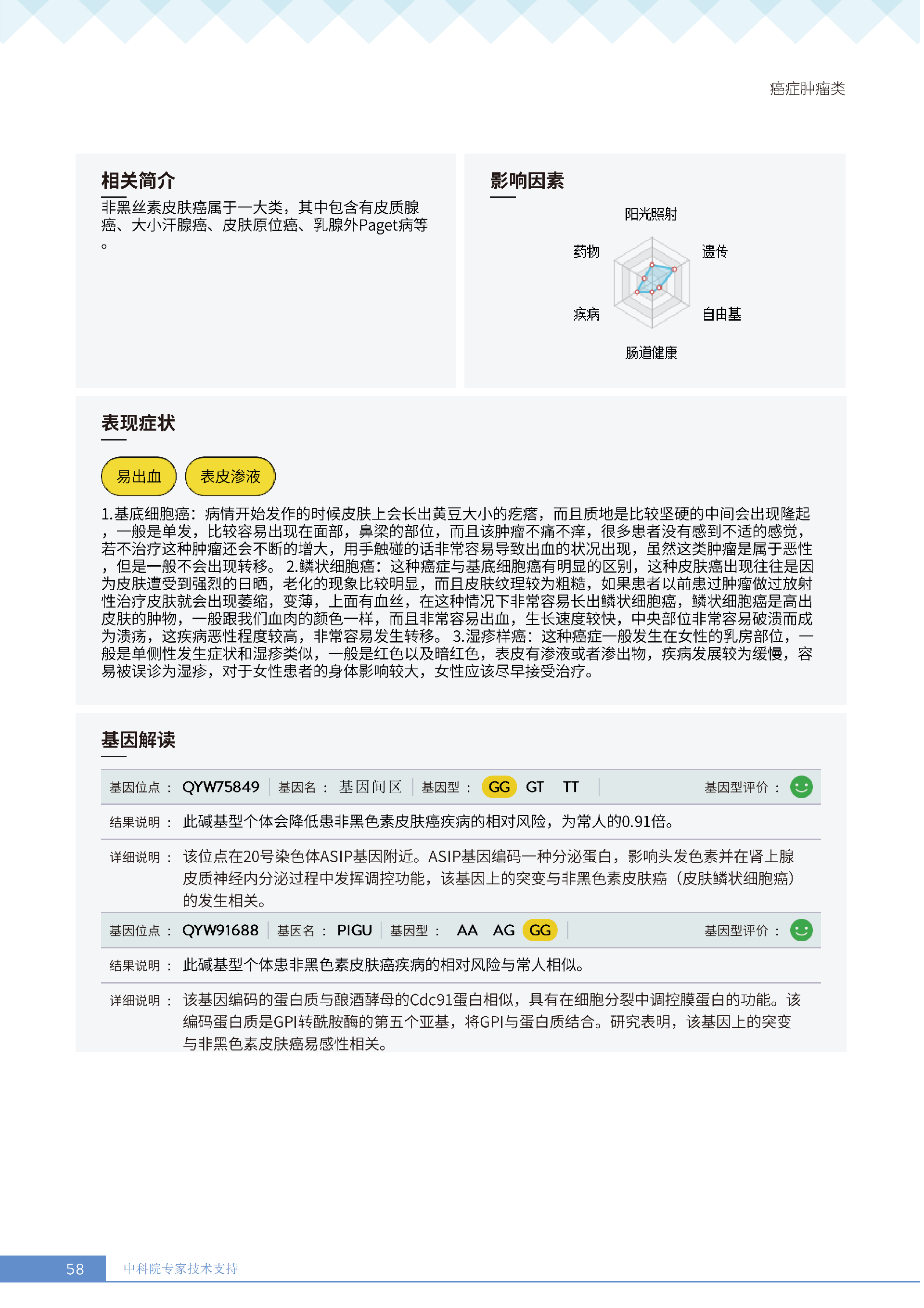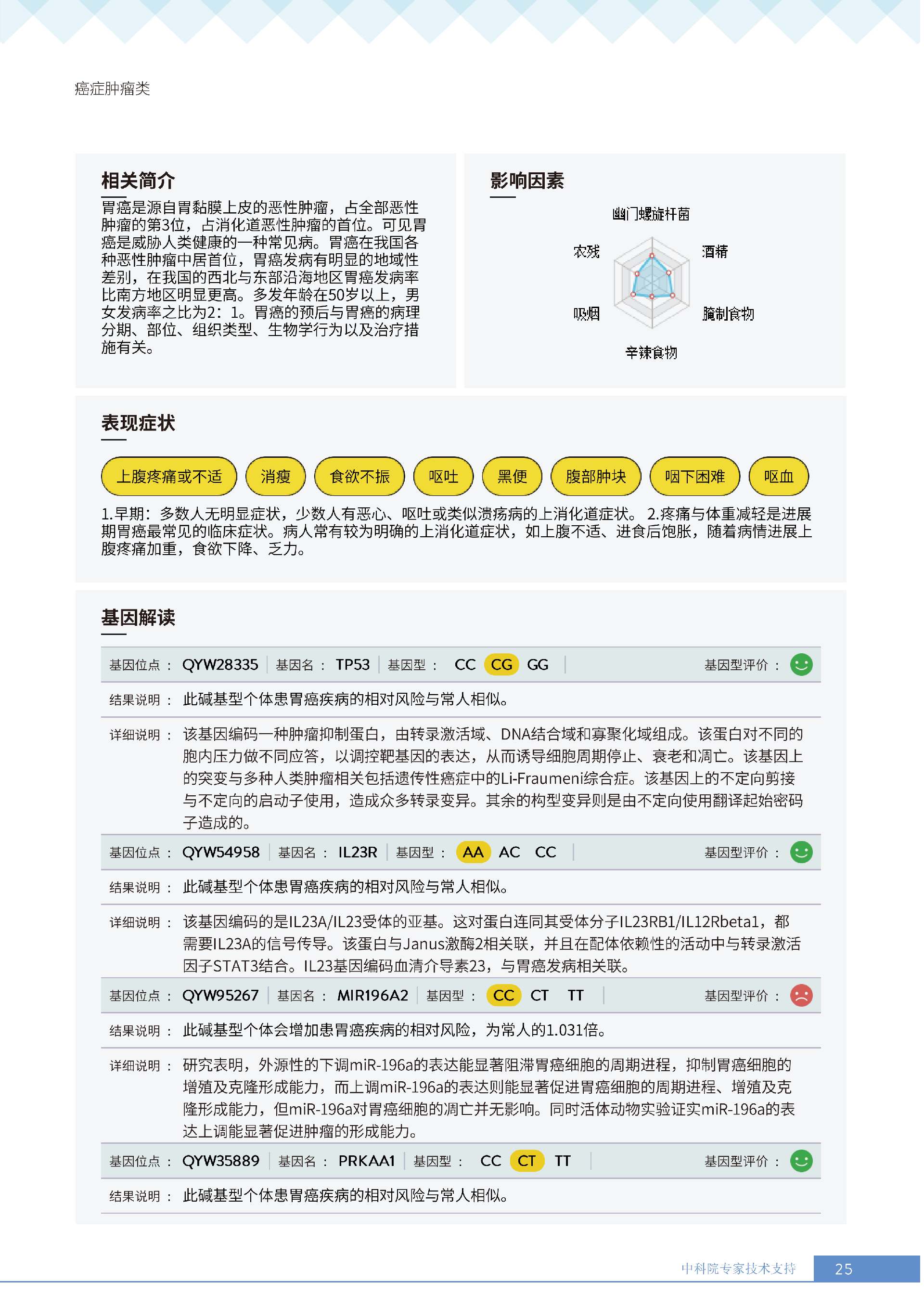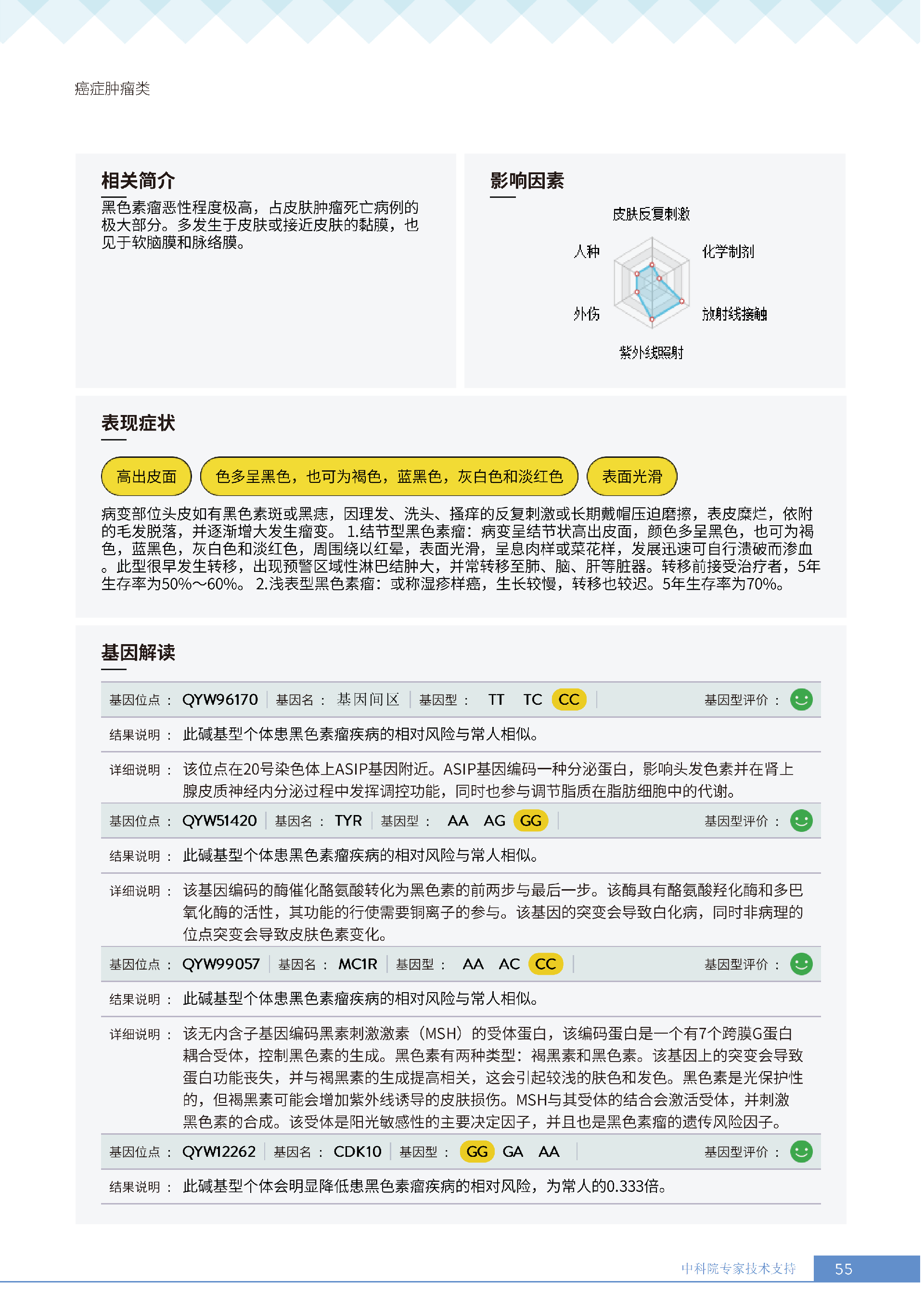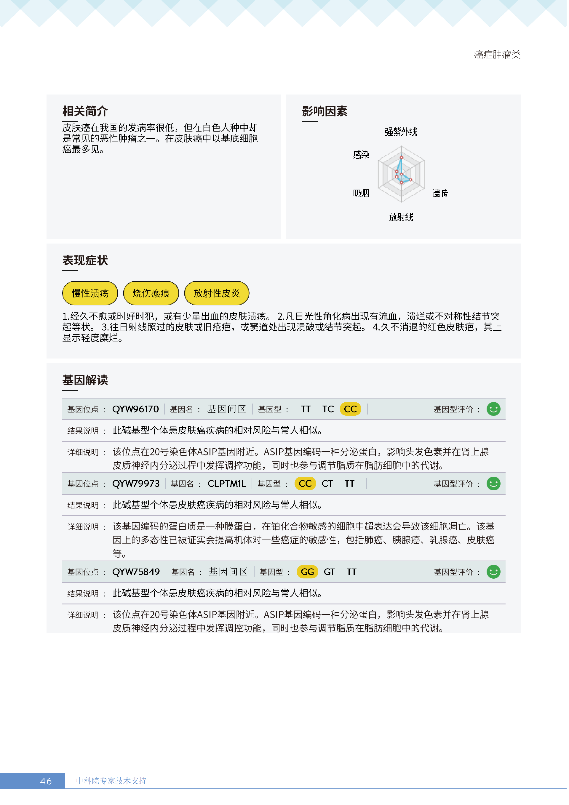 更重要的是,癌症筛查能精准适配个体差异,避免 “一刀切” 的盲目预防。有人像王女士一样,抗黑色素瘤能力强(88.61% 人群同水平),筛查能帮她明确 “无需过度焦虑此项”,可将精力放在薄弱项上;有人可能抗肺癌能力弱,筛查则会提示避免空气污染、定期做肺部 CT—— 它不是让所有人都陷入 “恐癌焦虑”,而是基于每个人的基因、年龄、生活环境等,画出 “个性化风险地图”,让预防有重点、干预有方向。