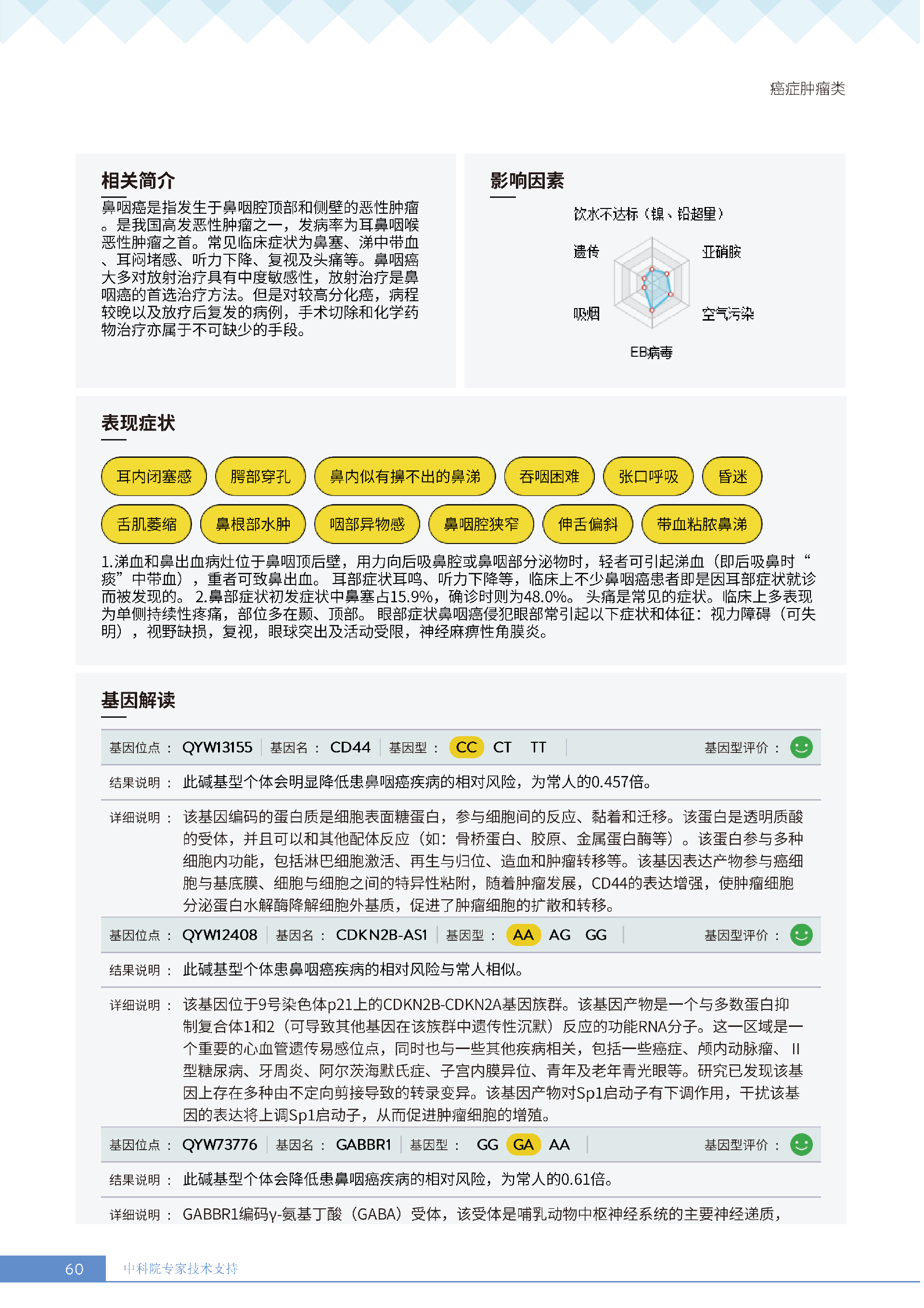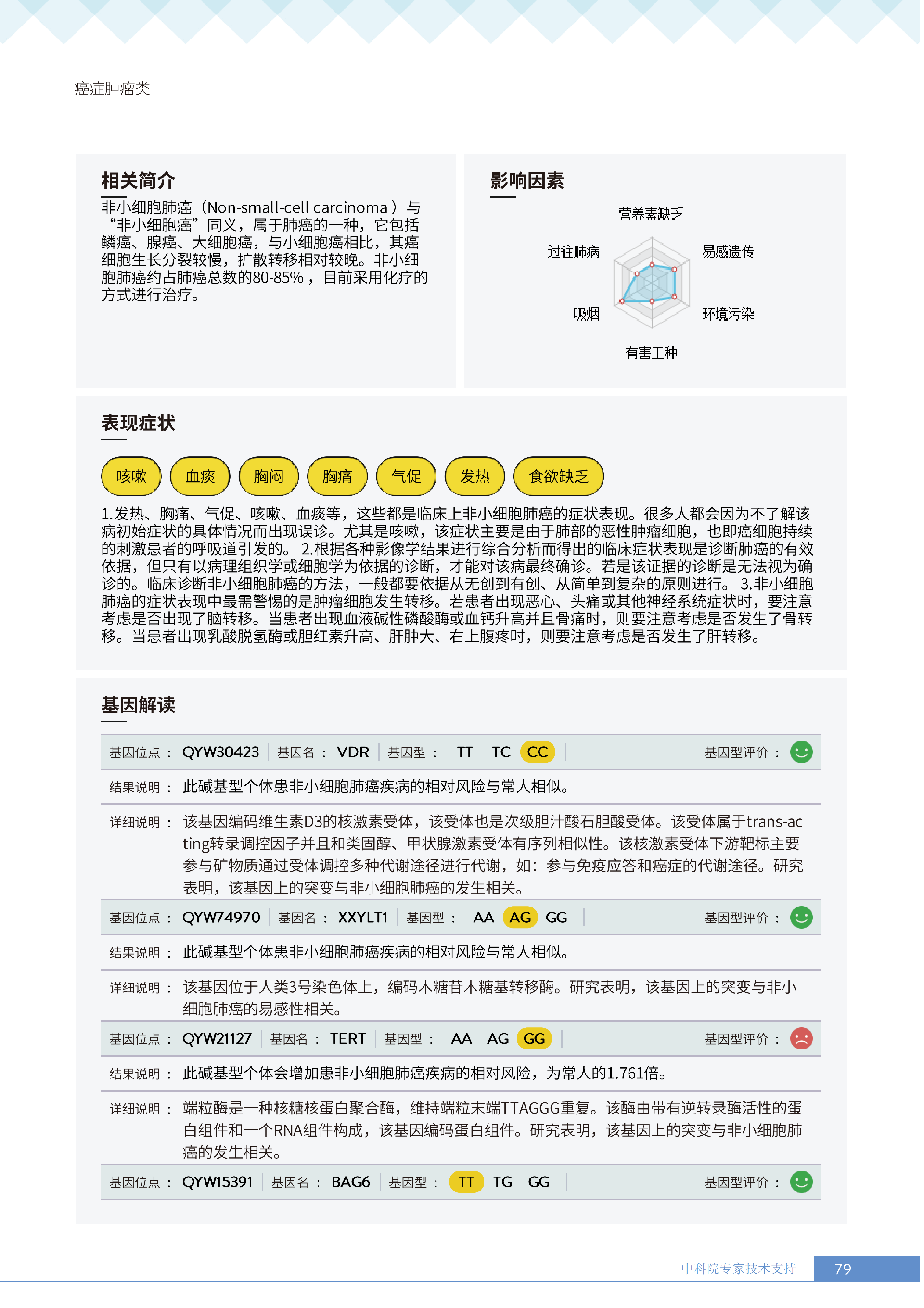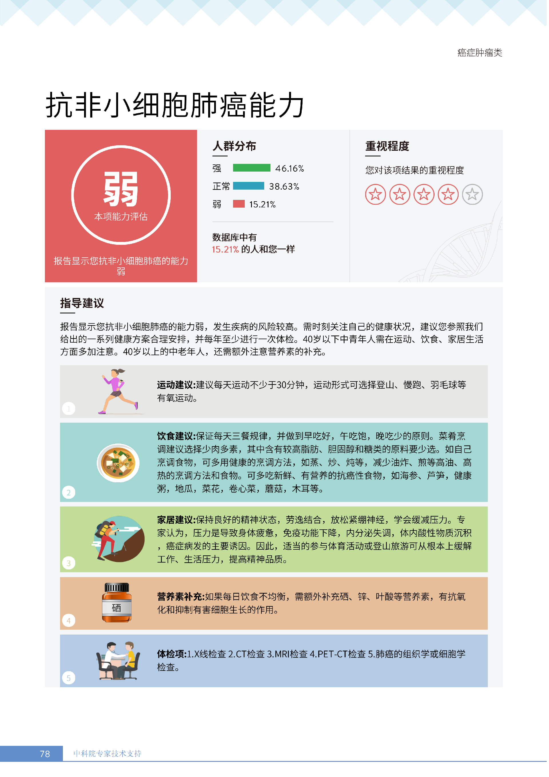 更何况,癌症的发展是 “量变到质变” 的过程:从细胞异常增生到形成可见肿瘤,往往需要数年甚至更久。筛查的价值,就在于抓住这个 “窗口期”—— 比如报告中针对抗非小细胞肺癌能力弱的建议,从避免重污染环境到补充硒元素,这些早期干预措施,能大幅降低风险转化为实际疾病的概率。若等癌细胞扩散再治疗,不仅治疗难度陡增,身体承受的痛苦、家庭付出的成本都会成倍增加。