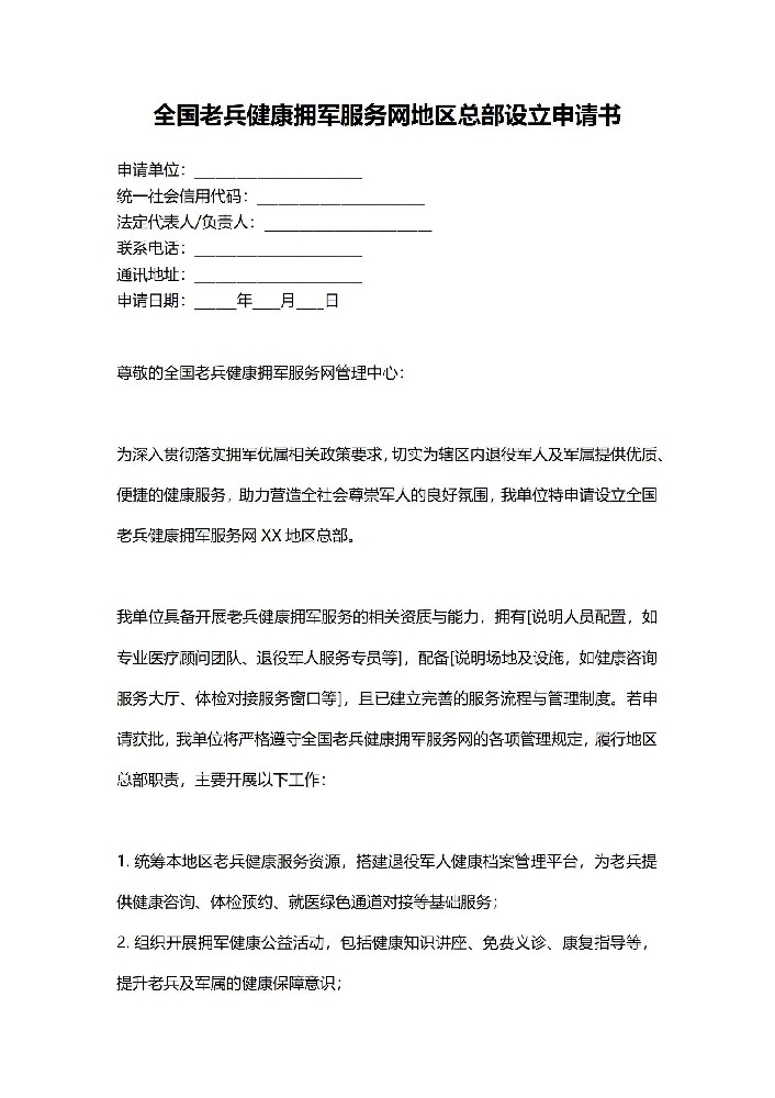全国老兵健康拥军服务网地区总部设立申请书